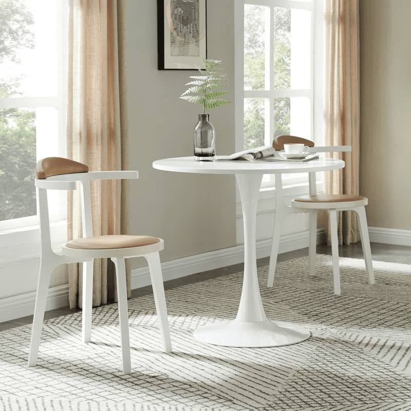 Transform your dining area with this sleek, modern round dining table, perfect for contemporary homes, small apartments, or kitchen nooks. Featuring a stylish white tabletop and a sturdy pedestal base, this table is not only a great space-saving solution for your home but also an excellent choice for commercial settings such as bistros, small cafés, and cozy coffee shops. Its compact 31.5-inch size provides ample seating without overwhelming the room, making it ideal for both residential and light commercial use. The easy-to-clean surface is designed to withstand daily use, whether you’re enjoying a family meal, hosting a small gathering, or welcoming guests in your bistro or café. Elevate your décor with this versatile and functional dining table that blends seamlessly into any setting.