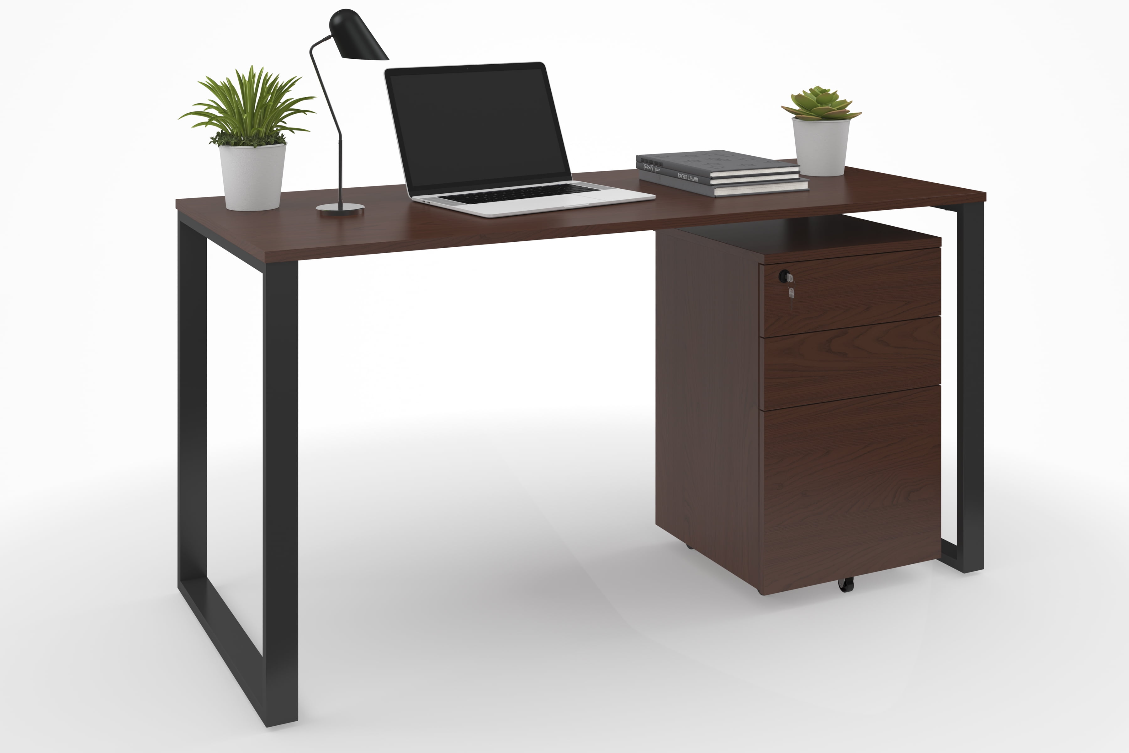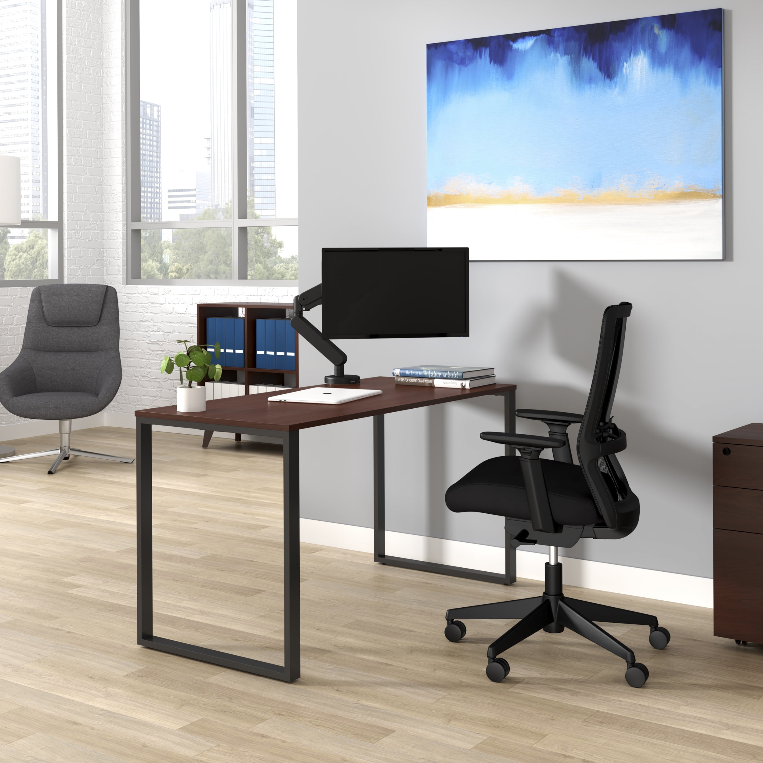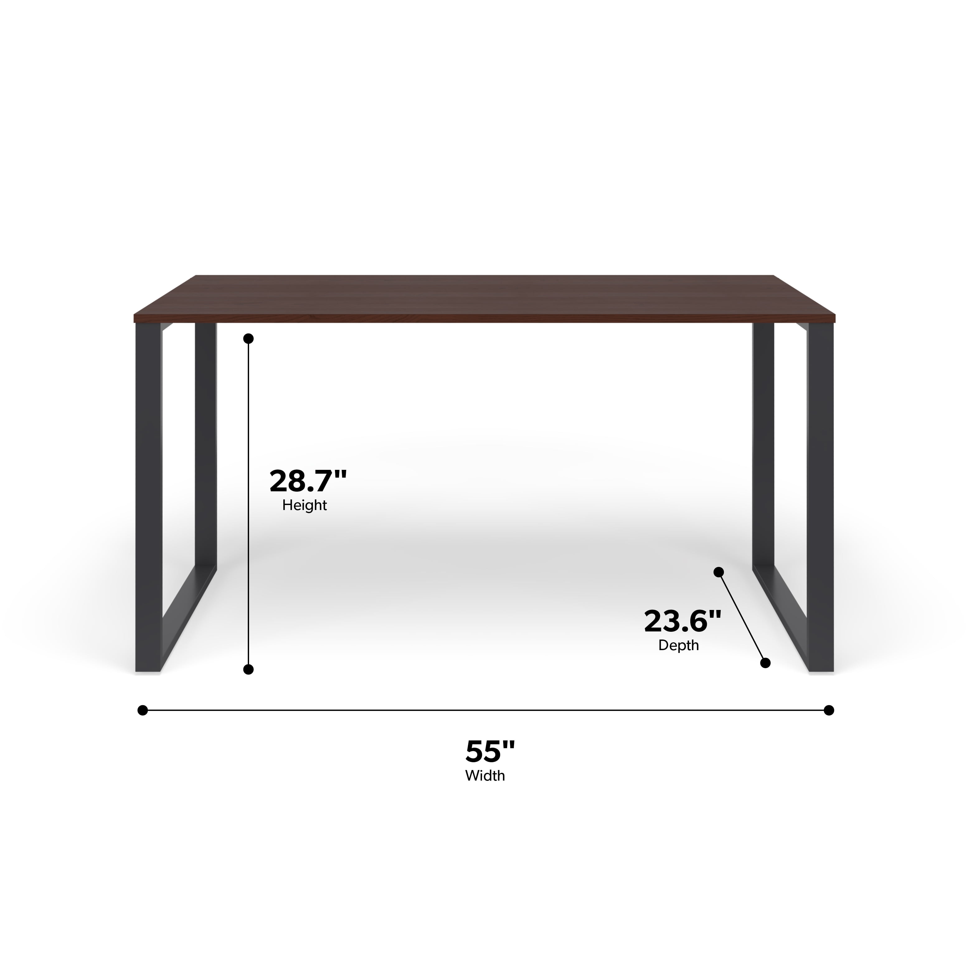 Whether you’re at the office or at home, this commercial-grade metal computer desk stands up to heavy use with its durability and reliability This versatile, modern, executive computer desk combines a metal frame and legs, with a laminate covered wooden top, for a modern, clean-lined design addition to the office or at home Easily assemble this modern executive desk by fixing the top, legs, and threaded inserts to the frame, so that you can get to work fast Each metal leg of this simple office desk conveniently ships as one-piece, which simplifies the assembly process At 55″ wide, all users will appreciate this metal office desk’s generous legroom that lets you spread out for all-day comfort At just under 24″ in depth, there’s plenty of room for your laptop and computer monitors on this modern executive office furniture piece As one of the best office desks around, it features a ¾” thick top with a scratch, spill, water, and stain-resistant surface The laminate desktop features a woodgrain finish that provides a touch of warmth with a smooth surface and protective edge banding The laminate surface allows for easy cleaning with a damp rag or disinfect with a touch of alcohol The built-in leveling glides keep this modern desk wobble-free and firmly in-place on uneven floors with screw threaded feet that adjust up or down easily This executive work desk will pair well with HON Basyx pedestals because they feature the same colors and finishes This minimalist office desk’s dimensions are 55.12″ W x 23.62″ D x 28.74″ H This durable, multipurpose large office desk supports up to 150 lb and is backed by the HON Basyx Limited 5-Year Warranty
