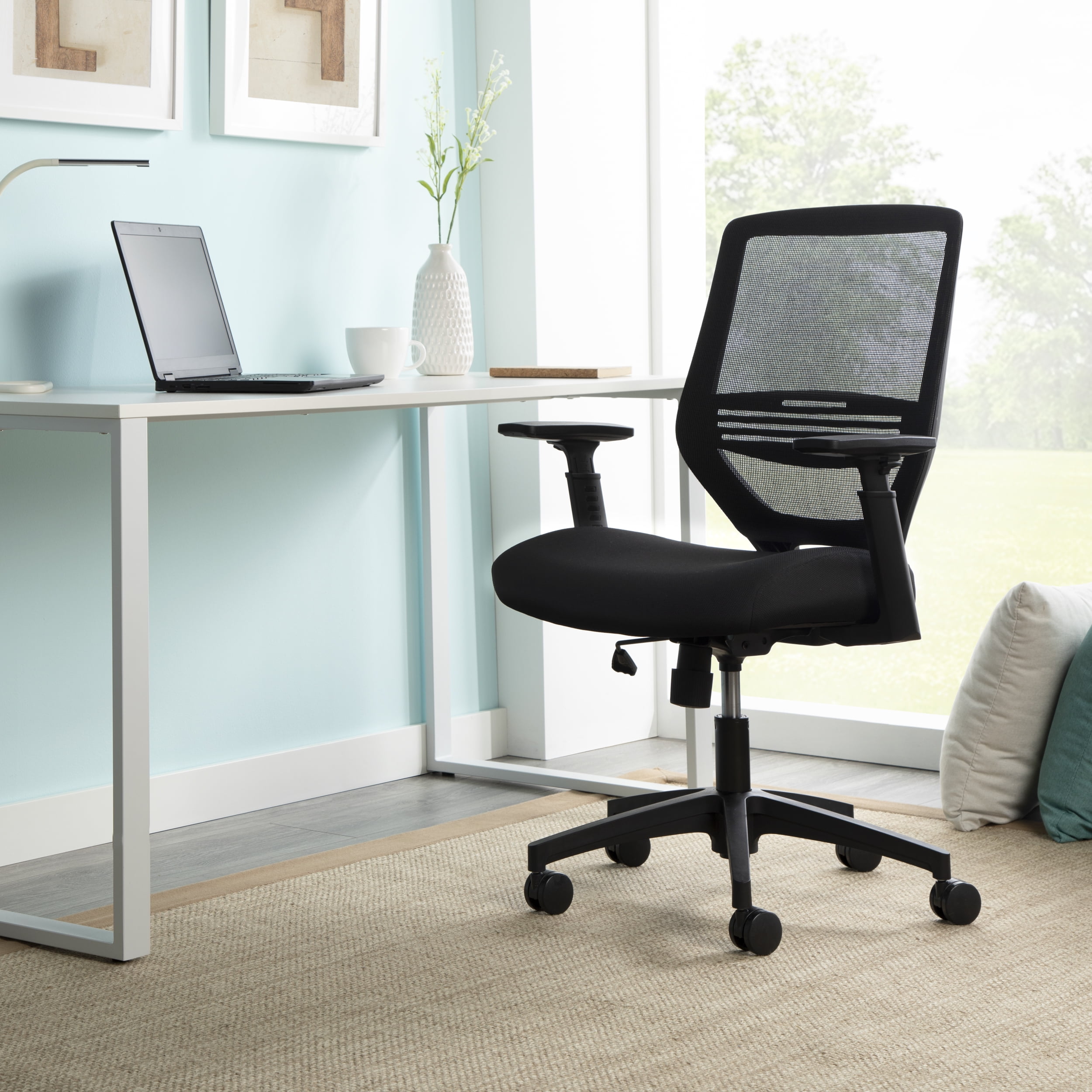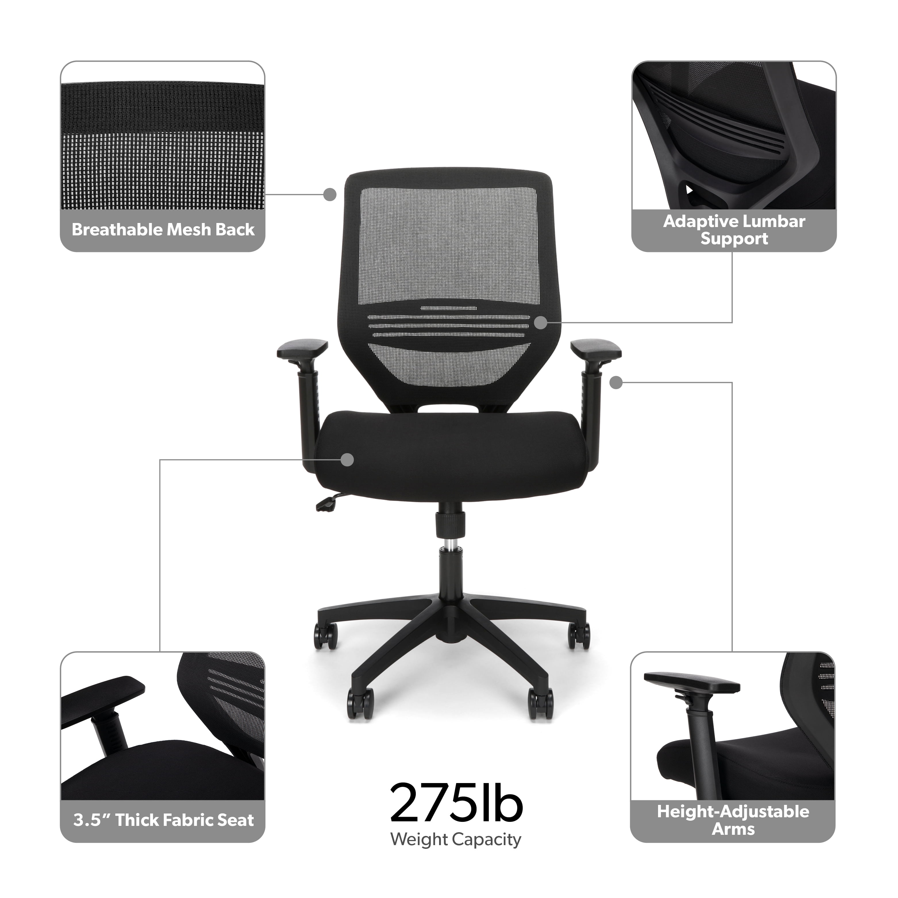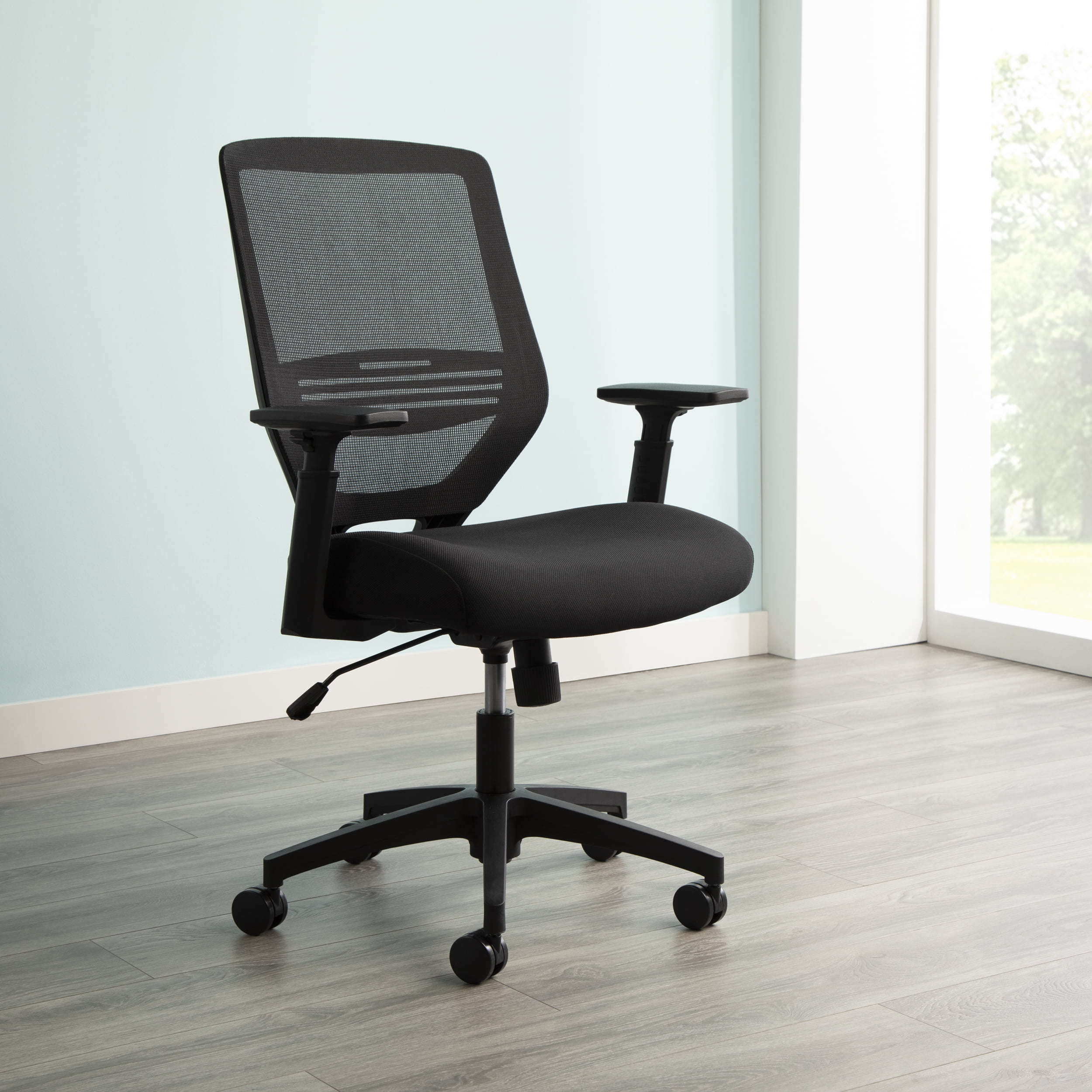 The perfect go-to chair for workdays that don’t break the back, or bank, the HON Basyx Expose Commercial-Grade Mesh Back Desk Chair promotes air circulation for a comfortable sit in any climate. The plush fabric seat is 3.5″ thick to provide support for all-day comfort. This computer chair’s arms can be easily customized with the height-adjustable functionality. Adaptable lumbar support adjusts up and down for personalized comfort when needed. This computer chair can be easily assembled within 20 minutes, so you can get to work quickly. Ergonomic features like center tilt, tilt tensioner, and pneumatic height adjustment allow you to call the shots on your chair’s settings. This task chair’s five-star base is molded from reinforced resin, has a 360-degree swivel, and holds users up to 275 lb. Featuring a full BIFMA rating, this office chair is backed by the HON Basyx Limited 5-Year Warranty.