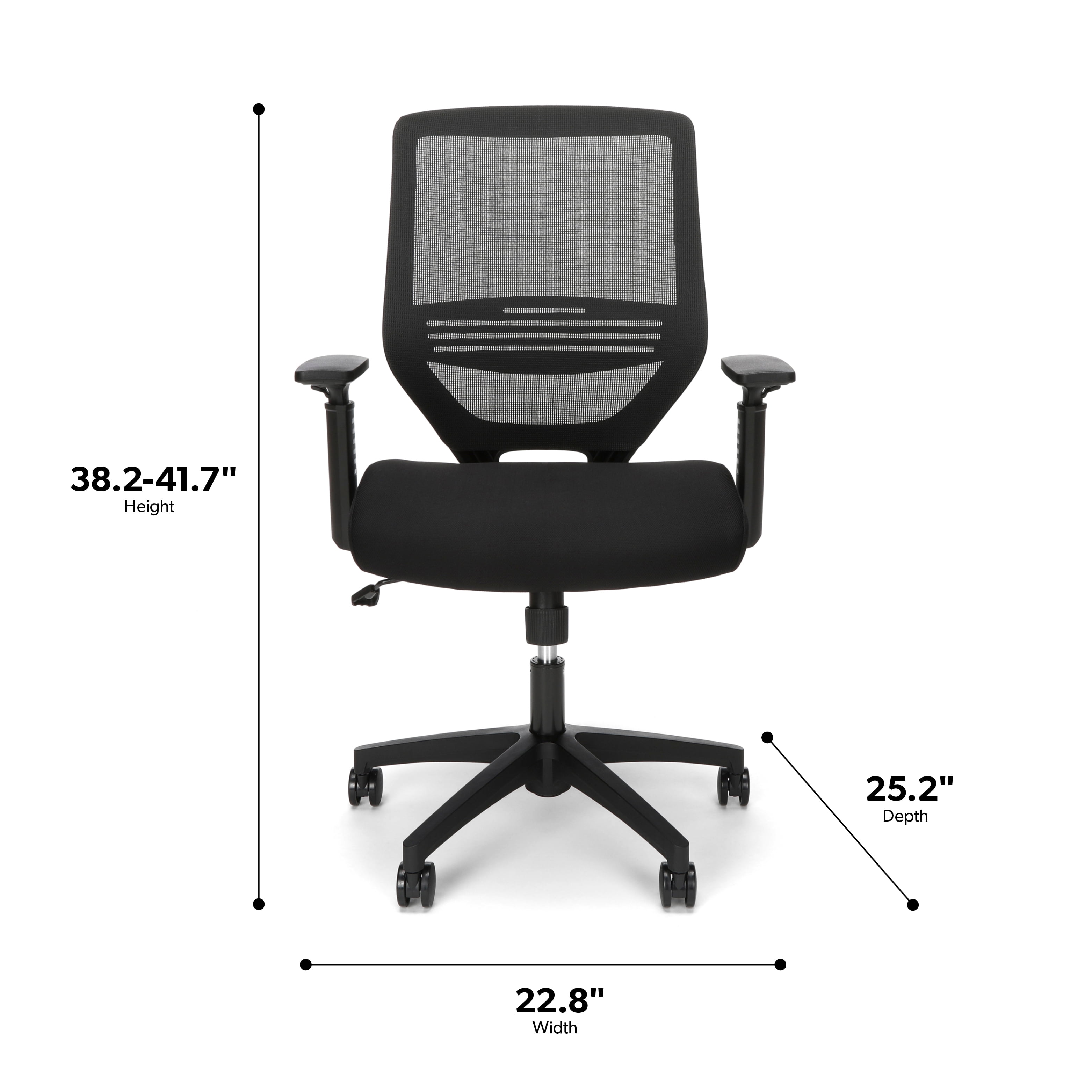 Mesh back promotes air circulation for a comfortable experience in any climate The 3.5″ thick fabric seat is firm and supportive, for all-day comfort Height-adjustable arms provide support and allow for customization of this computer chair Adaptable lumbar support adjusts up and down for personalized comfort This office chair can be easily assembled within 20 minutes Center tilt allows for a comfortable recline/rocking motion that moves the seat and back together in one motion The tilt tensioner works with you and gravity to provide a custom tilt experience that’s neither too fast nor too difficult Pneumatic height adjustment allows you to adjust chair to your ideal height The chair features a five-star base that is molded from reinforced resin, has a 360-degree swivel, and holds users up to 275 lb The 60mm casters are built to withstand your workload whether at home or in the office A full BIFMA rating means that you are investing in a product that meets strict standards for performance This task chair measures 25.2″ D x 22.8″ W x 38.2″ – 41.7″ H and is backed by the HON Basyx Limited 5-Year Warranty