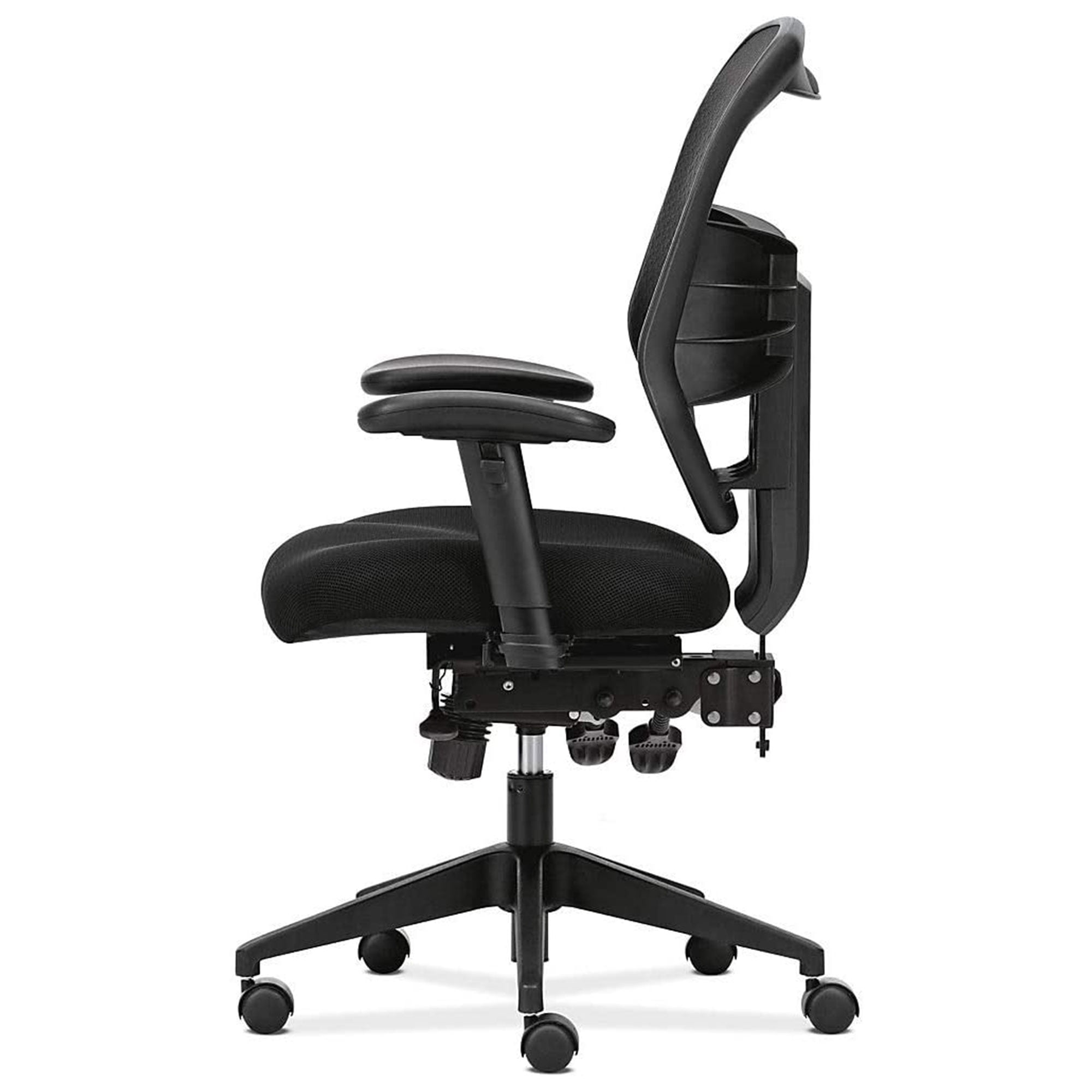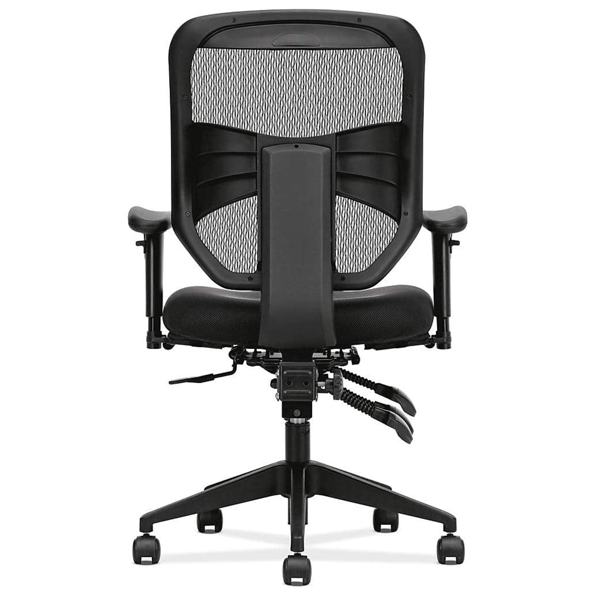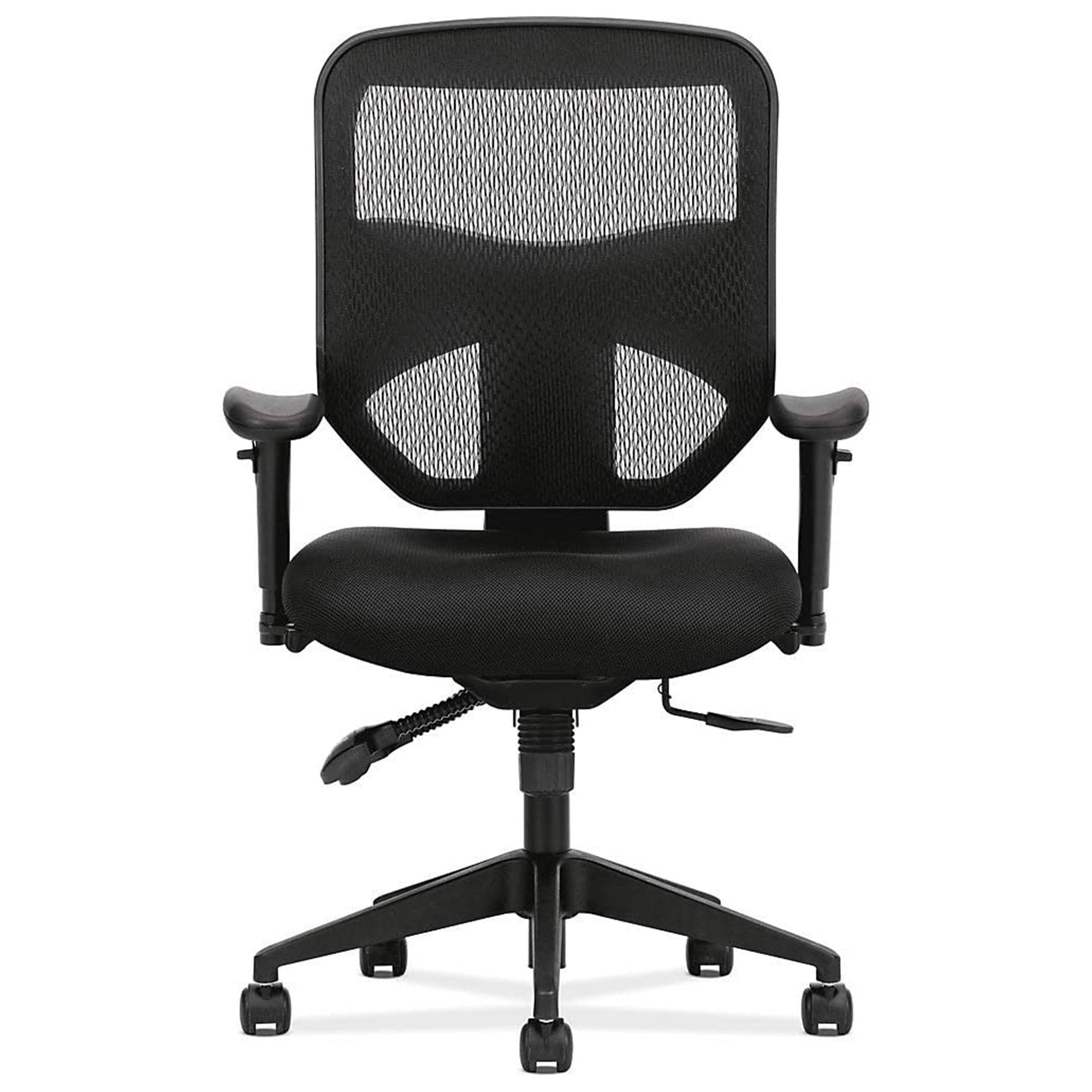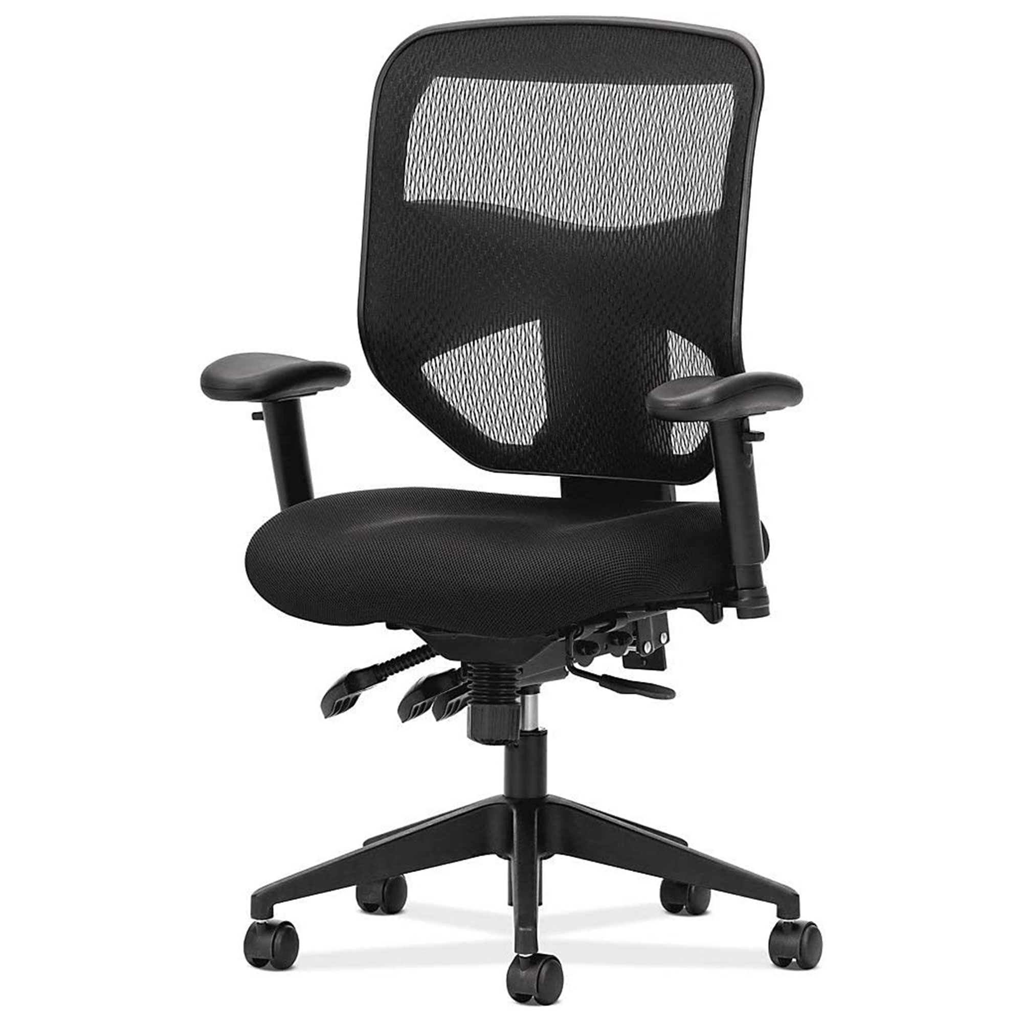 This Hon Prominent Task Chair is engineered for performance and ergonomically sculpted for support Contoured mesh seat cushion includes 2 layers of padding for greater comfort Durable 100-percent polyester seat upholstery with Nano-Tex soil and stain protection guarantees years of use Wheeled 5-star base is molded from reinforced resin for increased durability and easy maneuverability Chair features adjustable armrests by height and width, smooth reclining back, and pneumatic height adjustment Material: Resin, polyester, foam Color: Black Dimensions (L x W x H): 26 x 30.75 x 44.5 inches Weight: 44.3 pounds Manufacturer warranty: 2-year warranty