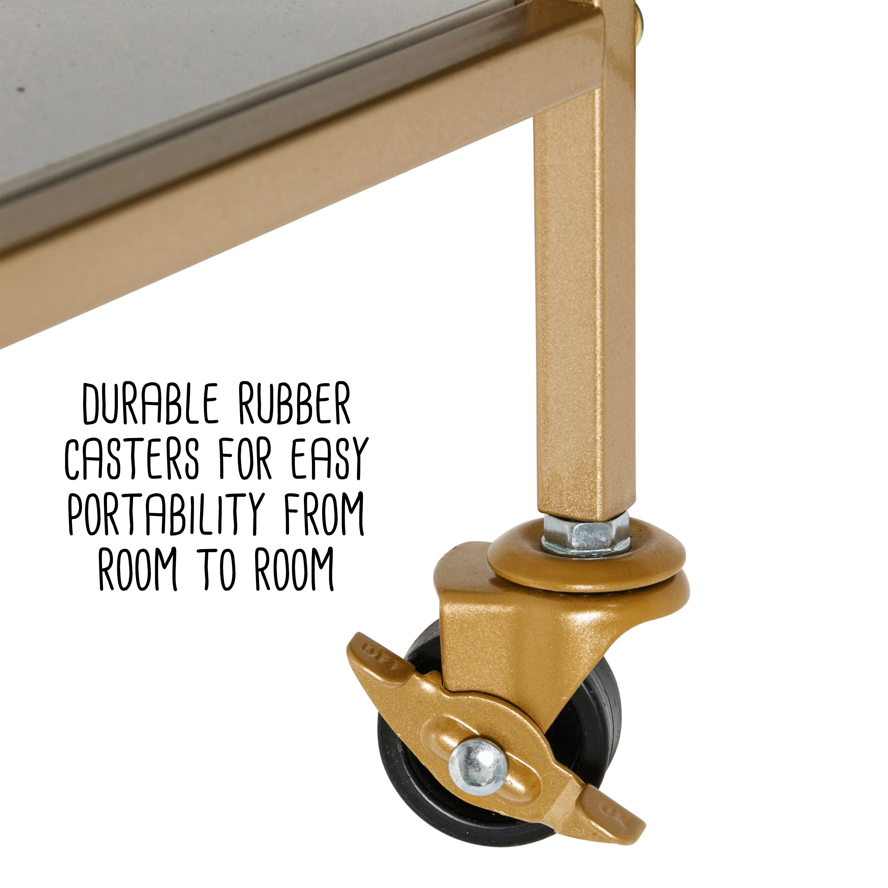 Three 24×13-inch shelves for bar storage Side rails on top and bottom shelves keep spirits and accessories in place Three slots specifically designed for wine/champagne bottle storage Durable rubber casters (2 that lock) for easy portability from room to room Handle helps maneuver the cart around the room Weight capacity is 75-lbs for the whole cart, 25-lbs per shelf Dimensions: 24.8″ W x 13″ D x 35″ H Honey-Can-Do
