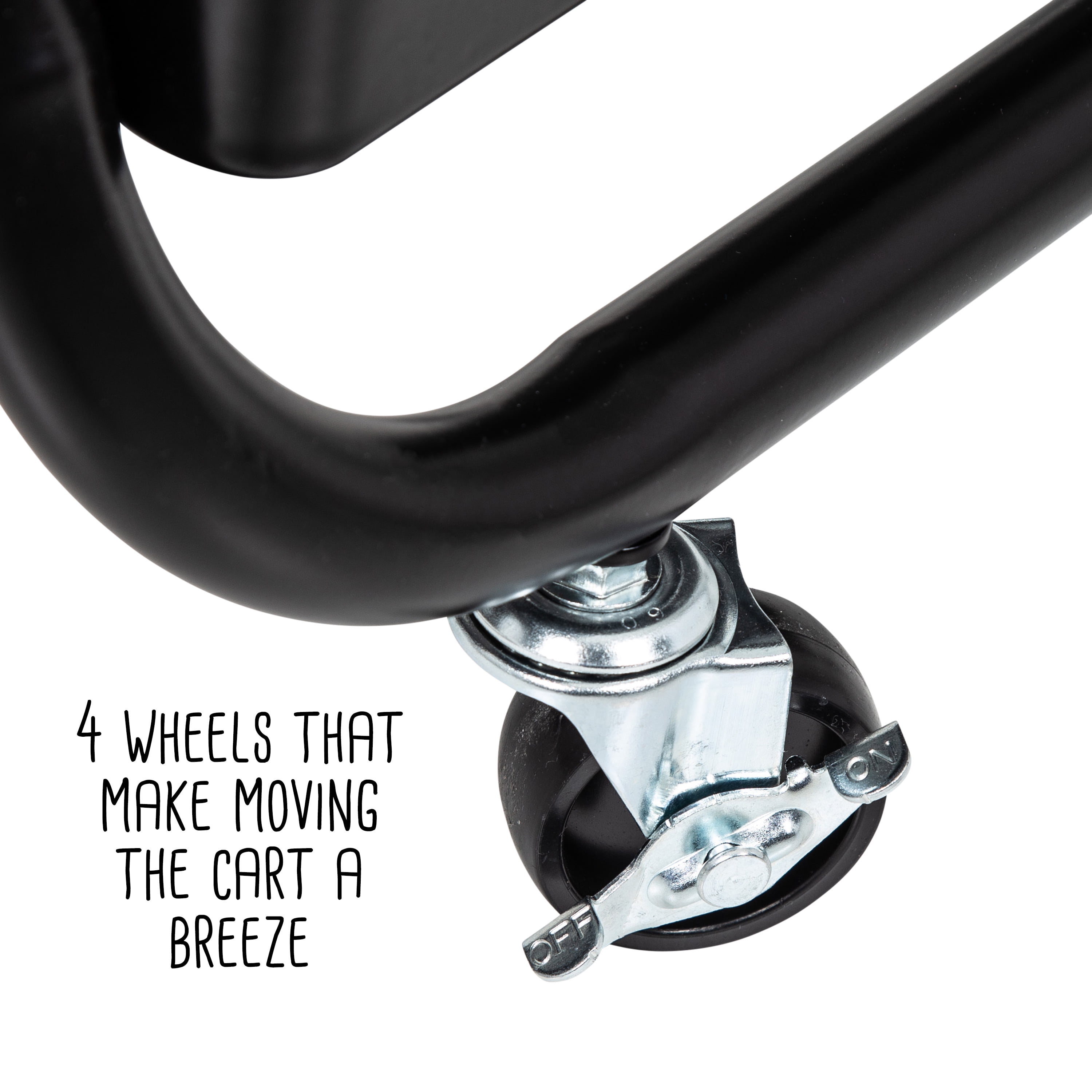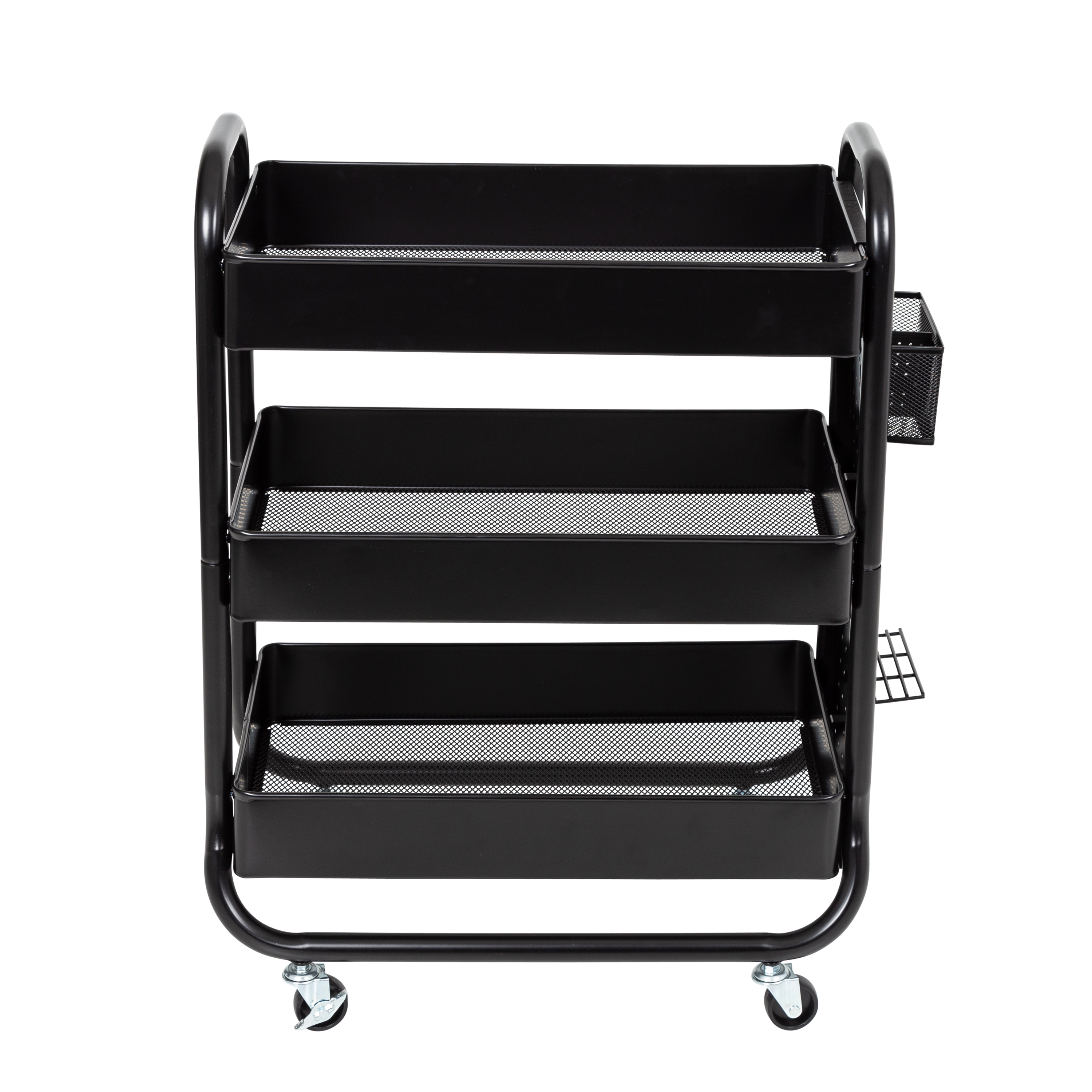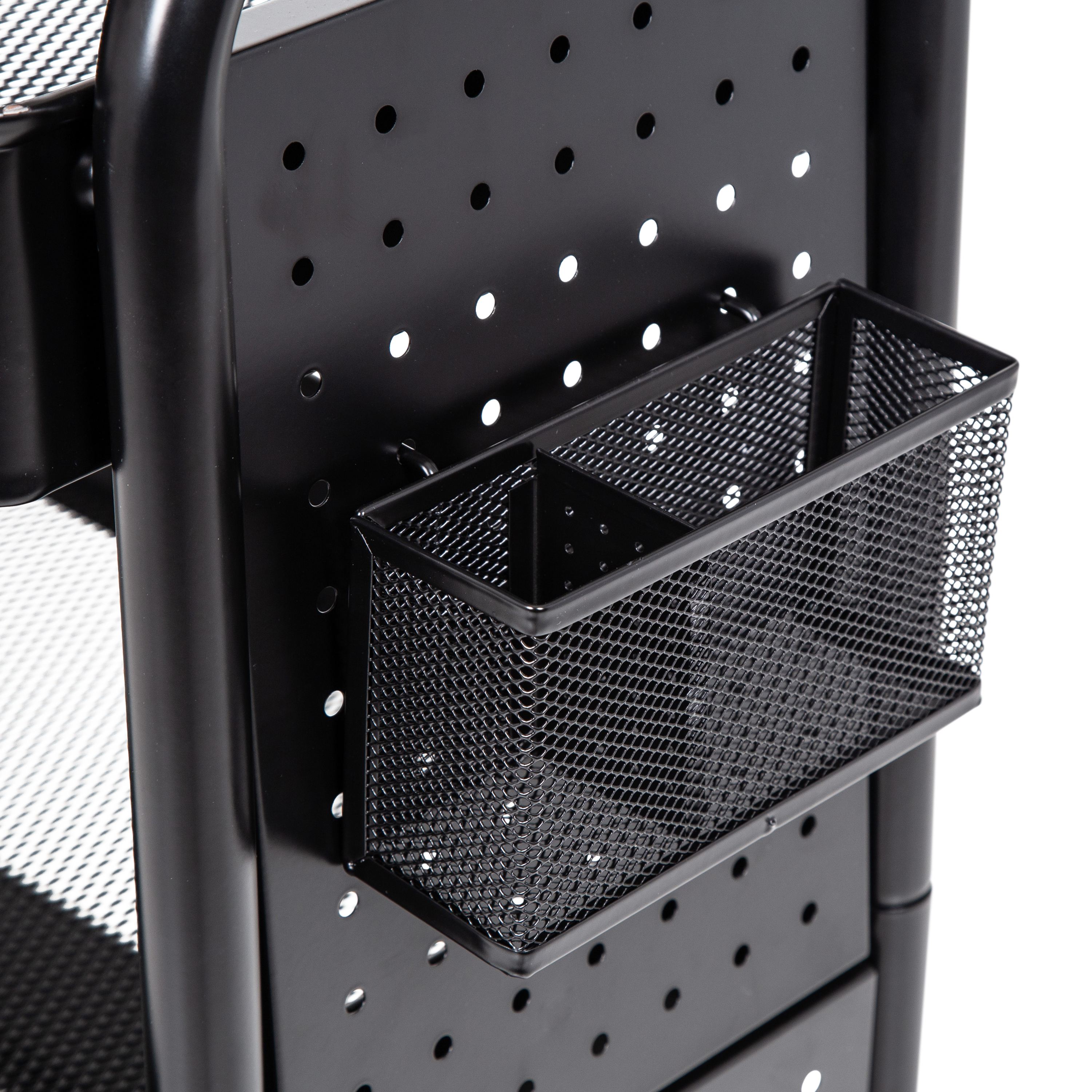 Black metal storage cart with wheels and pegboard 3 tray shelves organize while allowing you to see exactly what you have on hand; lipped edges prevent items from sliding off Customizable steel pegboard comes with accessories (1 shelf, 1 basket, and 1 S-hook) to craft your ideal setup Pegboard basket is a dream for keeping everything from paintbrushes to makeup brushes accessible 4 wheels that make moving the cart a breeze Makes an excellent craft cart, laundry cart, kitchen cart or home office cart Dimensions: 25.9″ W x 14.6″ D x 31.7″ H Individual Basket Dimensions: 21.75″ W x 12″ D x 3.5″ H Side Shelf Dimensions: 5″ W x 2″ D x 1.5″ H Side Basket Dimensions: 6.13″ W x 2.13″ D x 3.63″ H Peg holes are 1″ apart SKU: CRT-09607