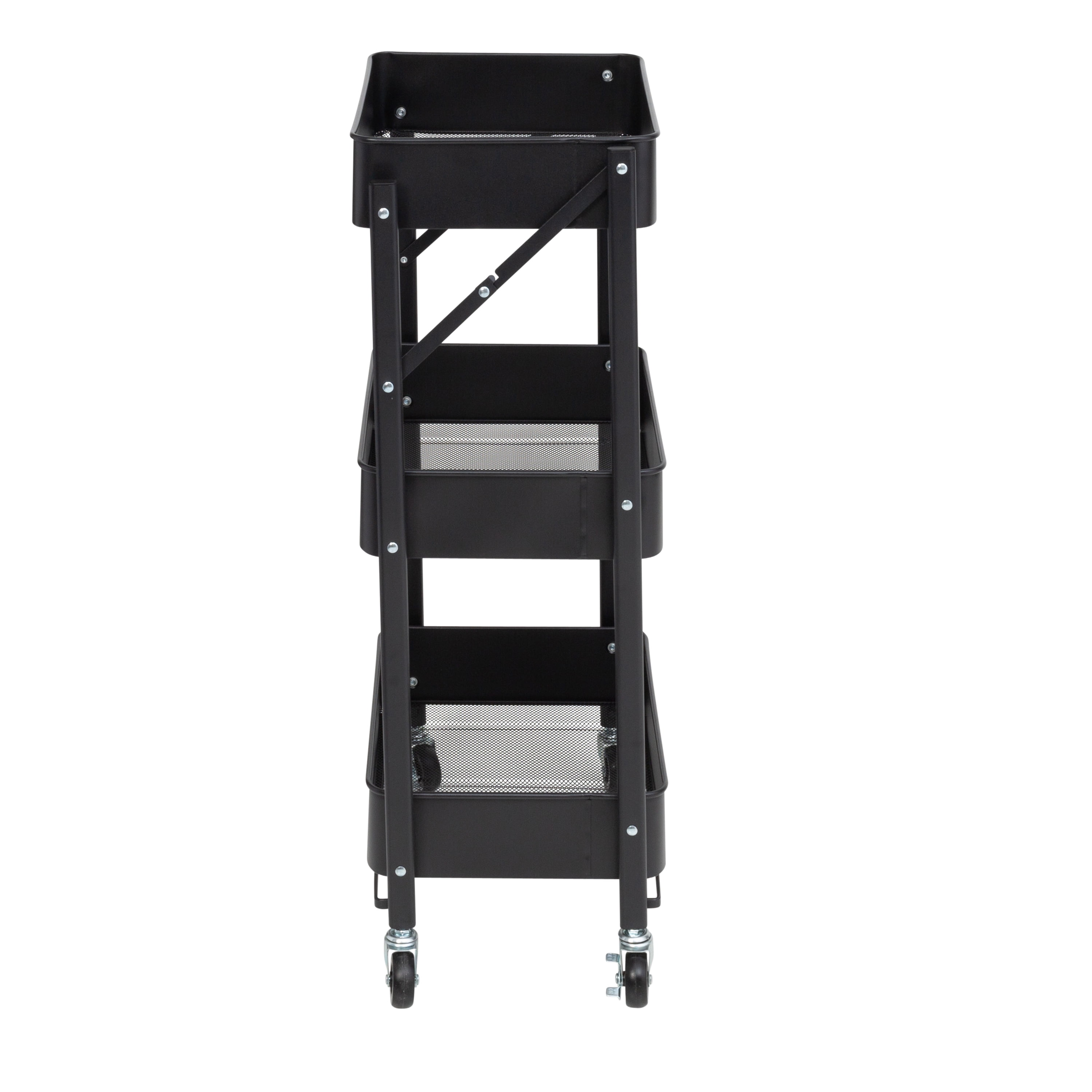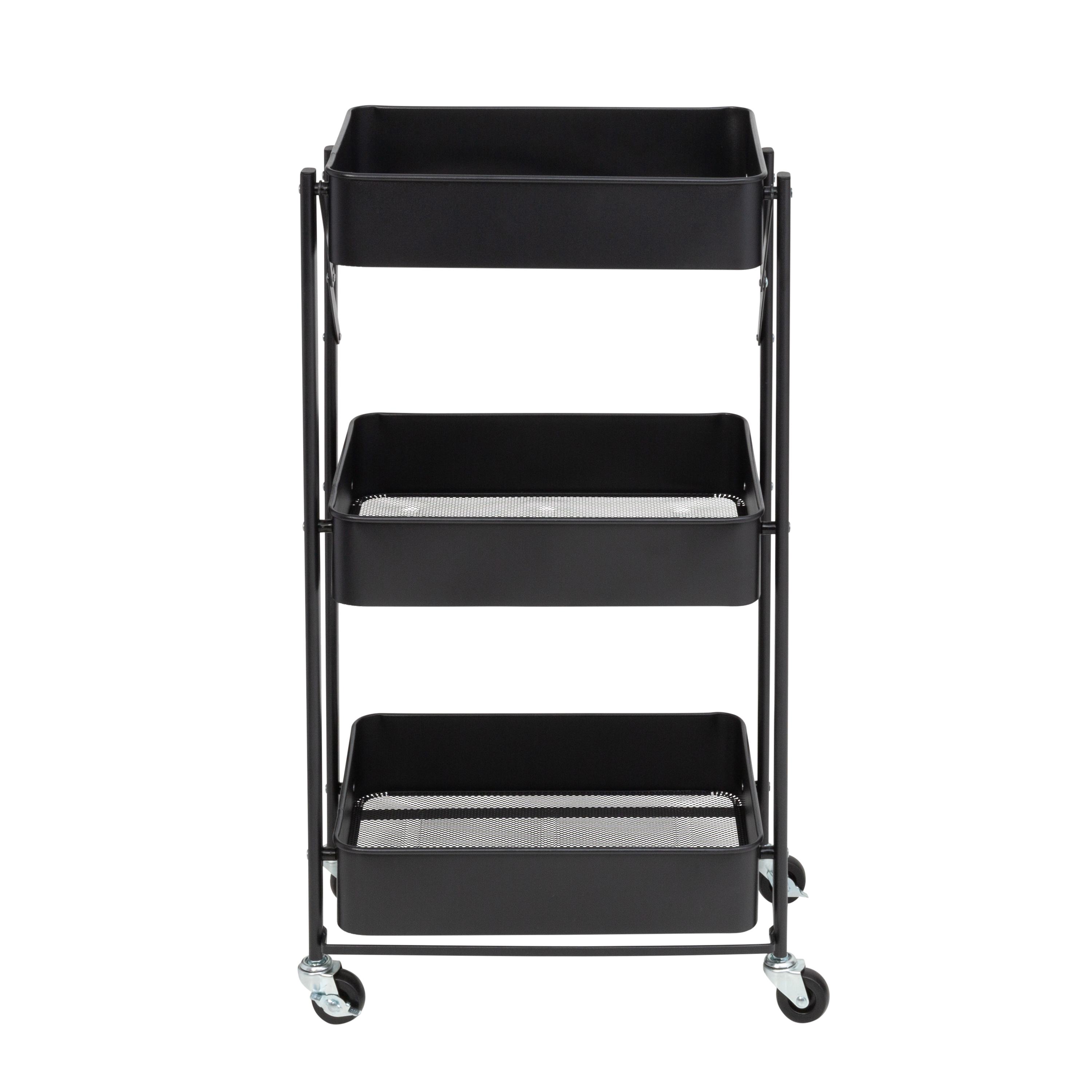 Black metal collapsible storage cart on wheels Folds flat for easy storage Locking caster wheels prevent unwanted movement Metal tray shelves with mesh design keep everything in place when the cart is in motion Right out of the box, it is almost ready to roll with no heavy assembly—just attach the four wheels and pop open Can be used as a utility cart, bar cart, craft cart, laundry cart, kitchen cart, and more. It will organize everywhere from your bathroom to home office Dimensions: 16.9″ W x 11″ D x 31.3″ H Honey-Can-Do CRT-09584