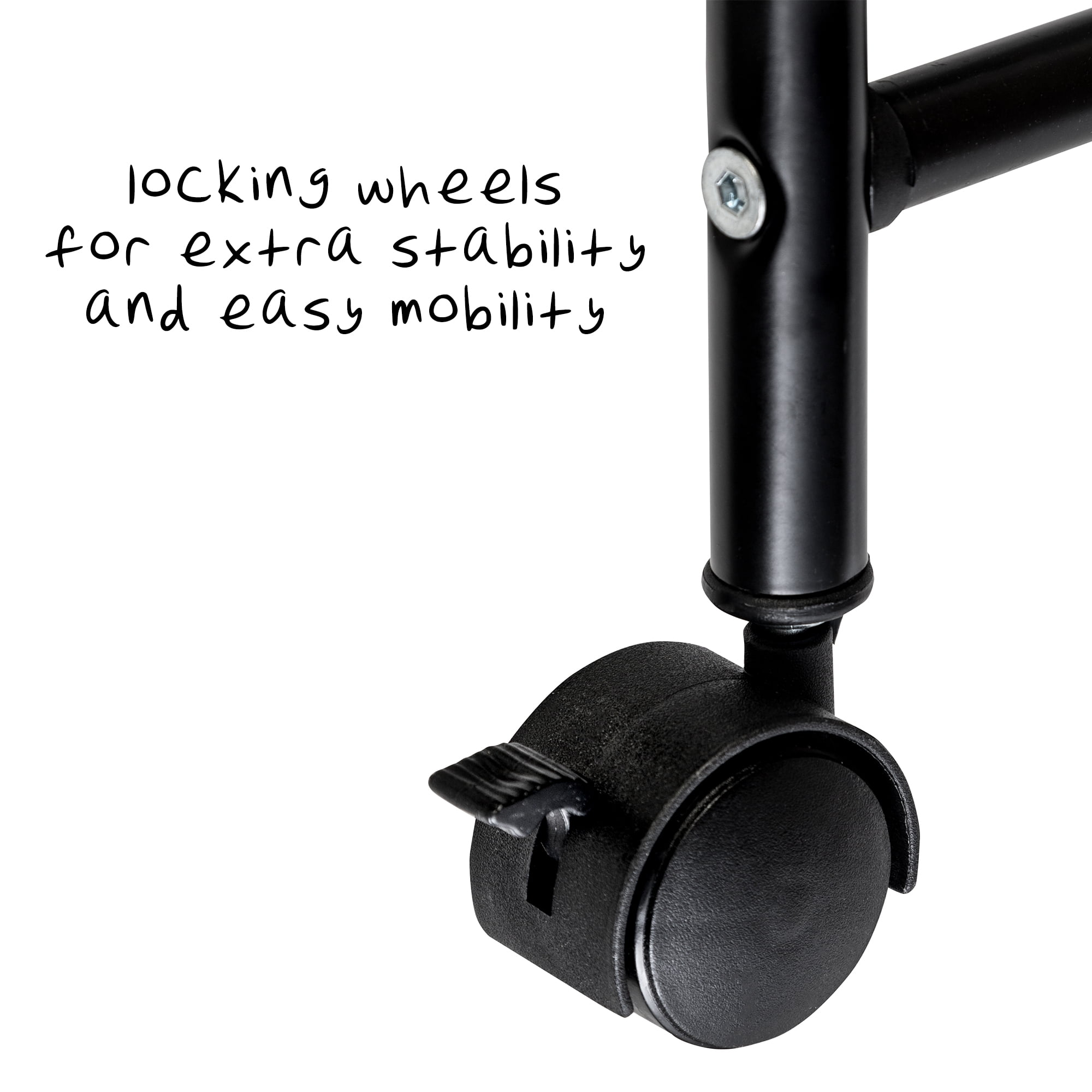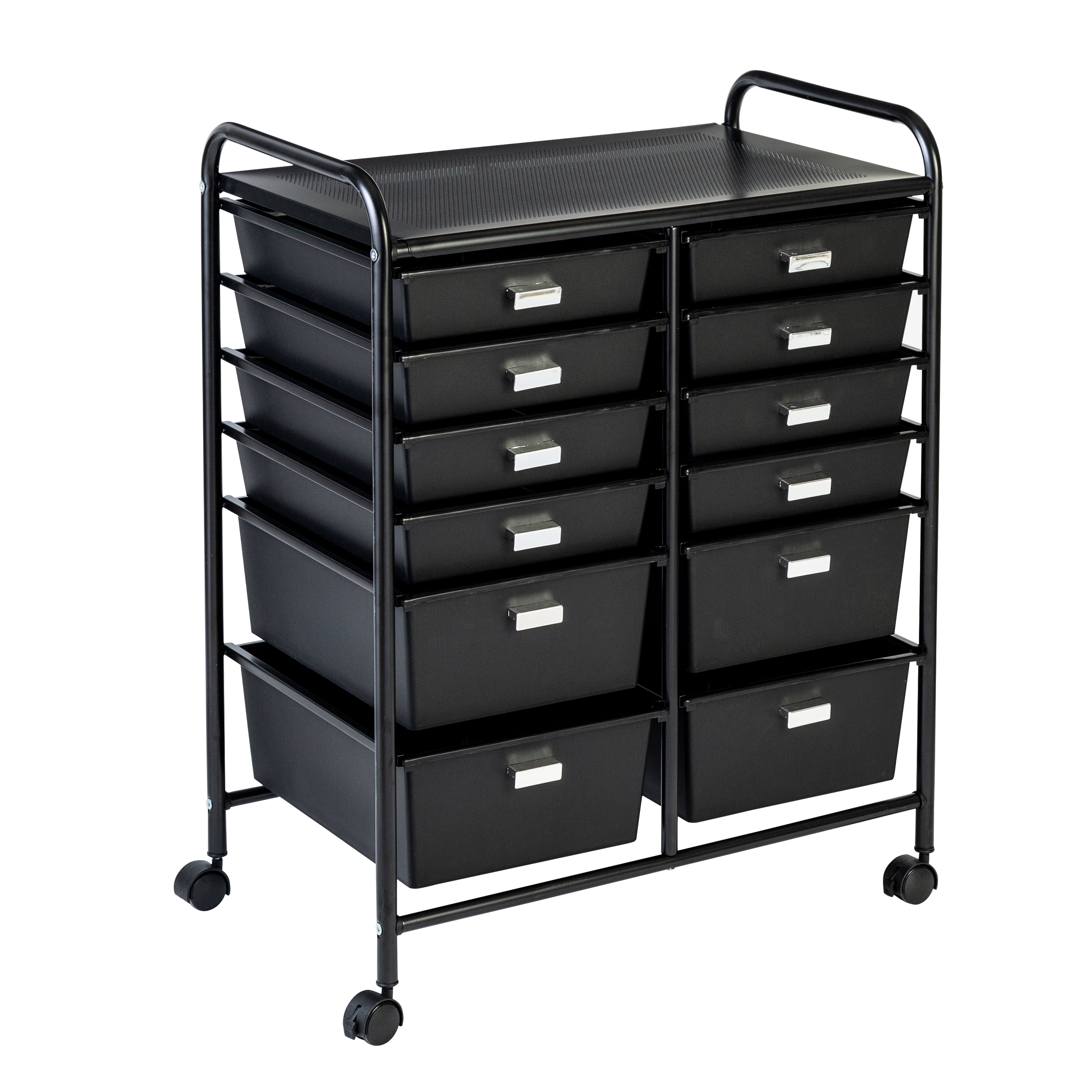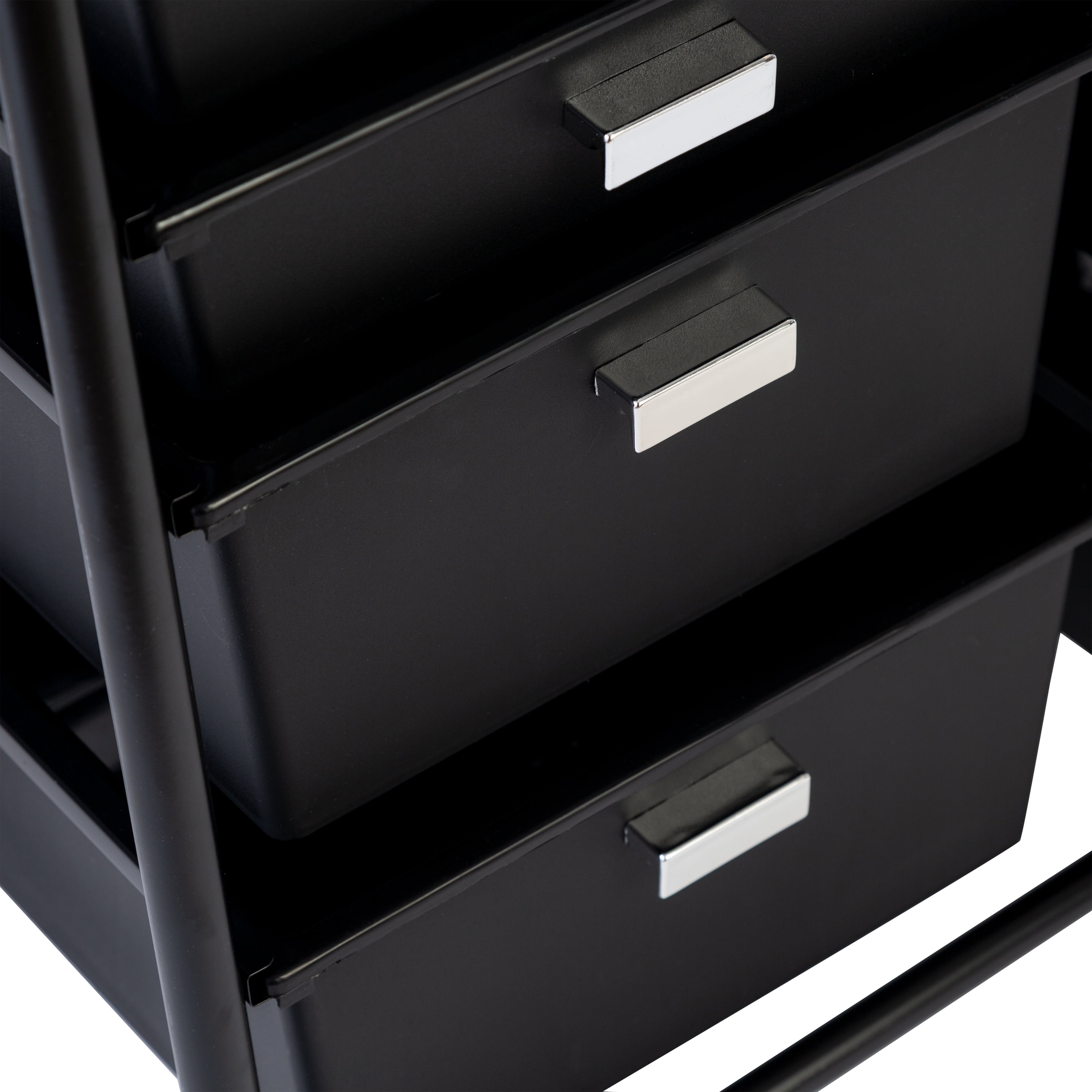 Create a work or study station wherever and whenever you need it Assign drawers to specific supplies or people as your home office needs evolve Polished chrome frame with black plastic drawers of two sizes Locking wheels secure the cart to work on its ample tabletop surface DIY assembly with tools and instructions included Dimensions: 15” L x 25″ W x 32″ H Drawer dimensions: (large) 11″ W x 5.5″ H x 15″ D | (small) 11″ W x 2.75″ H x 15″ D