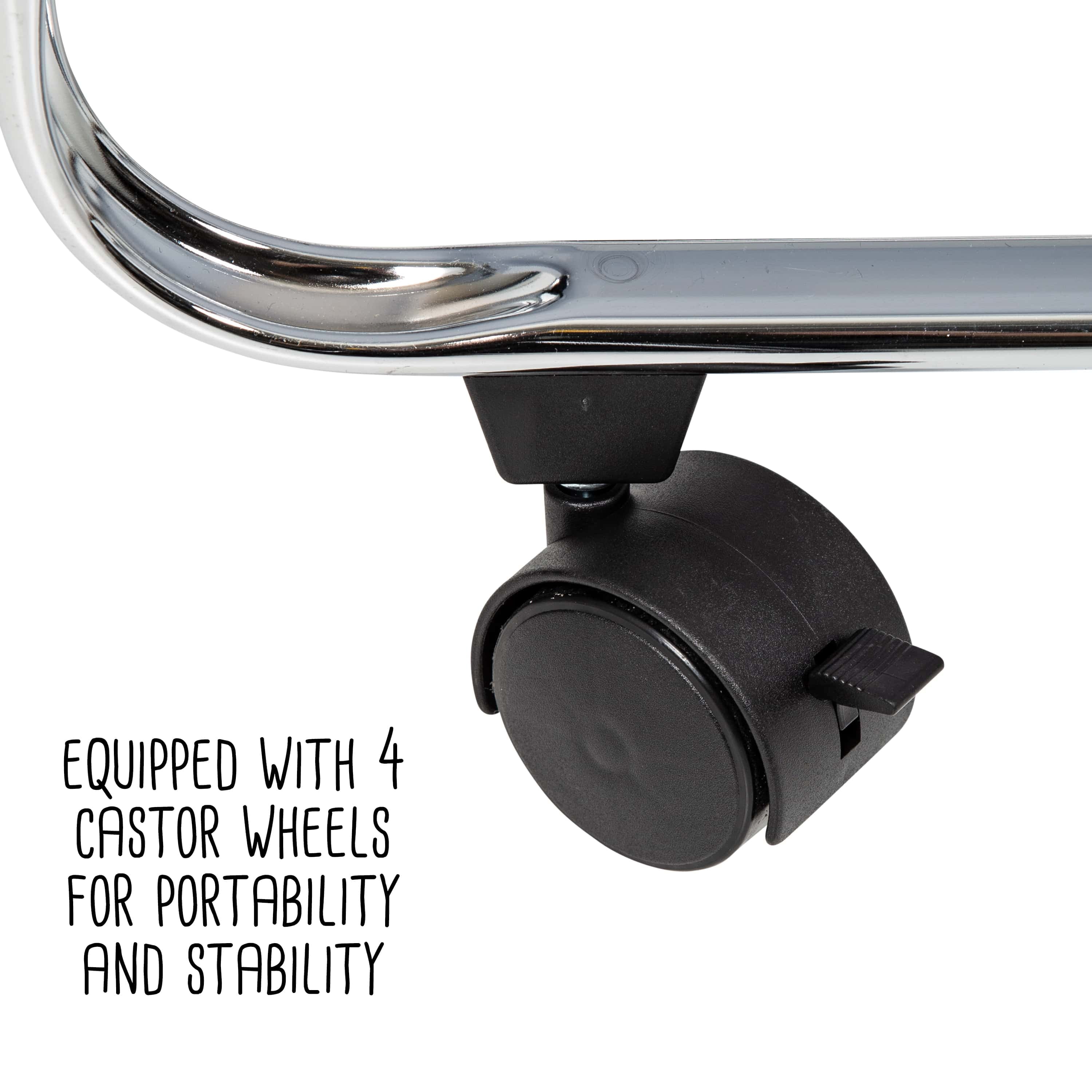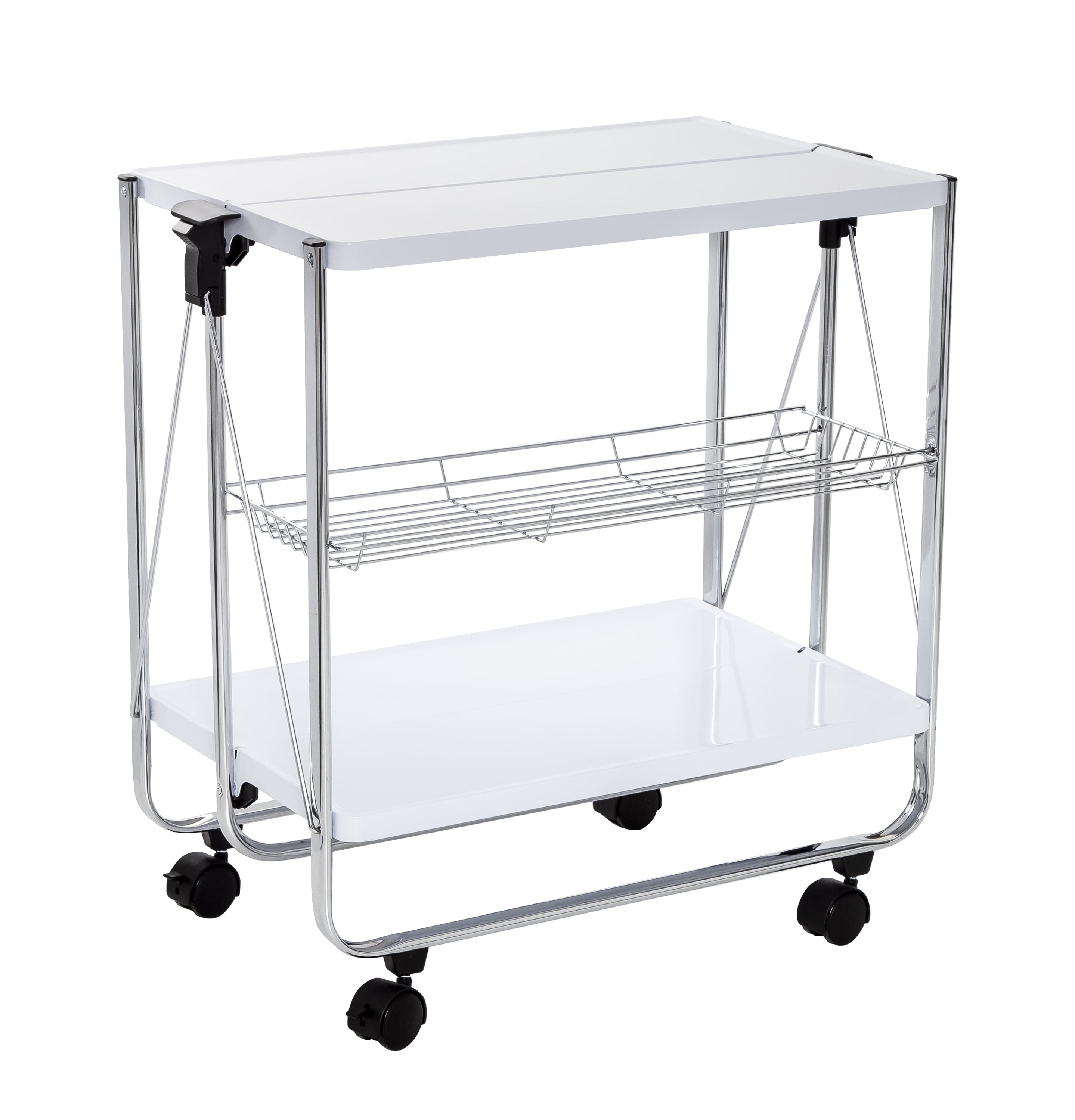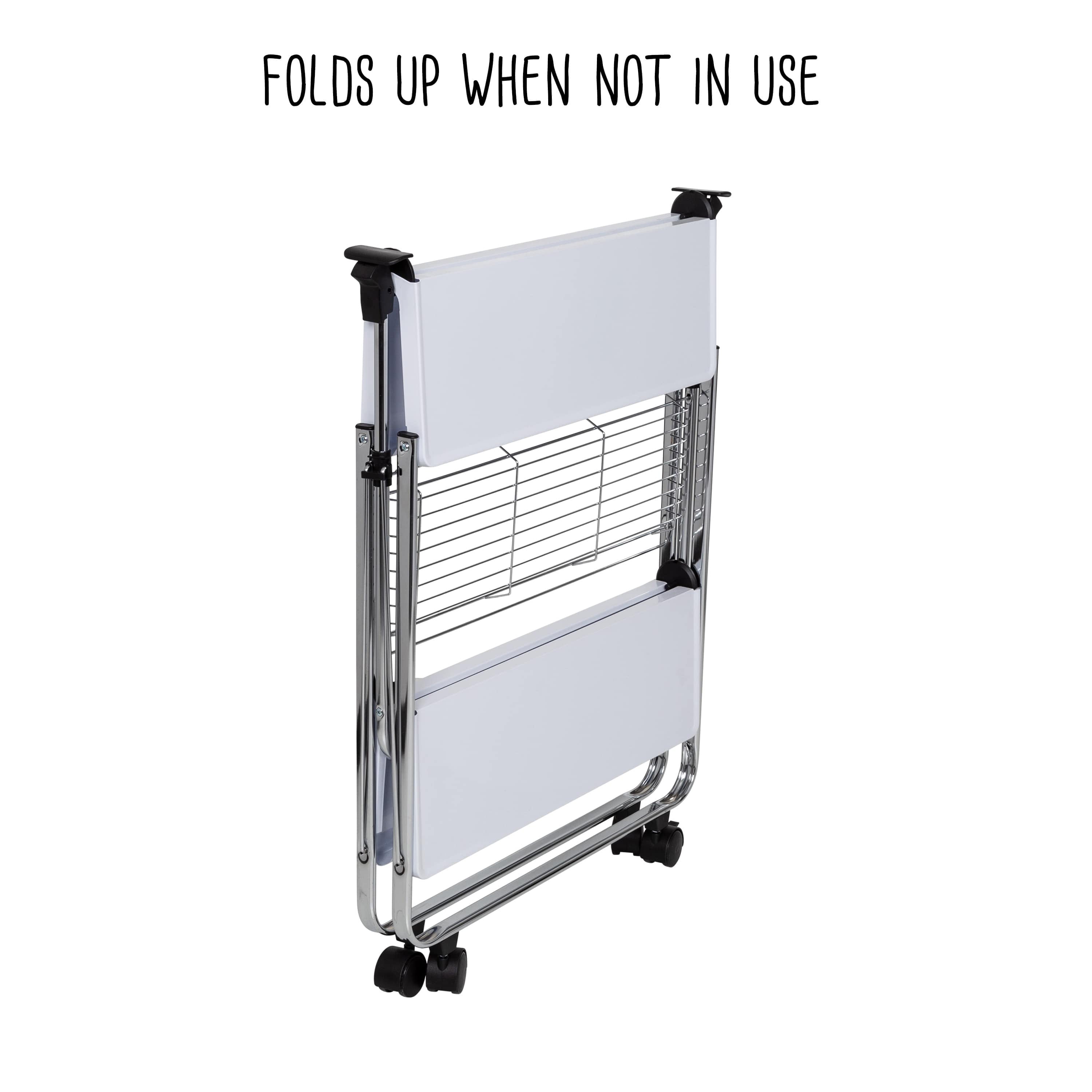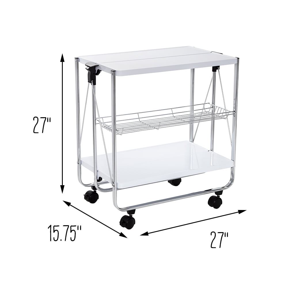 2-tier collapsible cart with wheels and wire basket Equipped with 4 castor wheels for portability and stability Easy-to-sanitize metal surface makes it perfect for food prep Collapsible design ensures that storage is a cinch; great for small homes Can also be used as a craft cart, portable plant stand, office cart, toy storage, etc. Total weight capacity: 40 lbs. Dimensions: 27” W x 15.7” D x 27” H Product weight: 12.48 lb. Honey-Can-Do
