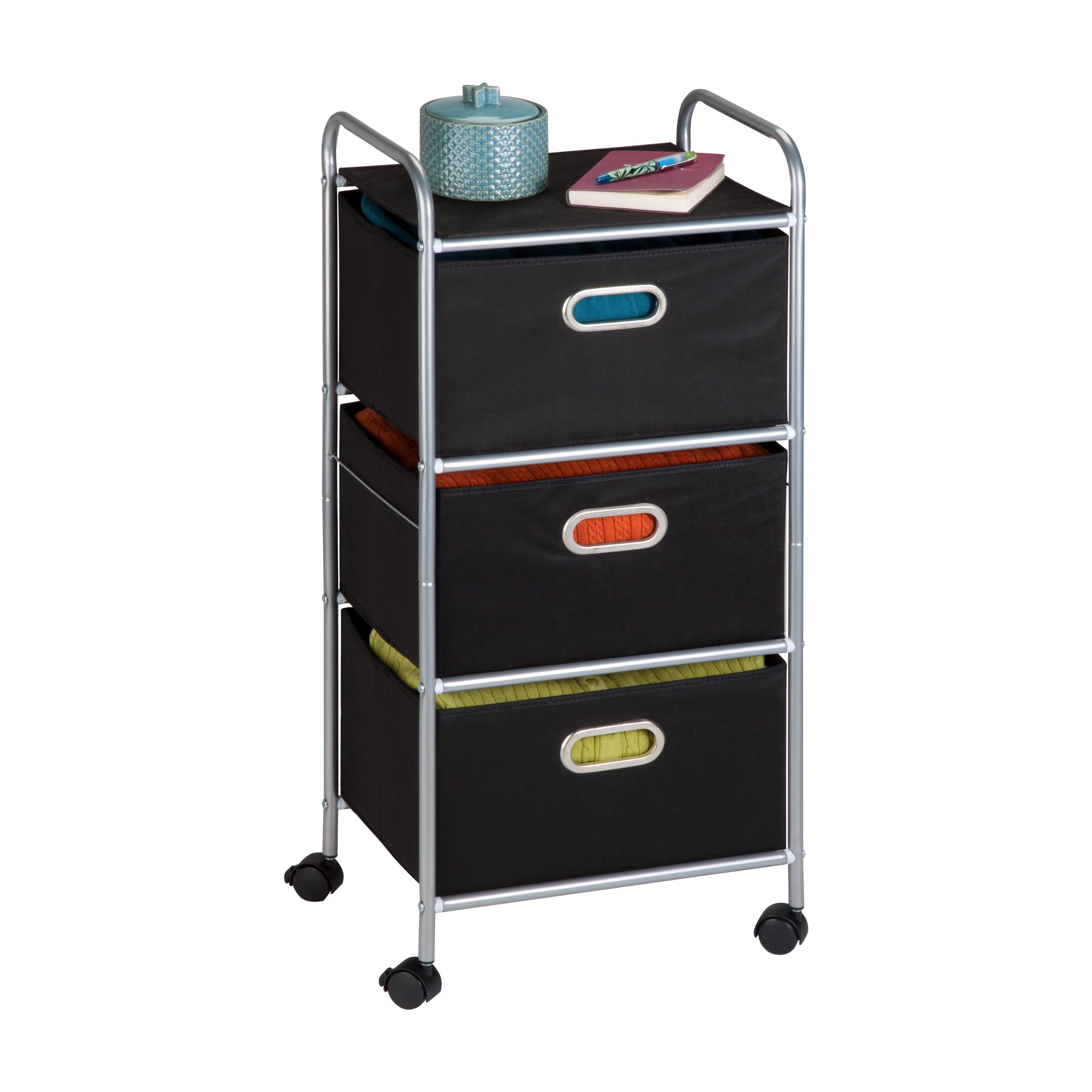 Getting organized has never looked better with this impressive black fabric cart. The smooth rolling storage unit has three spacious drawers to hold clothes, tools, or anything else you need tucked away. A soft top surface provides even more storage space, and can double as a night-stand. Two locking wheels keep the cart securely in place as needed, and unlock for easy maneuvering around the room.