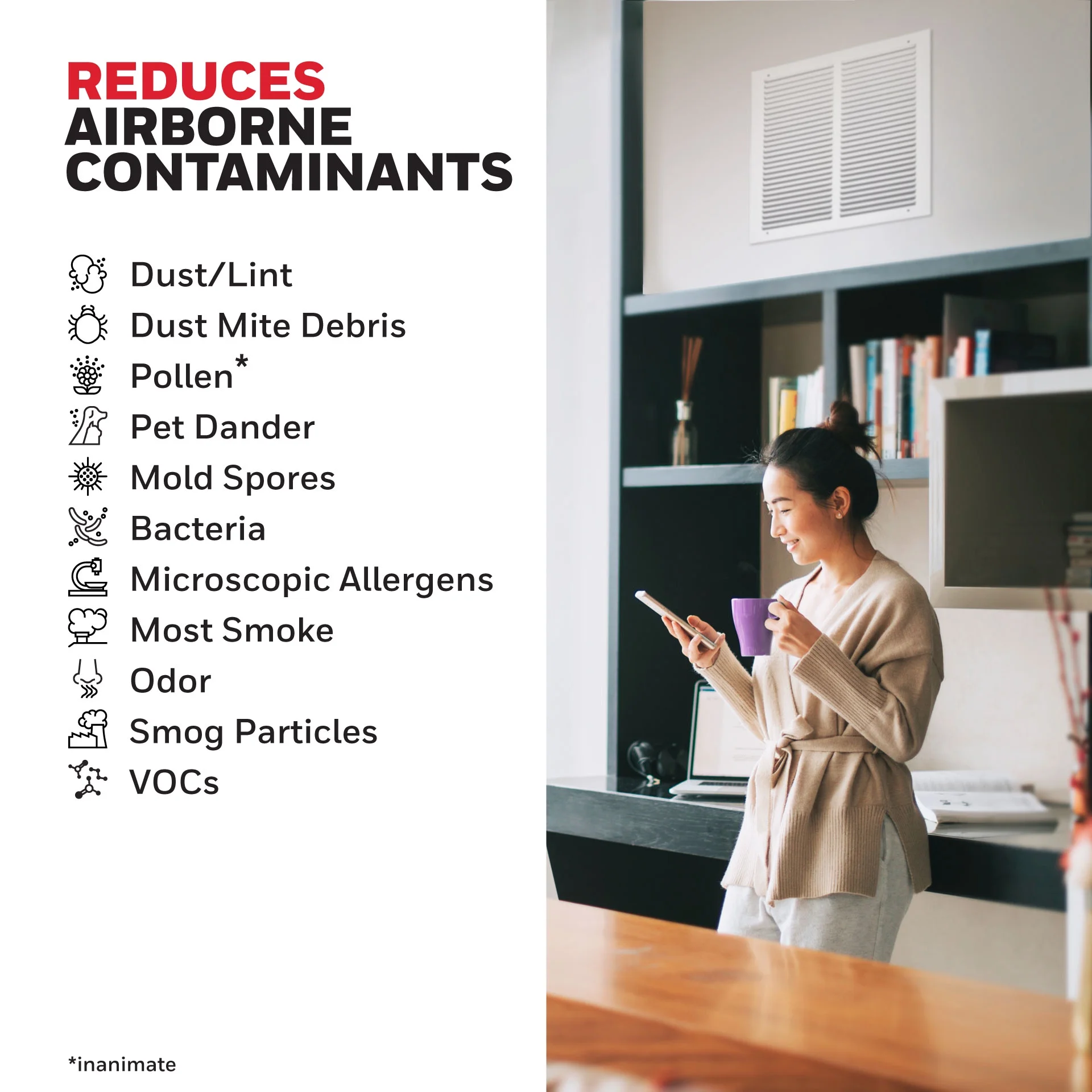 Designed to improve indoor air quality by reducing airborne contaminants and odors. The Honeywell Allergen Control 12000 Air Filter is rated as a MERV 12. ** The higher the MERV rating the better an air filter performs. Captures airborne allergens such as pollen, dust, and pet dander. Electrostatic charged media improves filter performance by using static electricity to trap smaller airborne particles. Built-in odor reducing ingredients to freshen your indoor air. Designed to outperform 1 inch fiberglass home air filters designed for your furnace, air conditioner, or HVAC unit. ** Air filter is designed to last up to 90 days For optimal performance of your furnace, air conditioner, or HVAC system, change your home air filter at least every 90 days, and more frequently depending on your home environment. A dirty air filter can restrict air flow and force your heating and cooling or HVAC system to work harder to keep your home at your desired temperature. *All MERV data and statements are indicative of typical properties and characteristics obtainable. MERV claims are to be used as a guide for general comparison and not as a specification.**Manufacturer’s claim based upon comparisons of MERV test data between this filter type and typical fiberglass.