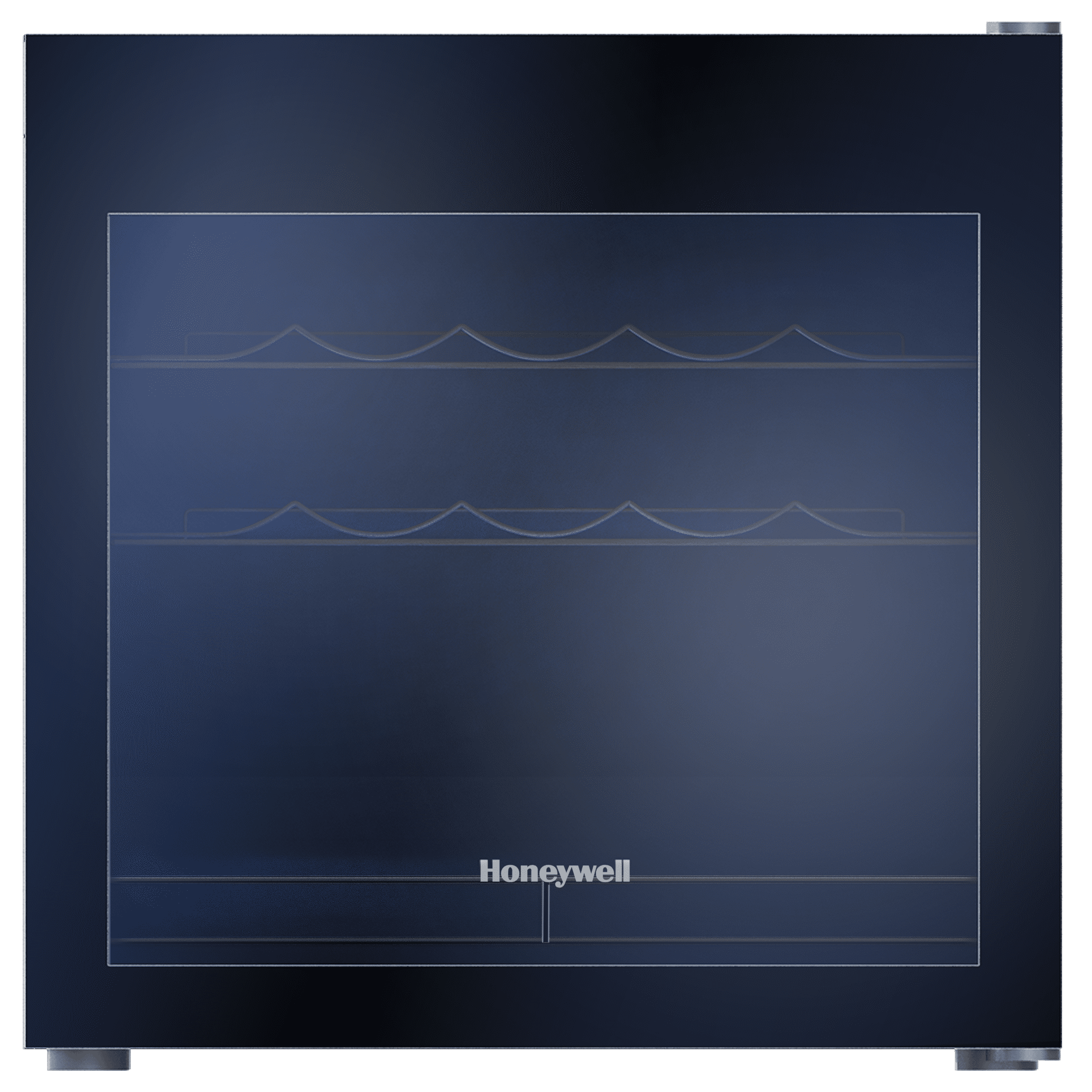The Honeywell 14-bottle wine cooler has an adjustable thermostat, glass door, recessed door handle. This cooler has slide-out chrome shelves. The dimensions are 18.9 in. x 17.2 in. x 20.4 in.