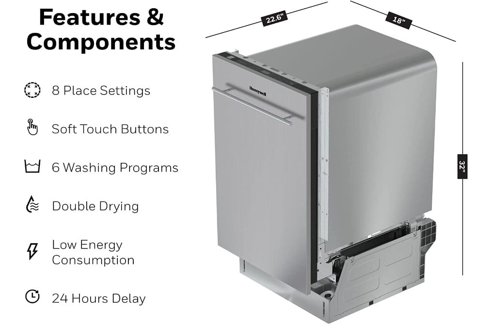 Honeywell 18 inch Dishwasher with 8 Place Settings, 6 Washing Programs, Stainless Steel Tub