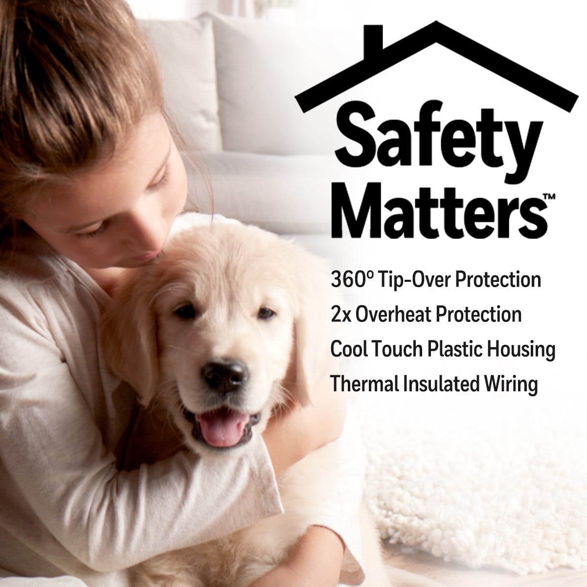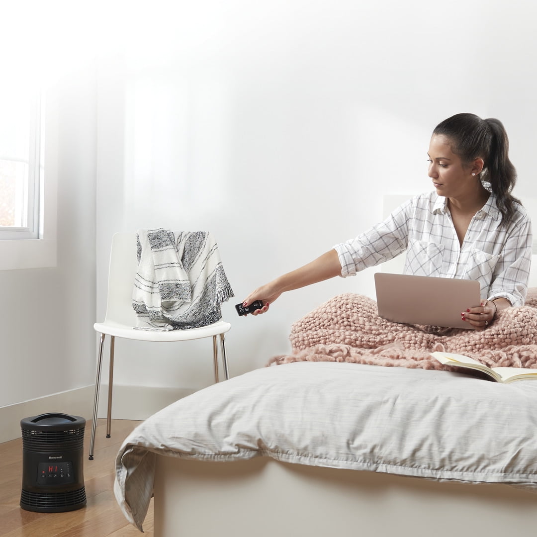 Designed to provide all-around warmth, the Honeywell 360° Digital Surround Space Heater is perfect for small to mid-sized rooms and offers all-around room heating. It’s a portable heater that provides energy savings, excellent safety features and the ability to control your comfort, all at a reasonable price. The enhanced safety features on this portable room heater include overheat protection, a sturdy base, and 360° SafetyTip, which shuts the heater off if it is tipped in any direction. With two different heat setting modes and a programmable thermostat, you have complete control over the heating process. Plus, the easy-grab, cool-touch handle makes it easy to carry this portable air heater from room to room. With a space heater, you can save money and energy! By turning down your whole house thermostat a few degrees and heating just the room you are in, a Honeywell small heater can help you save money while providing soothing warmth. Plus, with a Honeywell space heater, you can save up to $276* in heating costs this year. By turning down your whole house thermostat a few degrees and heating just the room you are in, a Honeywell air heater can help you save money while providing soothing warmth. That’s Honeywell Heater peace of mind. *Calculation Assumes 8 hrs/day use * 7 days a week @ 900 watts * $0.1595 avg kwp * 12 weeks to zone heat and thus decreasing thermostat from 70 to 62 degrees with energy costs from US Energy Information Administration; October 2022; Winter Fuels Outlook