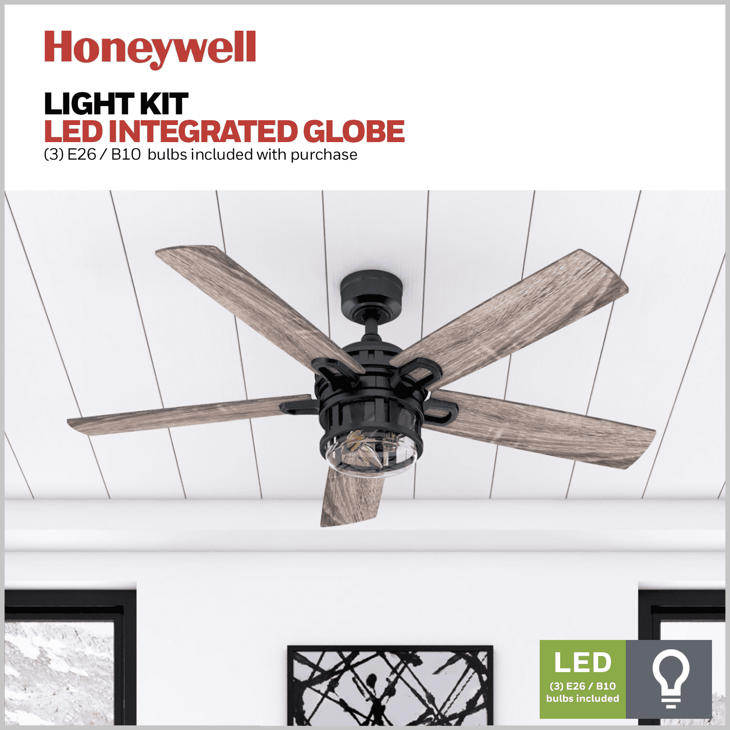 CONTEMPORARY DAMP RATED CEILING FAN: Modernize your space with a contemporary Honeywell ceiling fan! QUIET, REVERSIBLE MOTOR: Conveniently quiet, 3 speed – reversible motor. Downdraft mode and updraft mode for optimal airflow. Control the temperature of your space with ease! DUAL-FINISH REVERSIBLE BLADES: The style is up to you! This ceiling fan comes with a different finish on each sides of the blades. Pick the finish that best fits your space! TRI-MOUNT OPTIONS: Dynamic hanging abilities. This fan can be mounted with a down rod (standard), angled-mount (sloped) and close-mount (4” down rod included with purchase).