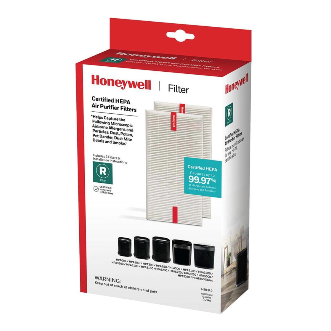 The Replacement HEPA Air Purifier R Filter – 2 Pack is certified to help capture up to 99.97% of the following microscopic airborne allergens and particles as small as 0.3 microns: dust, pollen, pet dander, dust mite debris and smoke. Compatible with: HPA094 / HPA100 / HPA200 / HPA250 / HPA300 / HPA3100 / HPA3200 / HPA3300 / HPA5100 / HPA5150 / HPA5200 / HPA5220 / HPA5250 / HPA5300 / HPA5350 / HPA8350 series. For best performance, use only Genuine Honeywell air purifier filters and replace every 12 months.