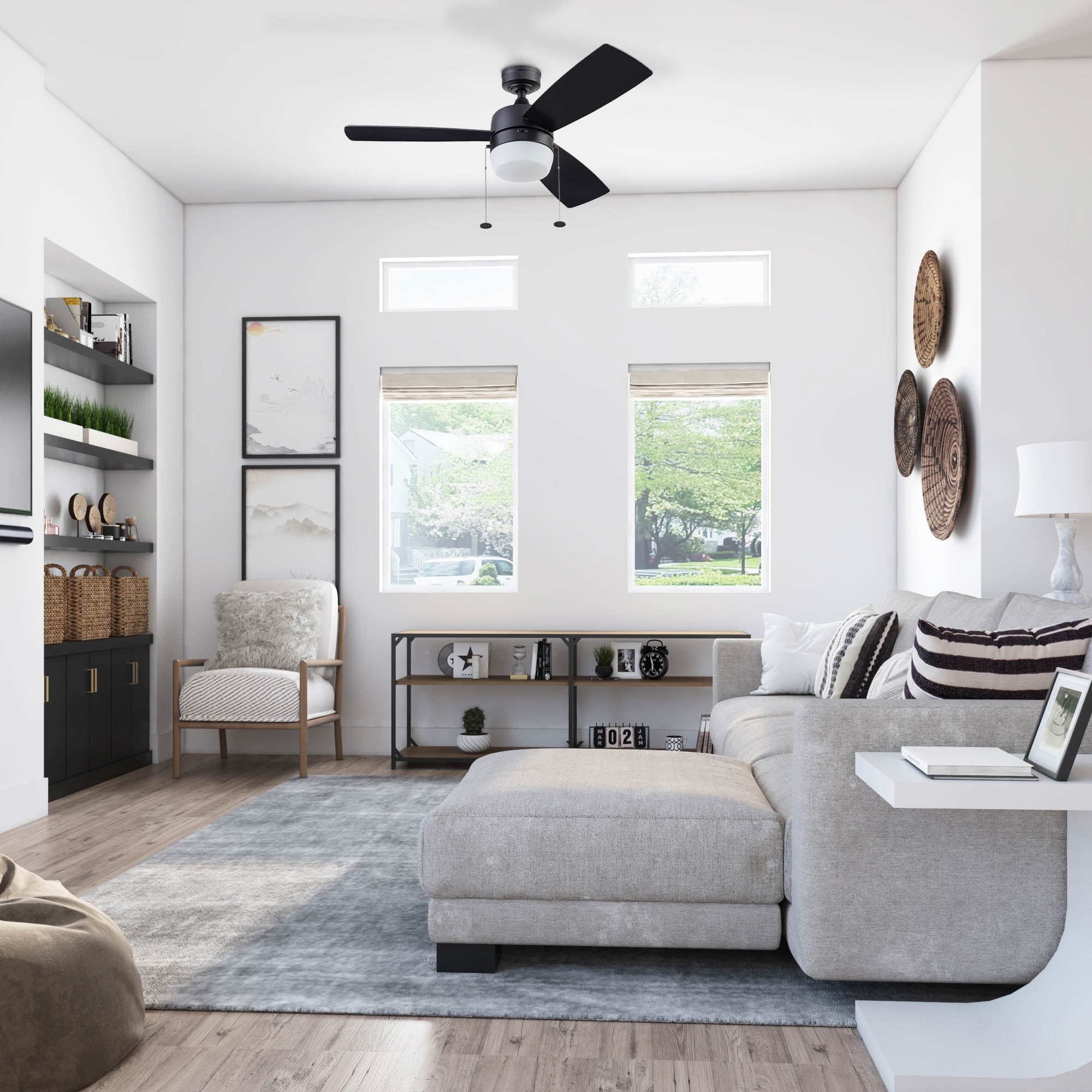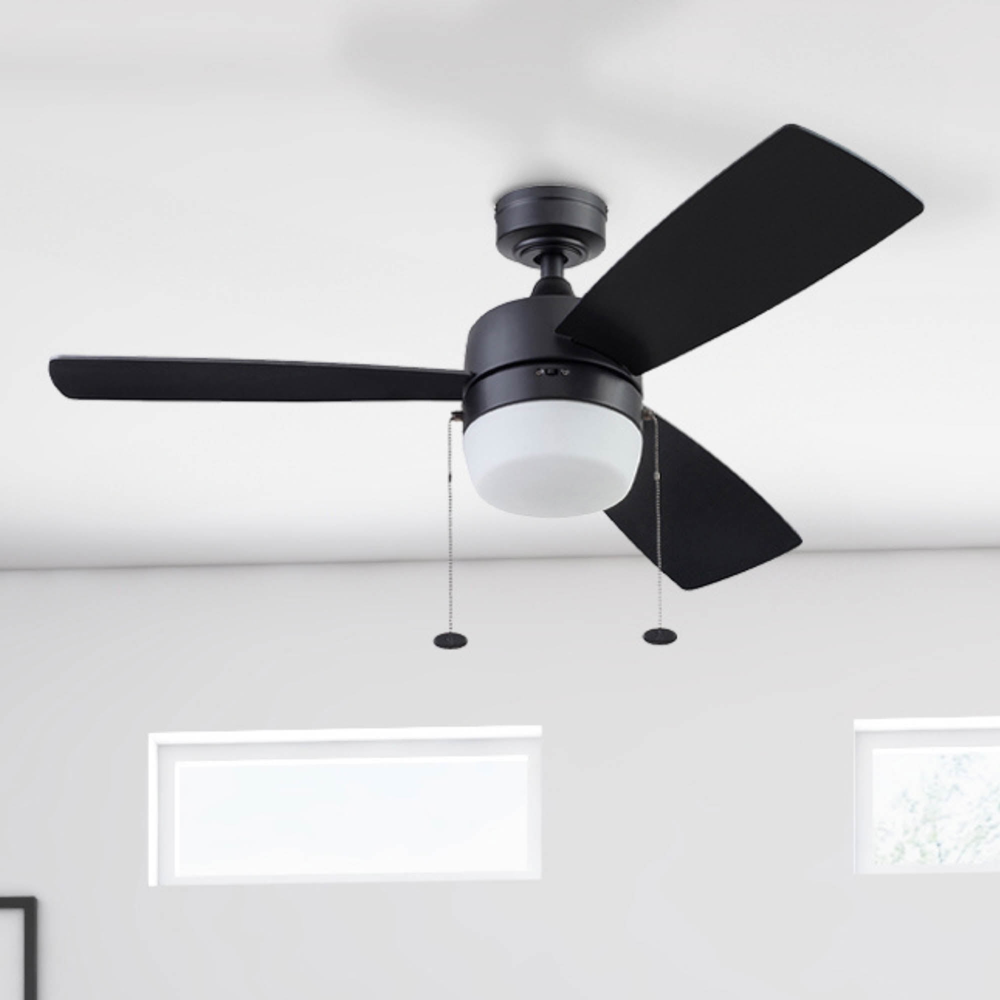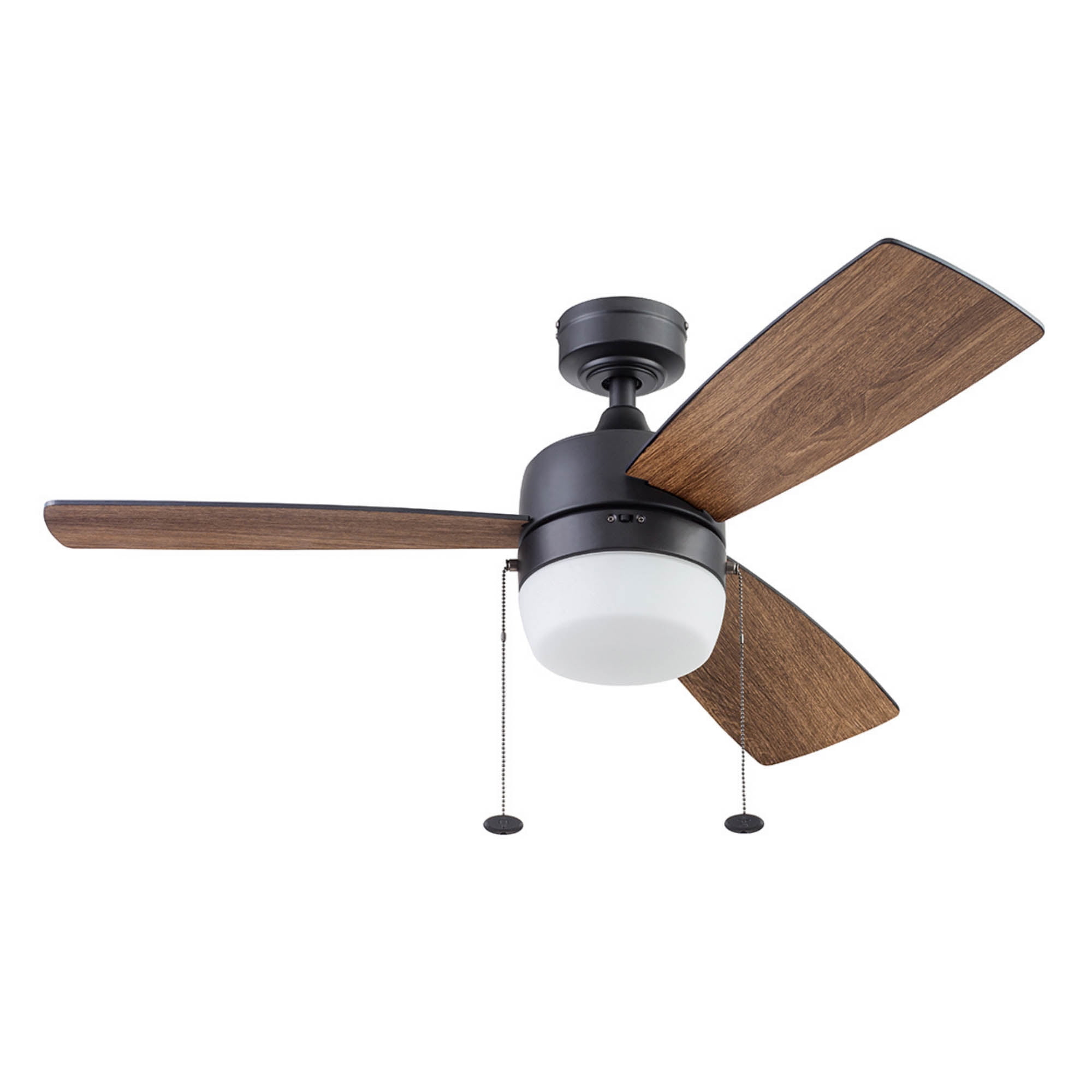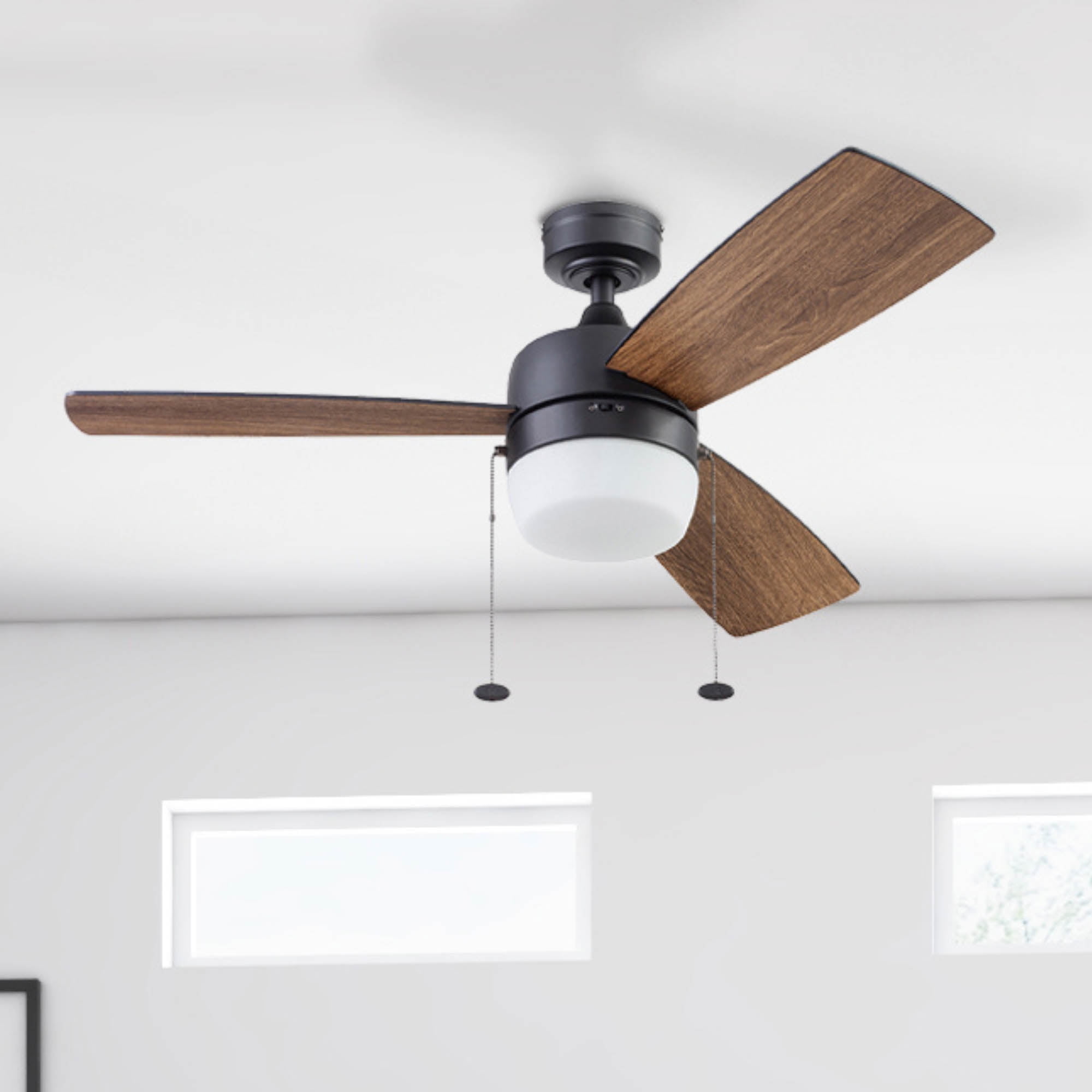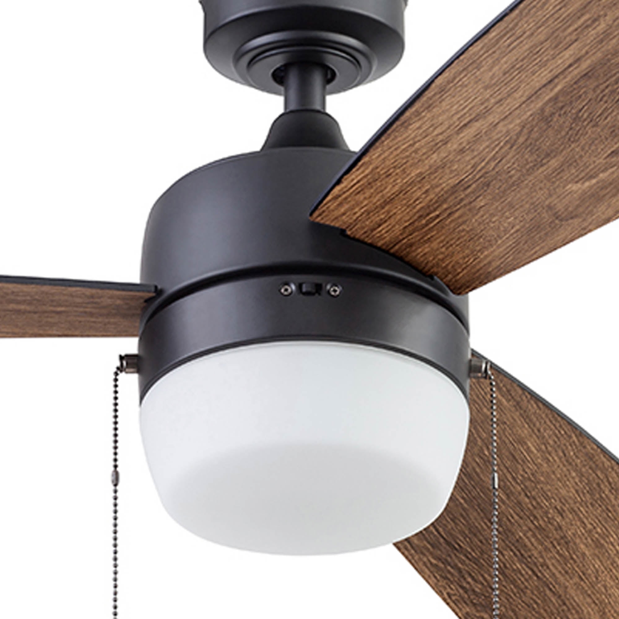 Honeywell Barcadero 44” Black Modern LED Reversible Ceiling Fan with Pull Chains 44 inch contemporary ceiling fan designed to modernize your spaces Features a matte black finish that enhances your aesthetic appeal; Reversible blades allow for easy adjustment to freshen up your decor One side features a deep black finish, while the reverse has a tumbleweed finish, complementing various styles; Provides excellent airflow circulation to keep your room cool during summer months Designed with a reversible motor to redistribute warmer air for comfort in winter; Includes a 4 inch downrod with a 0.75 inch width and a 54 inch lead wire for longer downrod options Easy to install with three mounting options: close, standard down rod, or angled