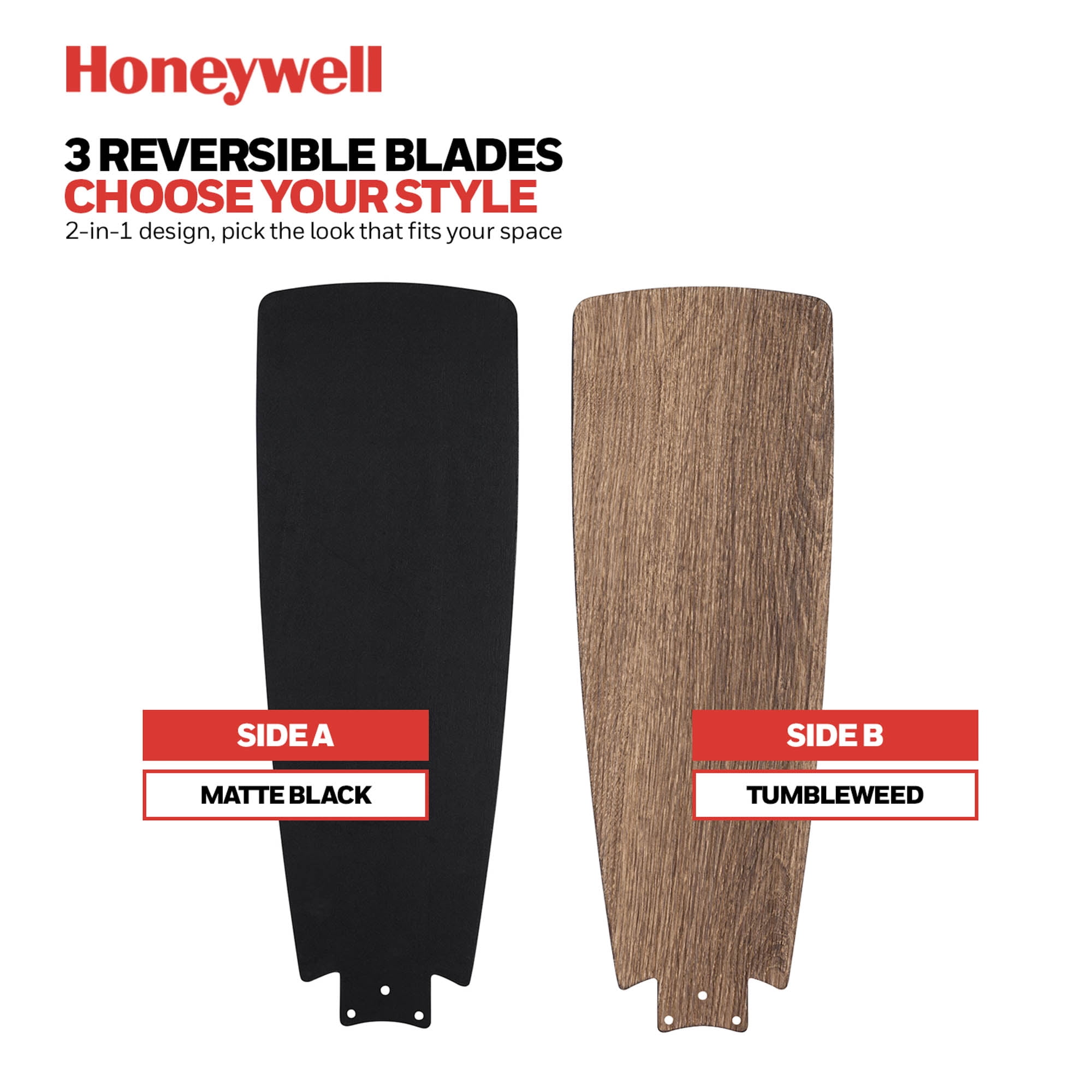 The 44-inch Honeywell Barcadero is a clean-cut contemporary ceiling fan perfect for modernizing your spaces. This modern farmhouse ceiling fan features a matte black finish that has mass appeal and elevates your aesthetic. Each blade is reversible, easily adjustable and ready whenever you want to freshen up the existing look or just try something new! The Barcadero comes expertly paired with a deep black finish on one side pairing perfectly with modern decor and a tumbleweed finish on the reverse complementing rustic farmhouse and industrial styles- the choice is yours!The Barcadero brings airflow circulation to help make your room ideally cool throughout the summer months. Being designed with a reversible motor, warmer air can be redistributed making your space more comfortable during the winter as well. The downrod is 4 inches in length and 0.75 inches in width with an accompanying 54” lead wire should you wish to get a longer downrod. The Barcadero is easy to install and comes with 3 different mounting options – close, standard down rod (as pictured), or angled. This fan’s size makes it the perfect match for any large to medium size room.Each Honeywell ceiling fan is backed by a limited lifetime warranty.Offering a timeless look, splendid air flow and superior quality, just like all else Honeywell, you’ll be able to rely on this fan for years to come.