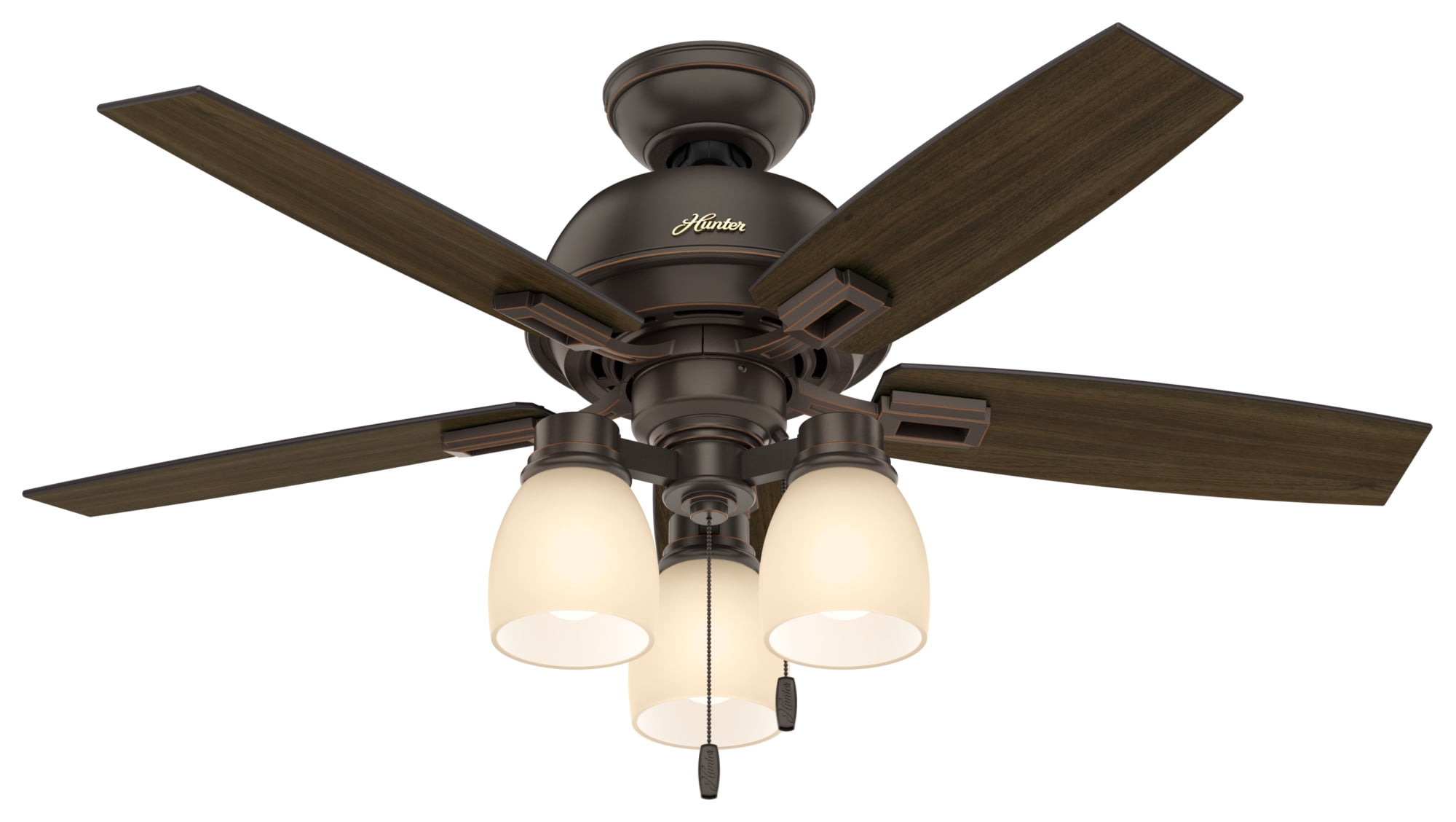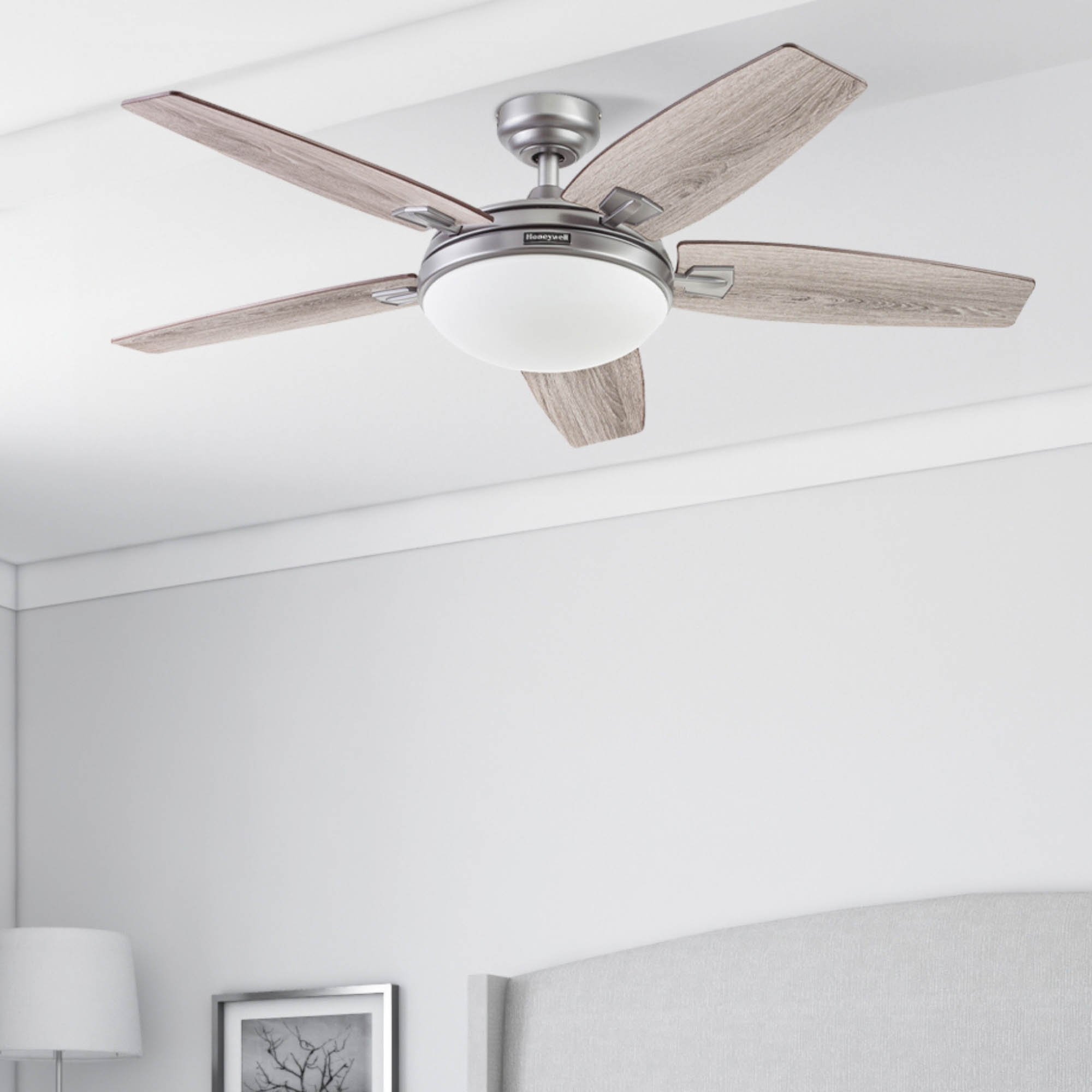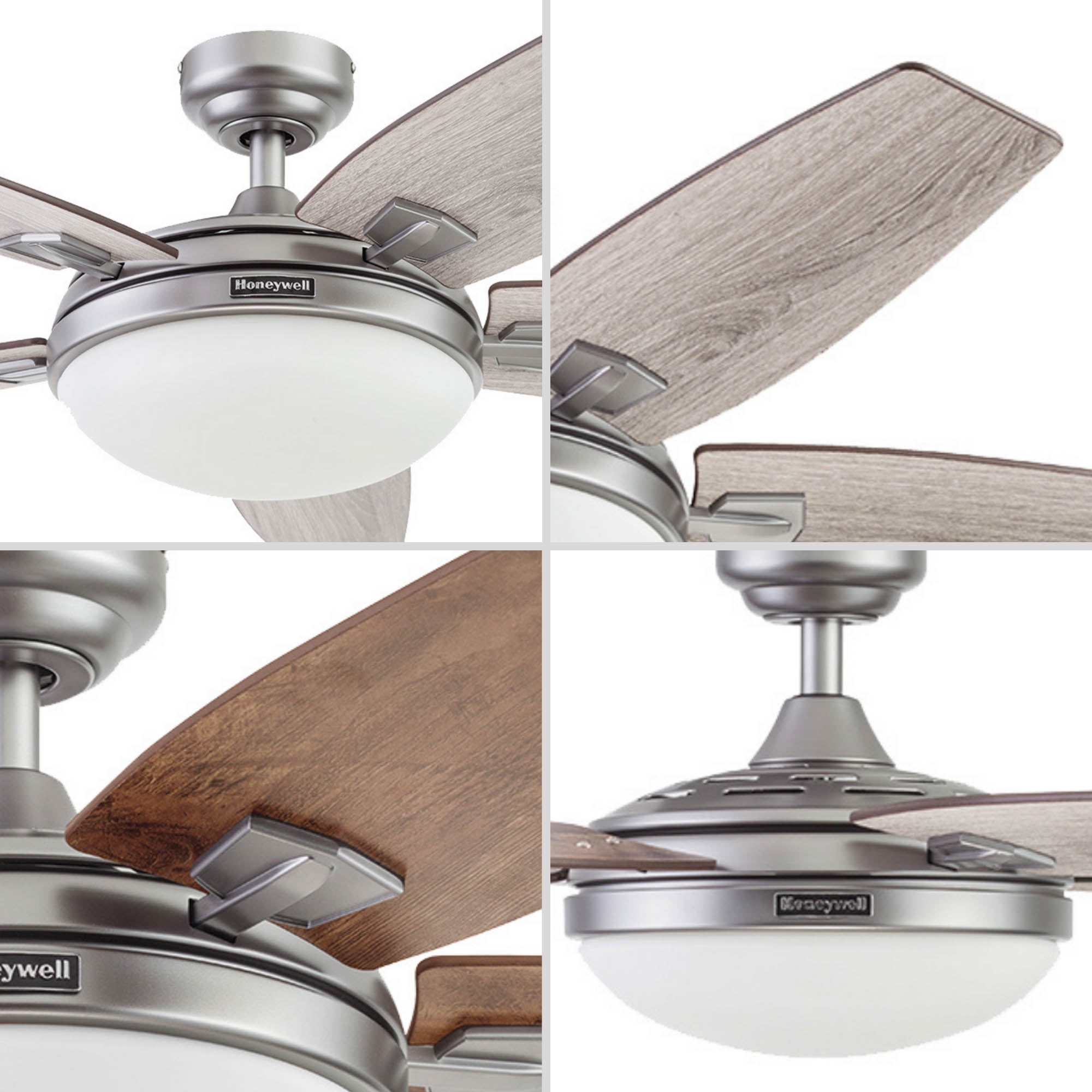 A bold traditional ceiling fan with a modern twist, the Honeywell Carmel has the perfect balance of style, function and illumination. The sleek pewter body is perfectly complemented by the beautifully frosted dome light creating a striking focal point that is sure to impress. Modern blade arms hold the five reversible blades. Each blade is easily adjusted with a gray oak finish on one side which pairs well with a variety of looks especially coastal decor and a chestnut finish on the other side which combines well with modern farmhouse aesthetics – The choice is yours! This fan is easy to install and comes with 2 different mounting options – standard or angled. The down rod is 4 inches in length with an accompanying 54” leadwire should you wish to get a longer down rod. The reversible motor housing enables it to not only cool during the summer but help circulate warm air during the winter. For added ease and elevated luxury, the features and fan functions are adjustable by remote control. Each Honeywell ceiling fan is backed by a limited lifetime warranty. Offering a unique style, adequate air flow and superior quality, just like all else Honeywell, you’ll be able to rely on this fan for years to come.
