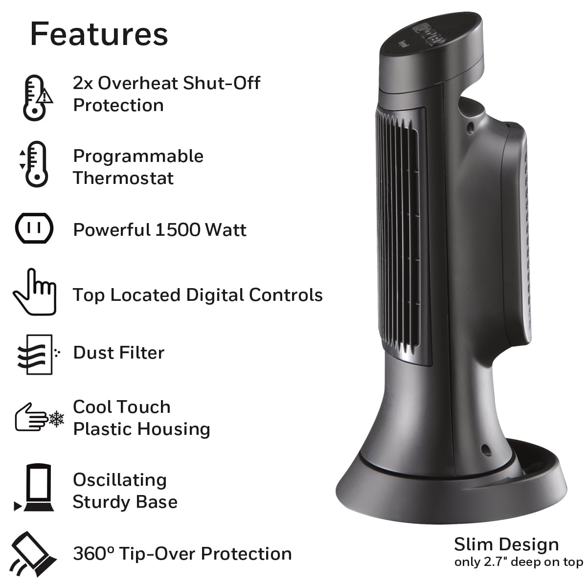 Ceramic heating technology allows efficient use in medium-to-large rooms Large temperature settings ensure easy visibility from distance Programmable thermostat lets you adjust timer settings Overheat protection ensures safe use for easy handling Slim design allows convenient use in optimal location Ceramic Indoor compact heater has 2 heat settings Wide oscillation for even distribution of warm air Timer can be set between 1-8 hours Housing and handle remain cool to the touch during operation
