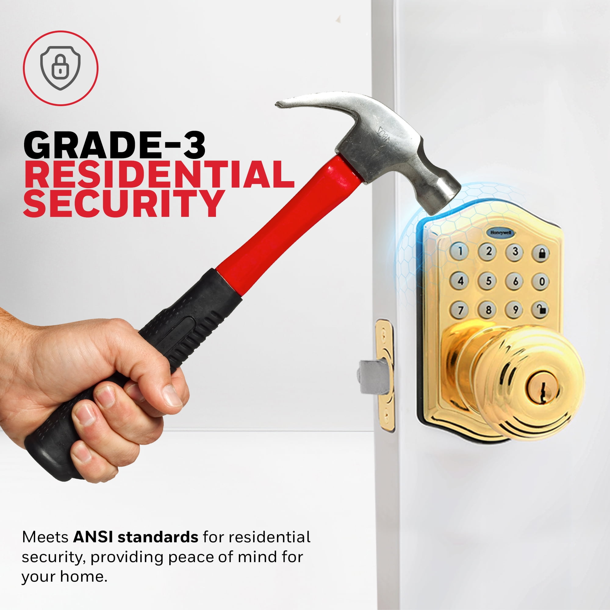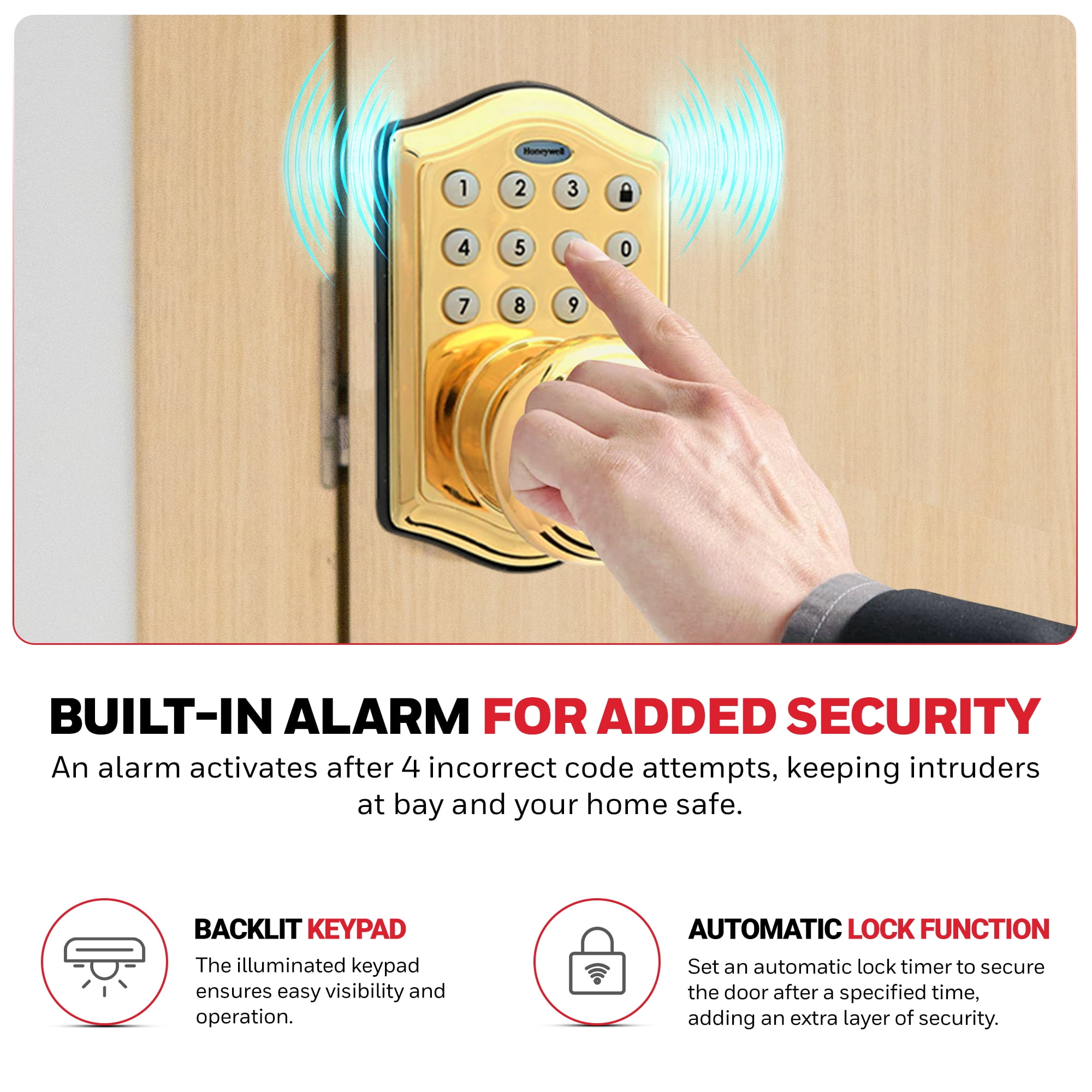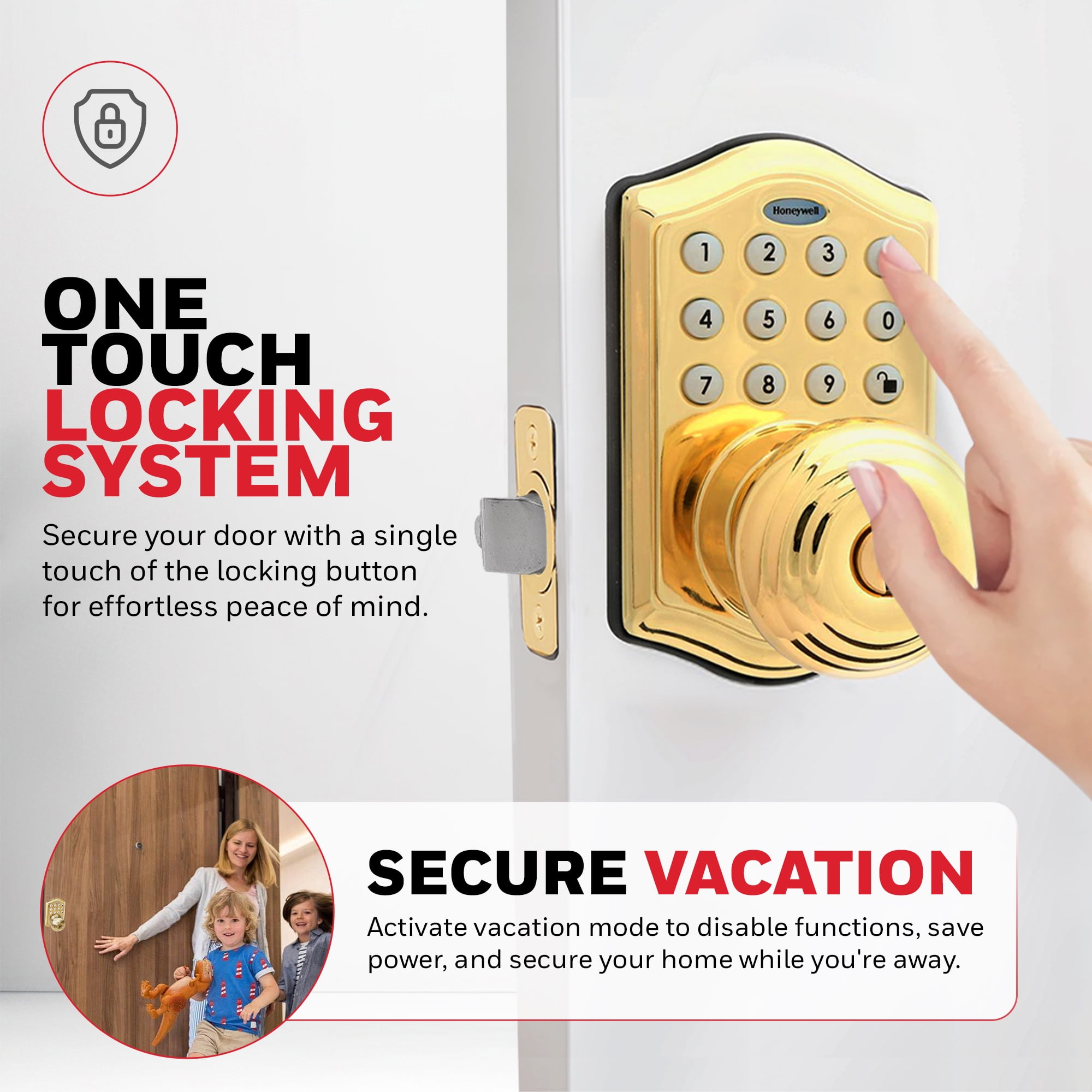 Convenient Dual Access: The Honeywell electronic digital entry keypad door locks offer both traditional key access and a keyless entry option, utilizing a programmable 4 to 8-digit user code for ultimate convenience. User-Friendly Programming: Easily program up to 50 different user codes and delete them as needed, ensuring flexibility for family members or guests. Advanced Security Features: The Honeywell door lock with a keypad includes an automatic lock function that secures the deadbolt after a set time and a vacation mode that conserves power by disabling all buttons until reactivated. Easy Installation: Designed for quick installation, this keypad lock fits standard door thicknesses of 1 3/8 inches to 1 3/4 inches with an adjustable latch for 2 3/8 inch or 2 3/4 inch backsets, requiring only a Phillips head screwdriver when pre-drilled holes are available. Durable and Stylish: Featuring bump protection and a Polished Brass finish, the digital door lock with keypad set complements a variety of doors and home decor styles while providing enhanced security.