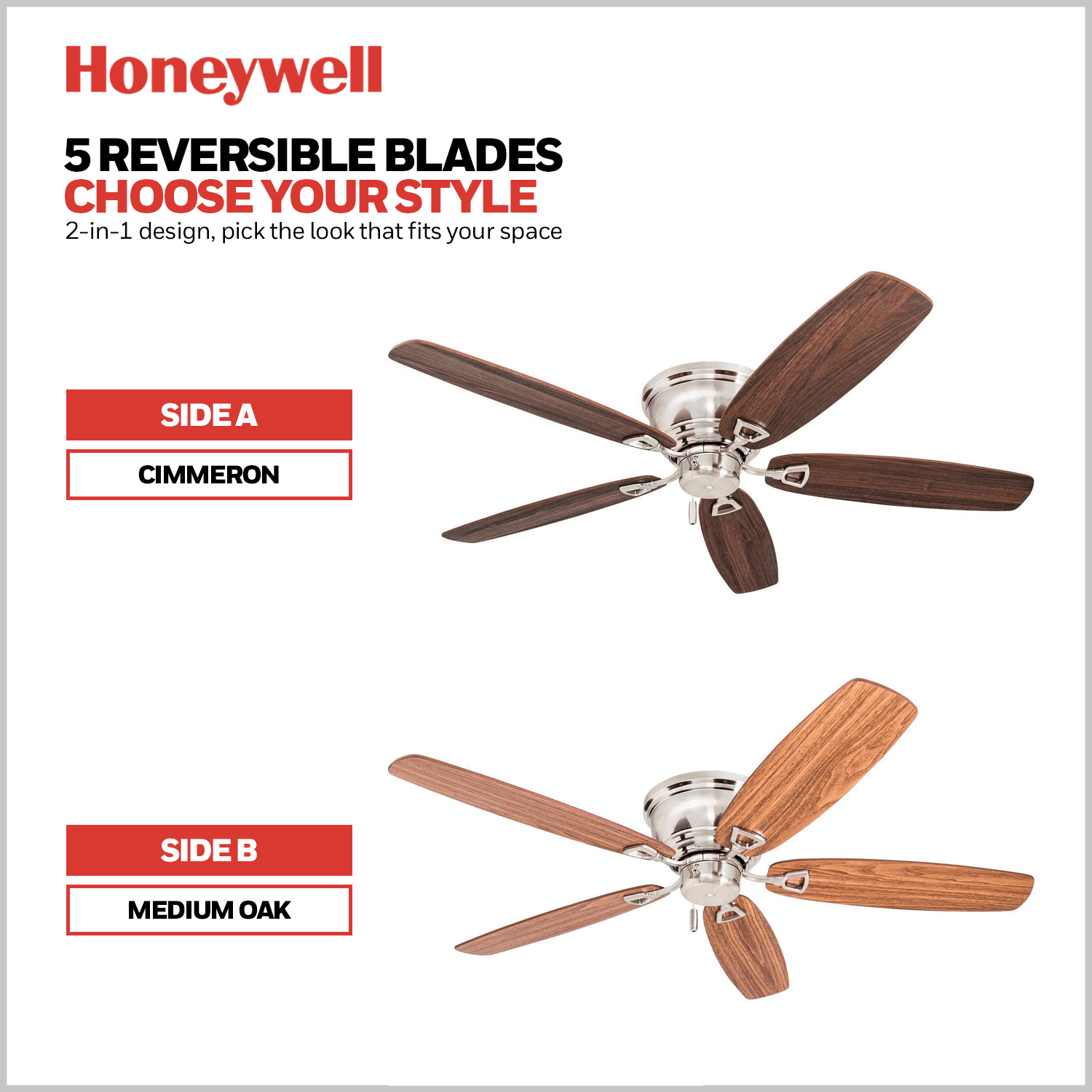 Keep your space cool with a Classic Low Profile Honeywell Ceiling Fan. This fan has a warm design that will complement almost any space. Hang it in a living area or family room to keep things cool in the summer months and even reverse the motor to keep it warm in the winter! The 52-inch ceiling fan is energy-efficient and easy to install, so you can start enjoying the comfort in no time. This timeless fan will keep you cool for years to come.