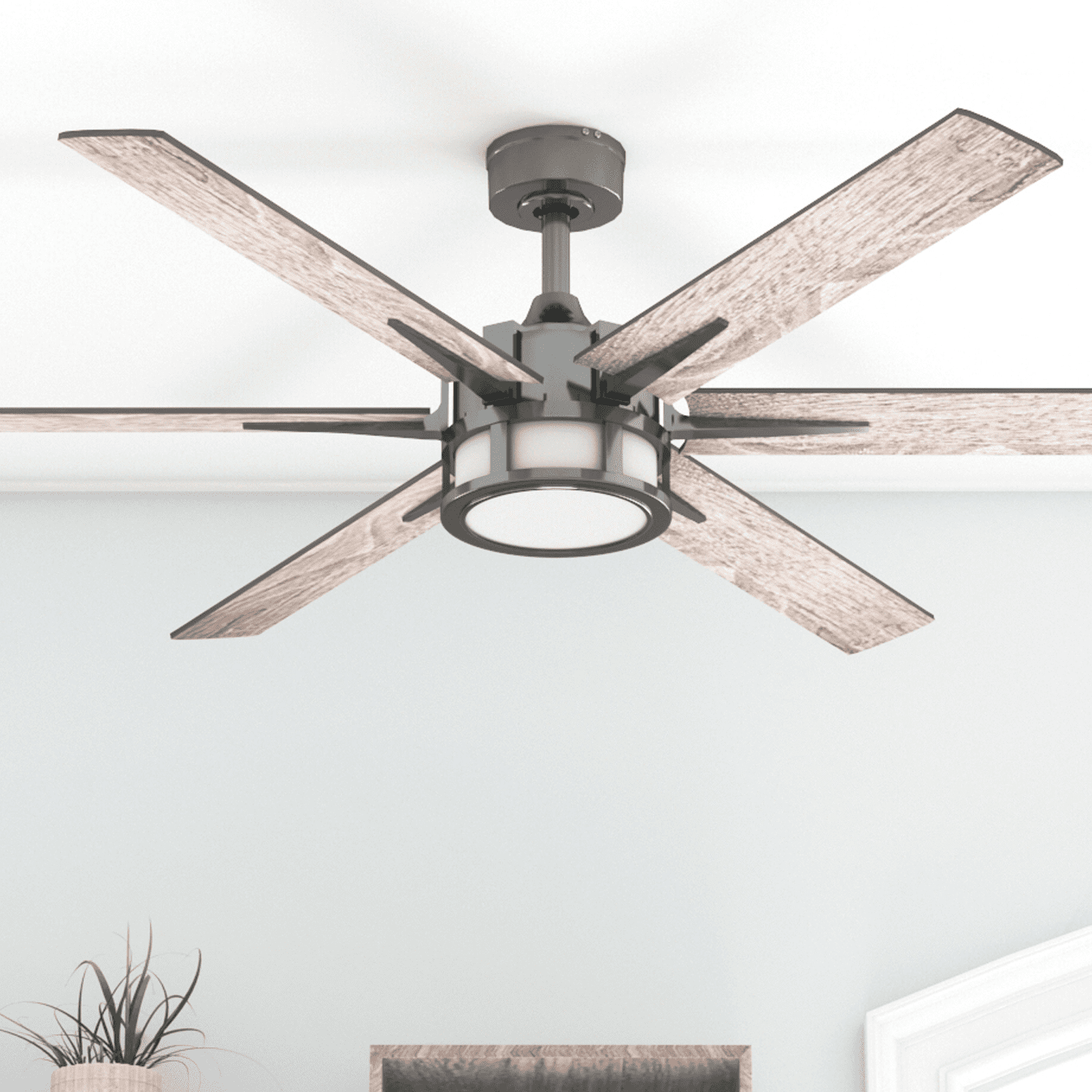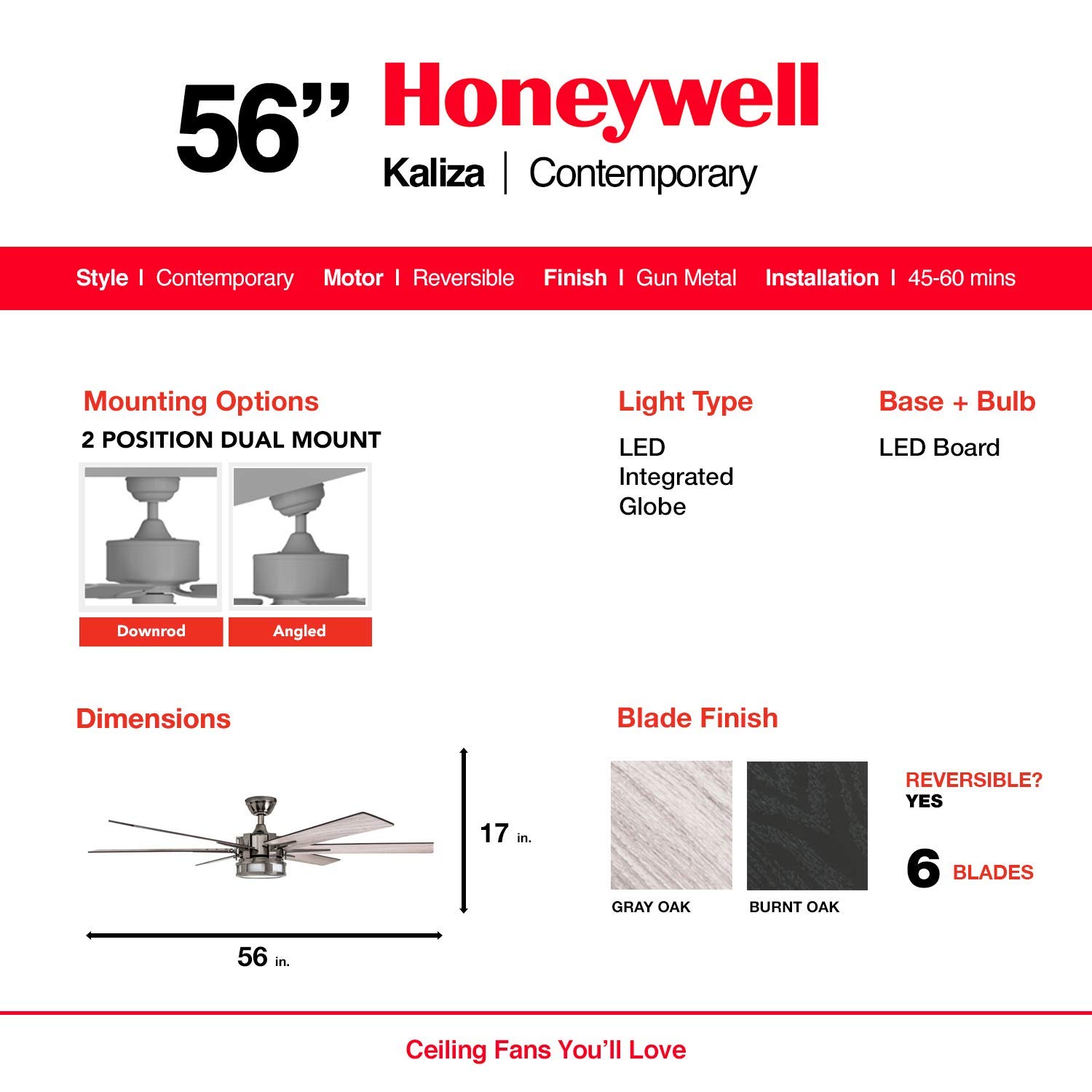 This 56-Inch Kaliza Ceiling Fan with a quiet, reversible motor is the perfect addition to any room, providing a peaceful indoor environment year-round. The 3-speed reversible motor offers versatile performance, keeping you cool in the summer and circulating warm air in the winter to help reduce energy costs. Ideal for spaces up to 400 square feet, it’s perfect for living rooms, bedrooms, dining rooms, and family rooms. Included with the fan are energy-efficient LED bulbs to brighten up any room in the home or office space while offering long-lasting illumination. The fan is specifically designed for rooms with low ceilings, ensuring optimal air circulation without taking up valuable space. It also features reversible blades in gray oak and light oak, allowing it to seamlessly blend with your existing decor. With a remote control for easy operation, this fan is crafted from a combination of wood, glass, and metal in a sleek brushed nickel finish. The fan measures 56 inches long, making it a compact and stylish solution for medium-sized rooms. Installation can be completed in 45 to 60 minutes. Enjoy comfort, energy savings, and stylish, sleek design all in one with this Indoor Ceiling Fan with Quiet, Reversible Motor from Honeywell, designed to fit your space and enhance your home’s decor.