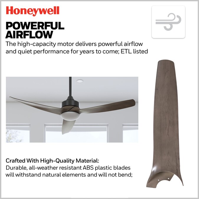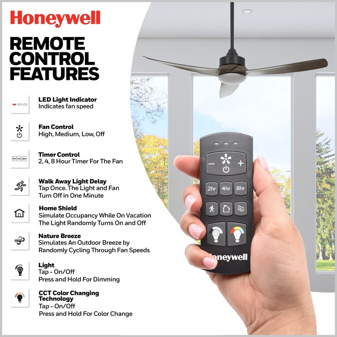 Honeywell ceiling fans make your home comfortable in all seasons as well as help to reduce energy costs. Enjoy the welcome breeze in any room of your home while looking stylish. Combining contemporary elements with organic inspirations, this multi-position indoor or covered outdoor ceiling fan exemplifies a transitional style and serves as a captivating addition to your home. The Lynton damp rated ceiling fan boasts a streamlined design adorned with durable faux wood blades, perfectly complementing a wide range of decor styles. Its sleek aesthetic and reliable construction make it an ideal choice for enhancing any space. The innovative 3-blade design provides ultra-efficient, adjustable, and energy-efficient airflow while the dimmable CCT (Color Changing Technology) LED lights provide ideal adjustable lighting to fit any mood. Control your fan speed, color temperature and lighting with the touch of a button by using our easy-to-use advanced ceiling fan remote control with wall mount option (batteries included). Enjoy year-round comfort by adjusting the reversible airflow switch that easily allows you to change the direction of the fan to properly distribute air. During hot summer months it will provide a cooling effect or when reversed, spreading warm air in the winter to help reduce energy costs. Honeywell Ceiling Fans features a collection of fans in various sizes and specifications to ensure your choice of indoor or outdoor fan delivers optimum performance for your room’s size. You can trust the quality of Honeywell Ceiling Fans to deliver maximum airflow and a stylish lighting option. Honeywell Ceiling Fans use high-quality materials that are long lasting and durable with satisfaction guaranteed by the manufacturer’s limited lifetime warranty.