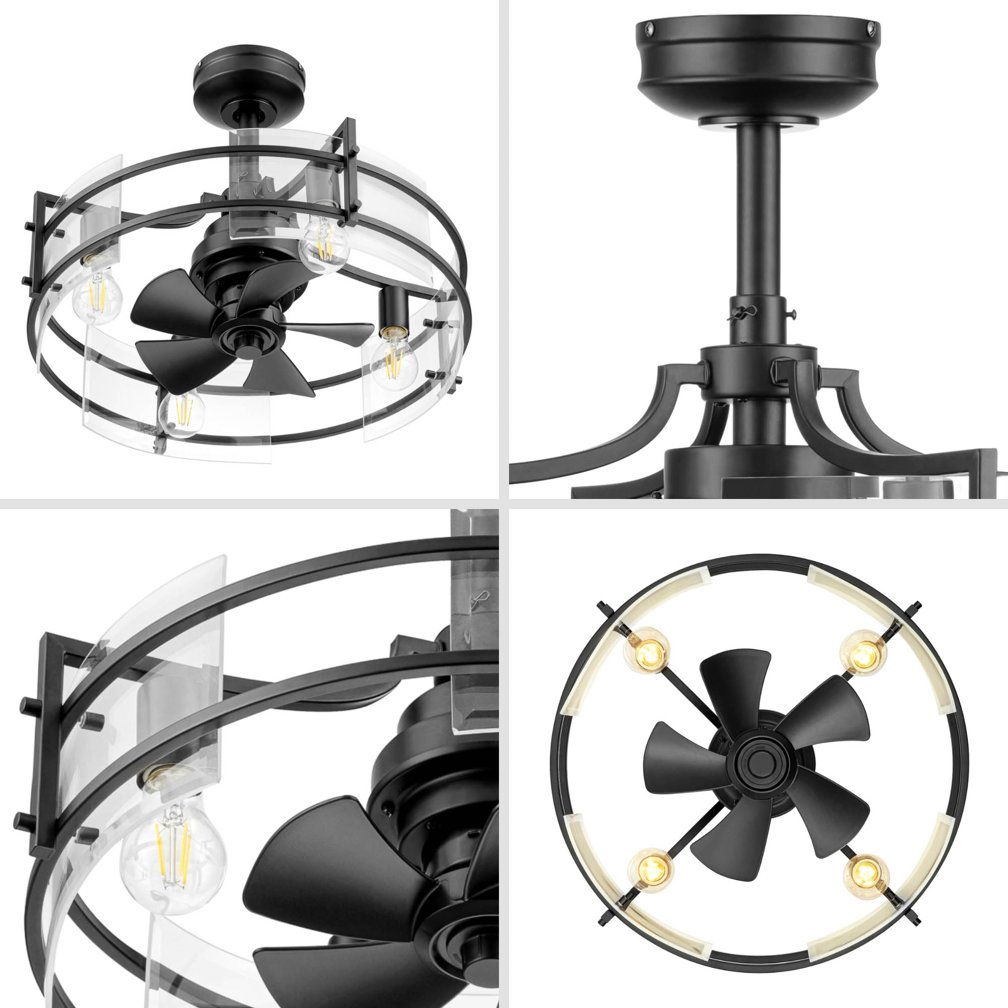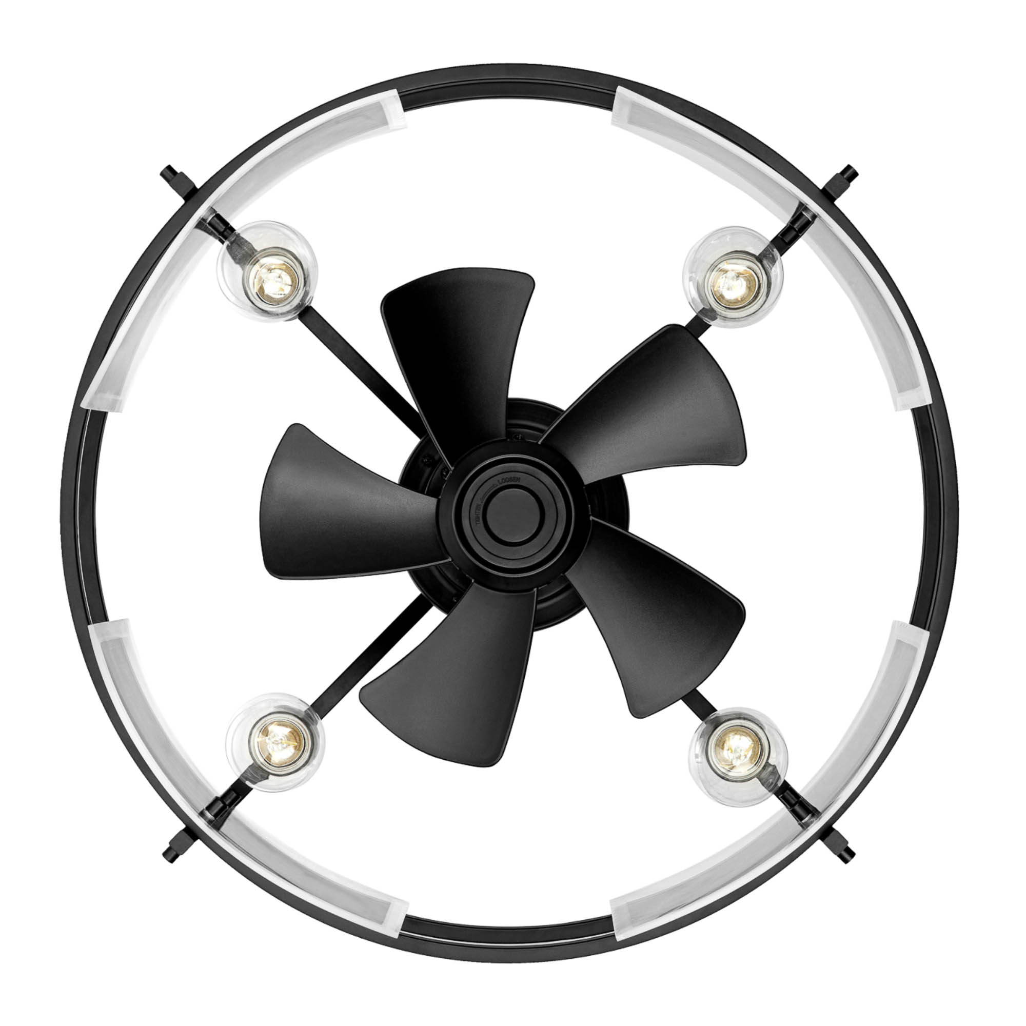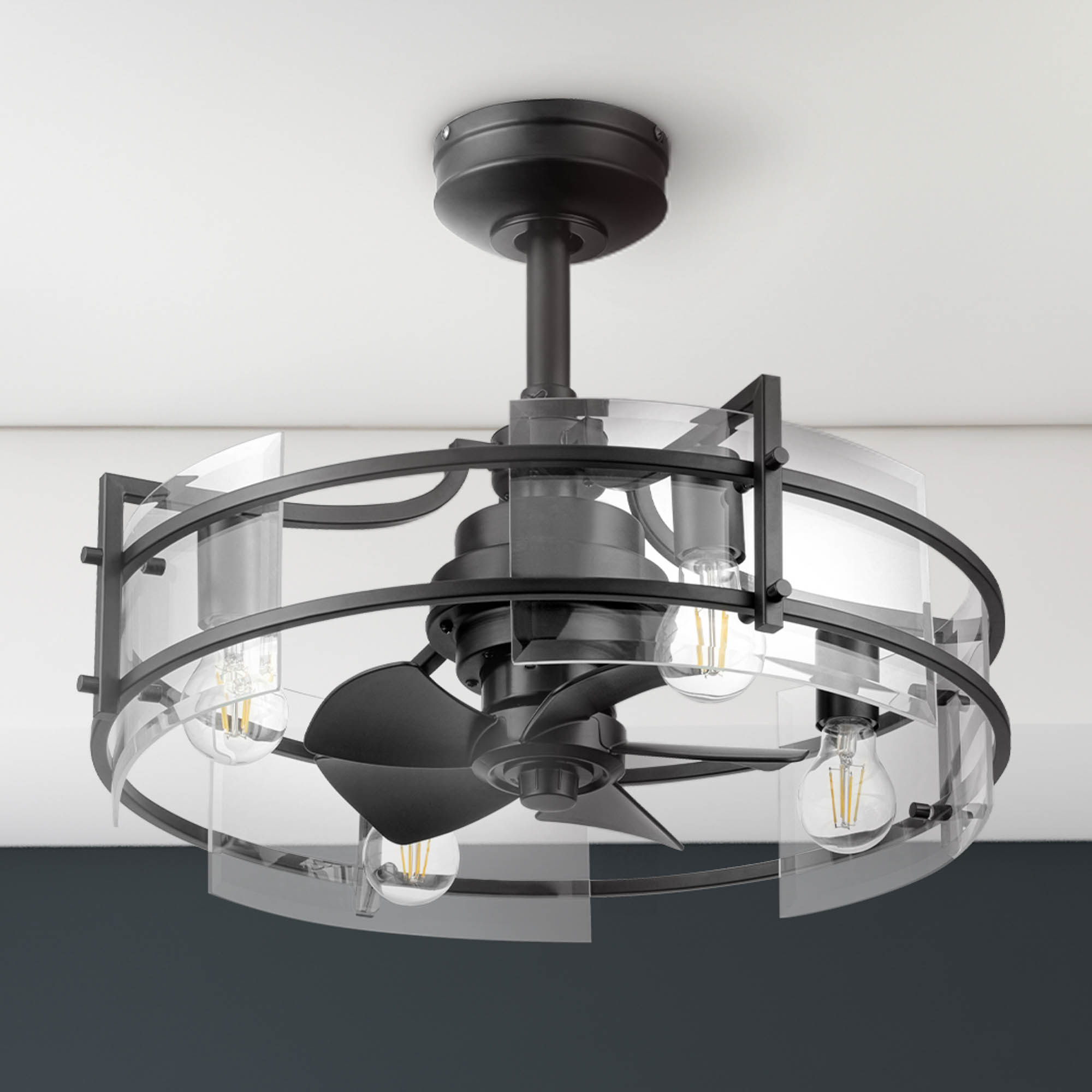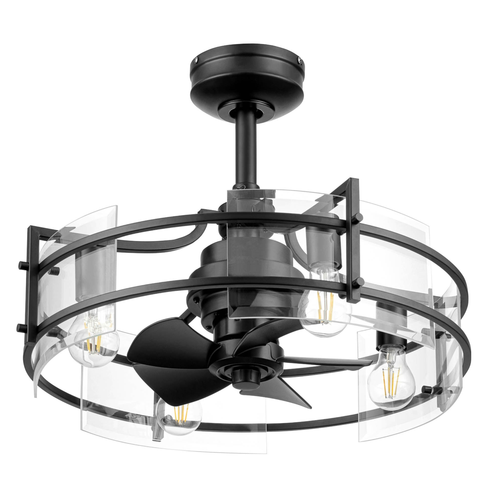Four dimmable LED Bulbs included 5 blade design, matte black finish Rated for indoor use: ideal for smaller rooms, bedrooms, offices, dens, kitchens, or other interior rooms. Remote: remote control with wall mount and batteries included Three speed AC reversible motor; direction can be reversed for seasonal air flow efficiency Matte black color and bevelled clear glass are perfect for modern and contemporary interior design 22 inch diameter; ideal for smaller living spaces Dual mount options with downrod included for standard mounting; angle mounting requires longer downrod (sold separately) ETL listed; UL 507 compliant; headquartered in USA