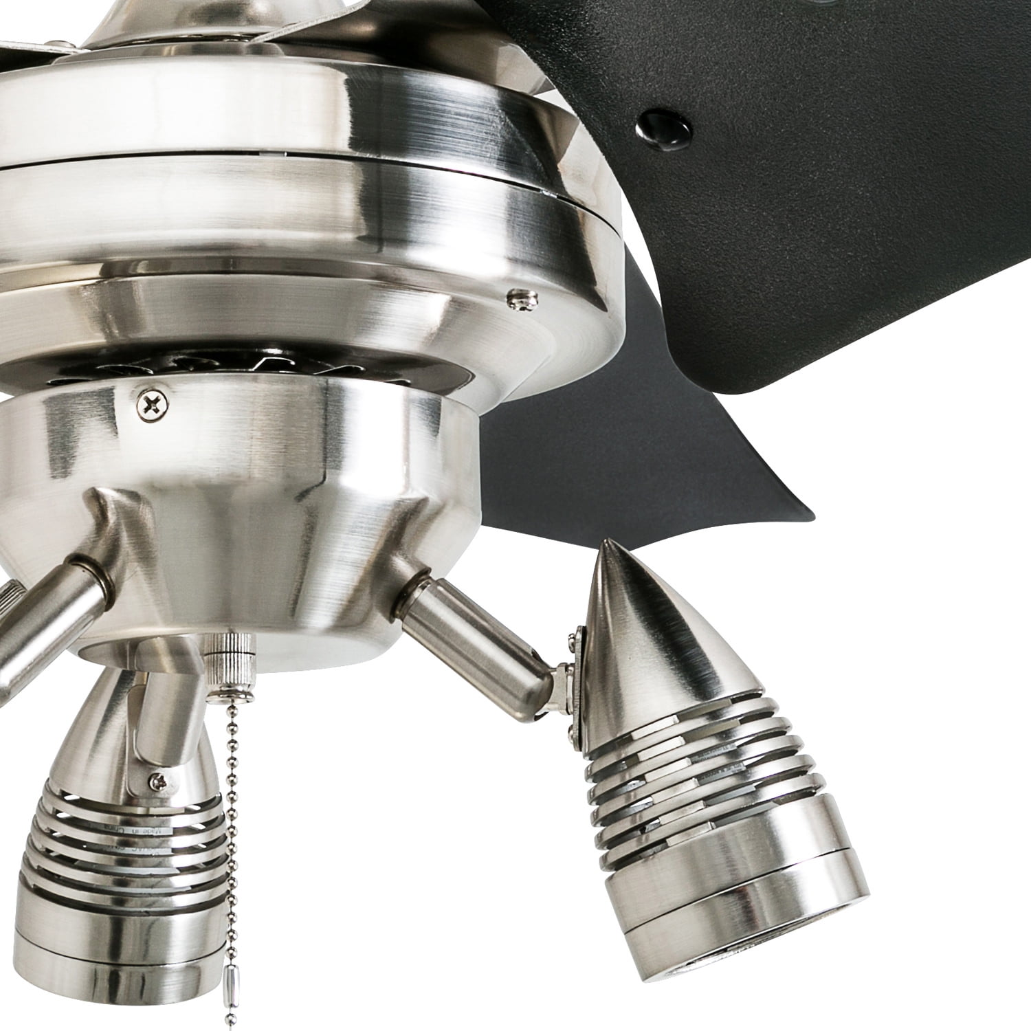 MODERN CEILING FAN: This contemporary ceiling fan features a nicely polished brushed nickel finish with 3 black, progressive pitch blades and a unique, 3 light illumination. DUAL-MOUNT COMPATIBLE: This ceiling fan can be conveniently mounted with a down rod (included: 4″ long x 1″ diameter) or angled mount. EASY-TO-USE CONTROLS: Traditional pull chains are included for easy ” on and off” adjustments but this fan is also compatible with Honeywell ceiling fan remotes. QUIET REVERSIBLE MOTOR: Conveniently quiet, 3 speed, reversible motor that can be run in reverse in the winter to aid in rotating the warm air in the room. We think you’ll enjoy the cool breeze created by this ceiling fan!