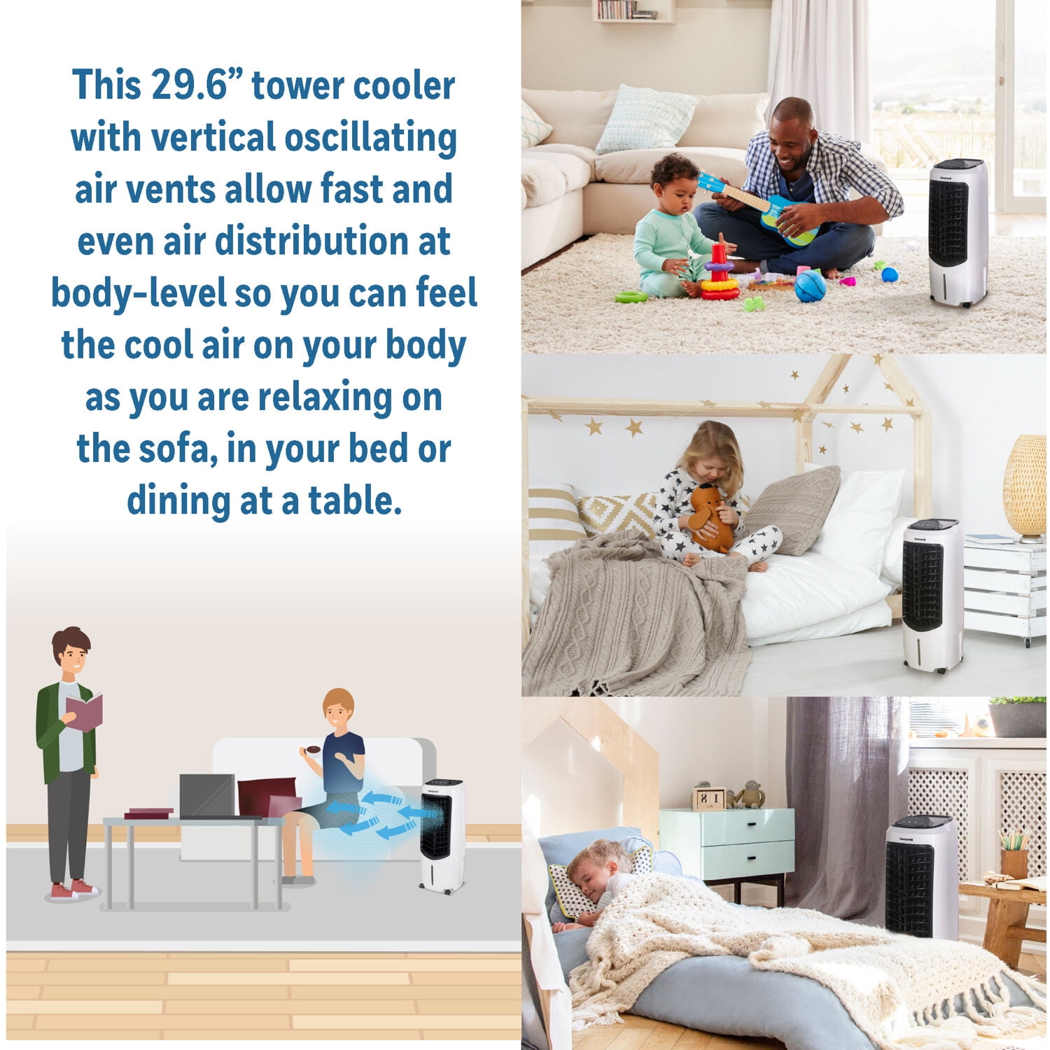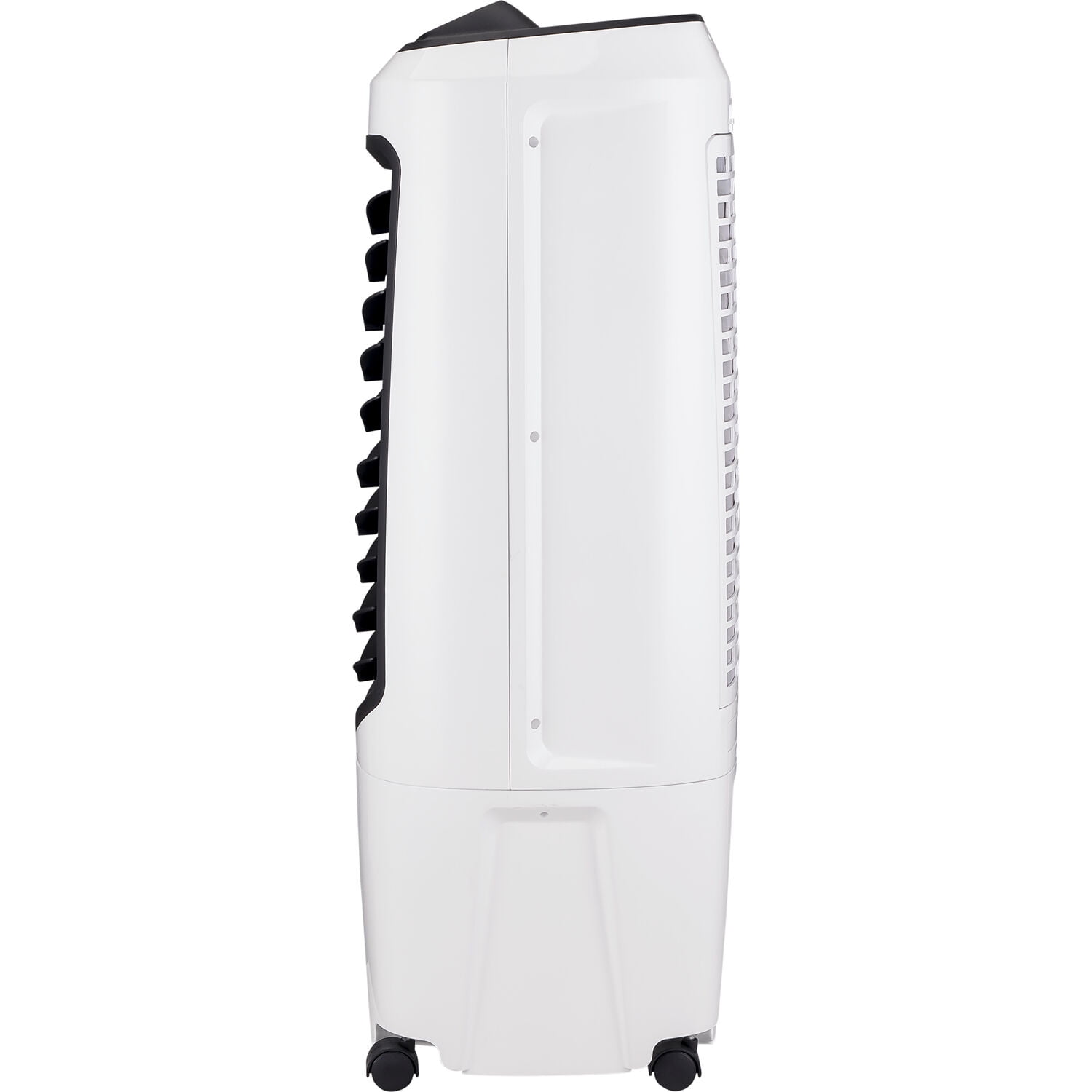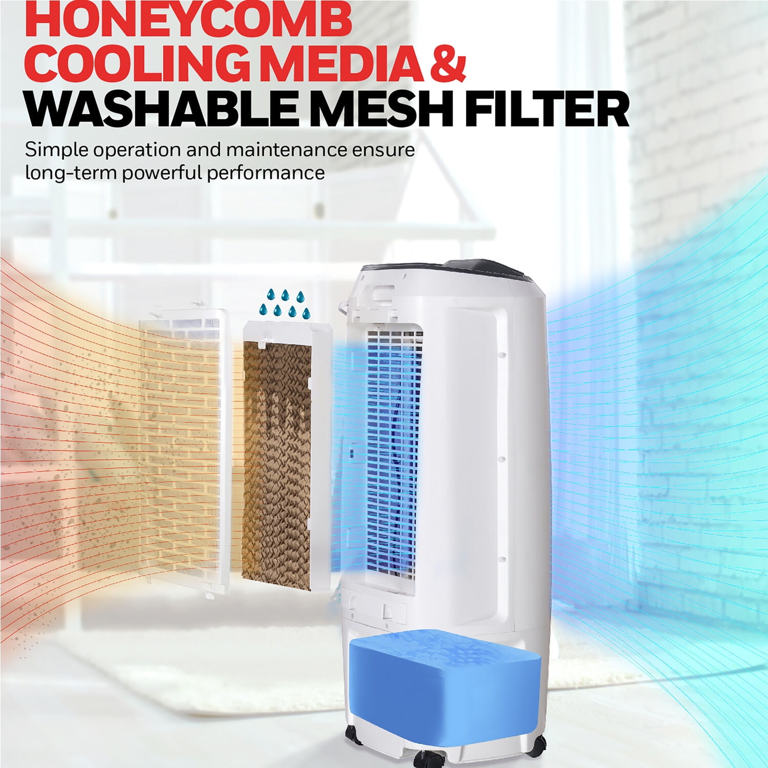 MIMIC THE COMFORT OF A COOL LAKE BREEZE IN YOUR HOME with this compact spot cooler, built to cool your immediate area. Couch, bed, workspace, dining table – the unit is compact and easily portable for personal evaporative cooling. EASY MAINTENANCE, OPERATION WITH CONTINUOUS WATER SUPPLY: Remote control, low water alarm, easy-access water fill door plus a washable and removable dust filter and Honeycomb Cooling media makes for simple operation and maintenance. Conveniently connect to a garden hose for continuous water refills and longer, unattended operation. SPACE-SAVING, EFFECTIVE TOWER COOLING: The special tower design with vertical, oscillating air vents allows air to be distributed evenly for faster and body-level cooling. The slim design with smooth gliding wheels lets you roll it to almost any room as you need it, even more compact spaces. VERSATILE 3-IN-1 APPLIANCE: Set for evaporative cooling or a more gentle, fan-only breeze during warm days, and use as a humidifier to keep air hydrated during the colder, winter months. ENERGY EFFICIENT COOLING FOR DRY CLIMATES: Evaporative air coolers, or swamp coolers, work best in dry regions with relative humidity under 50-60%. Highly energy efficient, with low power consumption, swamp coolers are a great cooling alternative to fans, providing a moist, cool breeze in the comfort of your own home. Best used when the air is hot with low humidity, such as desert areas like the southwestern United States Recommended humidity level is 60% OR LESS for maximum efficiency Non-compressor system cools naturally, efficiently and inexpensively Super low power consumption (only 50 watts) for lower energy bills Carbon dust filter cleanses the air of large dust particles