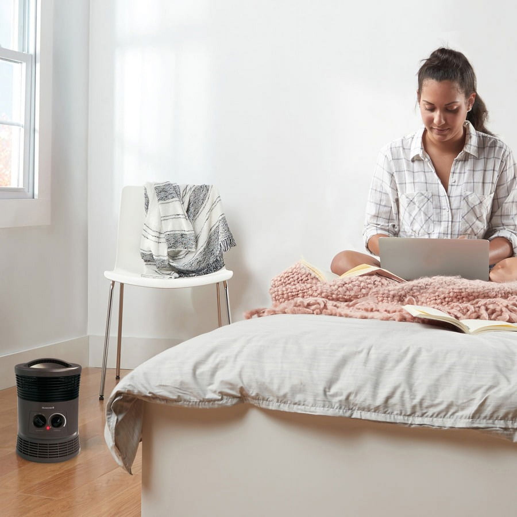 Honeywell Slate Gray 1500W Manual 2 Speed Fan-forced Heater for 150 sq ft 360° surround heat provides consistent warmth throughout the room Dial controls allow for simple manual operation for user convenience Two heat settings and an adjustable thermostat enable precise heat output tailored to your comfort Auto shutoff feature, along with tip-over and overheat protection, promotes safety during use Carry handle makes it easy to transport the heater wherever needed