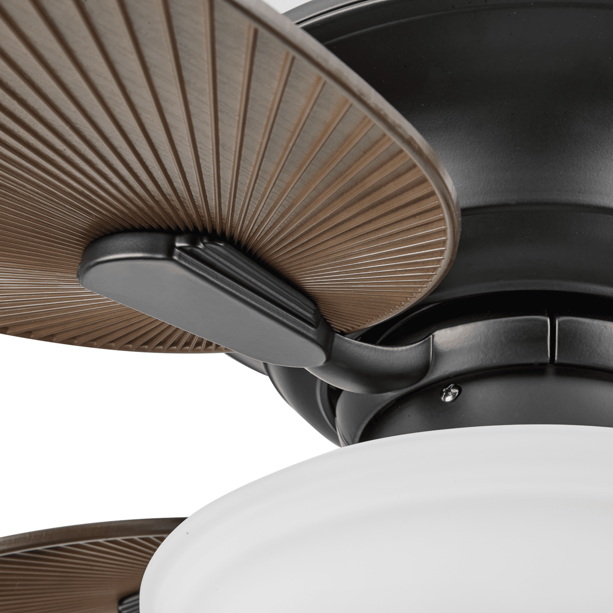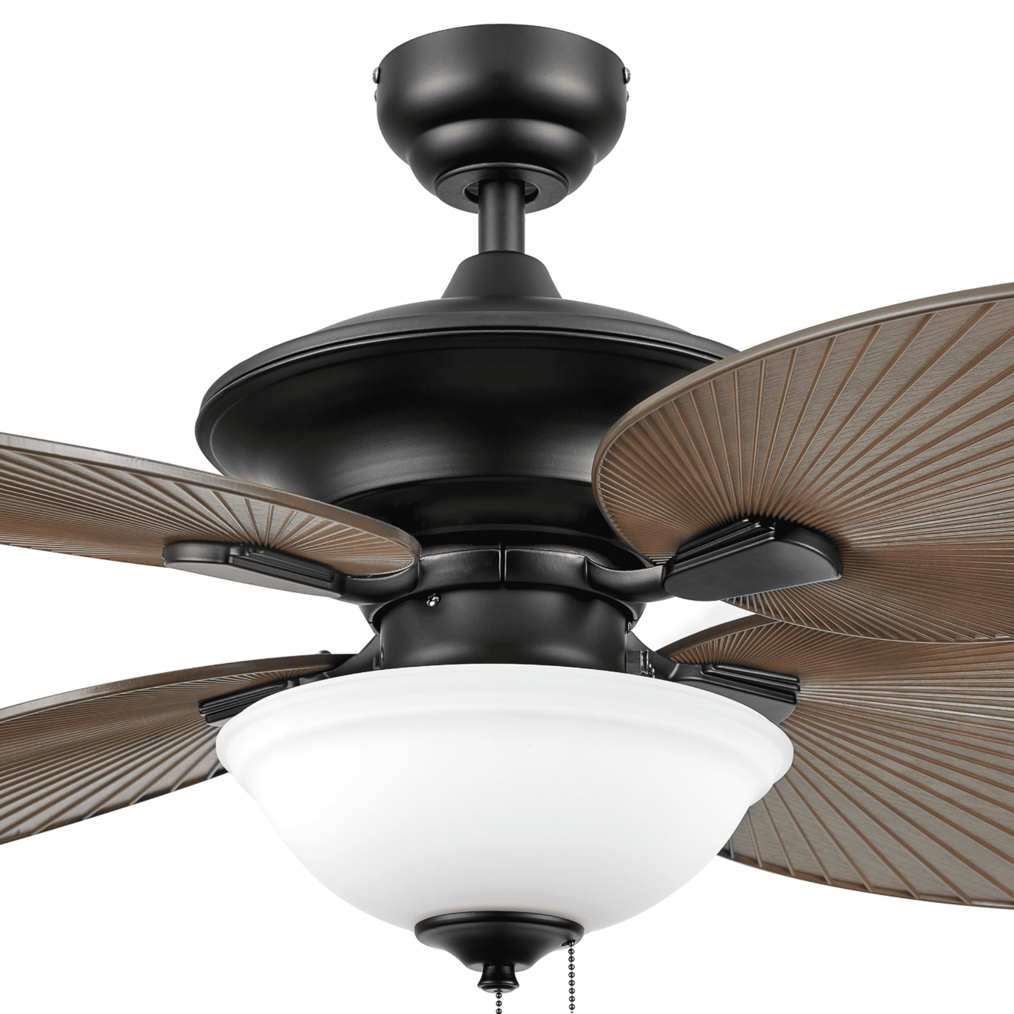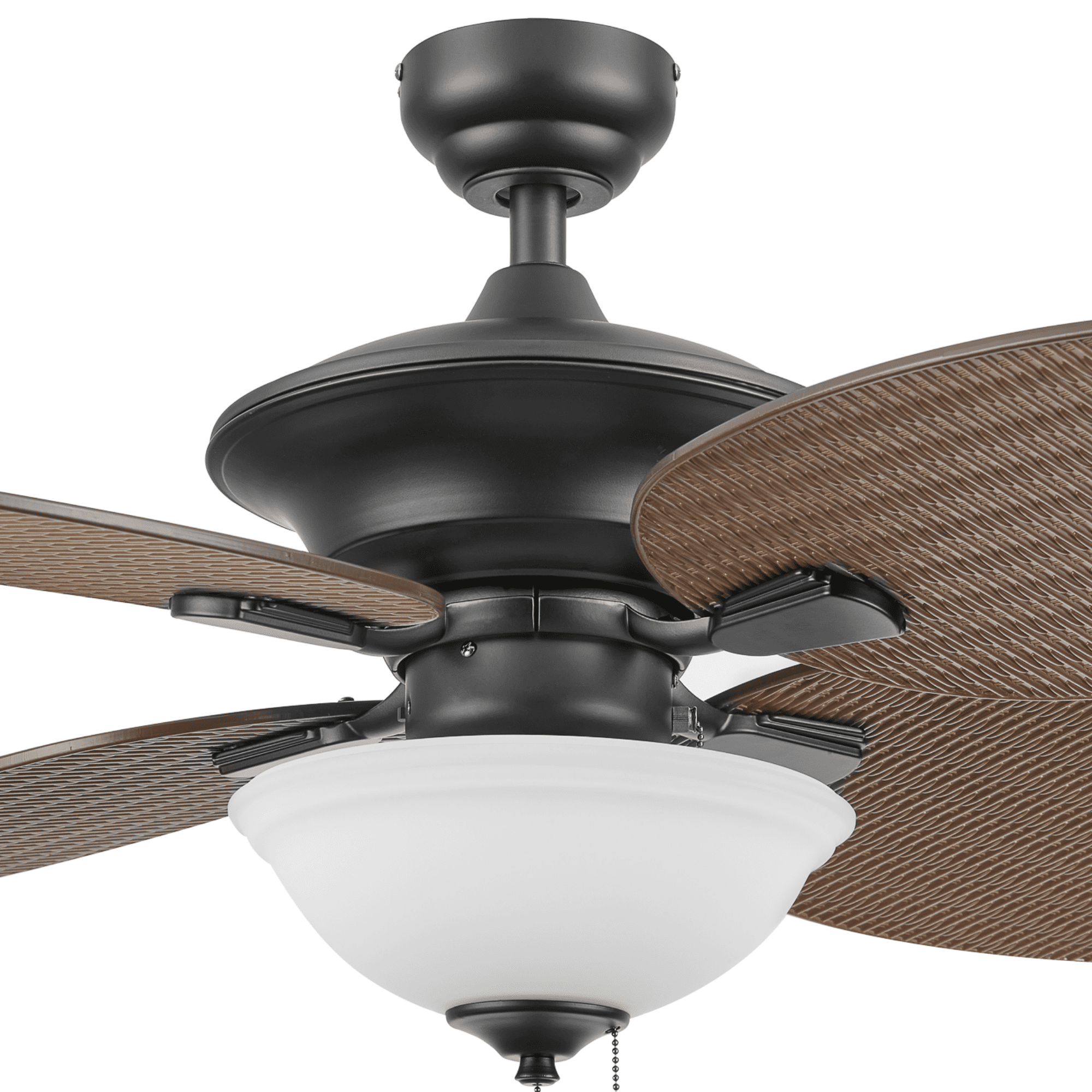 New transitional style indoor/outdoor ceiling fan is ETL listed as damp rated and can be hung indoors and under covered outdoor spaces such as patios, porches & garages Dual-mount ceiling fan can be hung from standard or angled ceilings using the 4-in downrod that is included Easy-to-use pull chains are included for quick adjustments to the light and speed settings; also compatible with universal ceiling fan remote controls (sold separately) Frosted glass bowl light kit houses two E26 A15 LED bulbs that are dimmable, 800 lumens, 8.5 watts, 3000K color temperature (included) 52 inch ceiling fan is ideal for medium to large sized spaces, up to 400 sq ft Quiet, reversible three-speed motor efficiently circulates cool air in the summer and warm air in the winter, cutting down on energy costs Limited lifetime motor warranty, 1 year parts