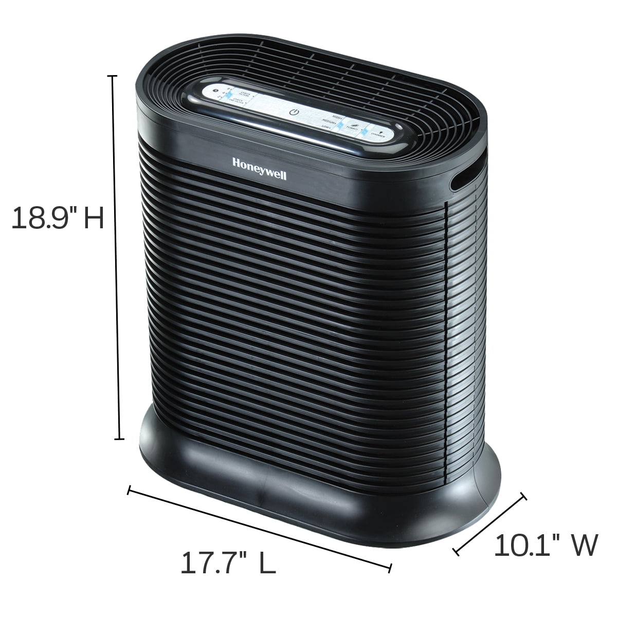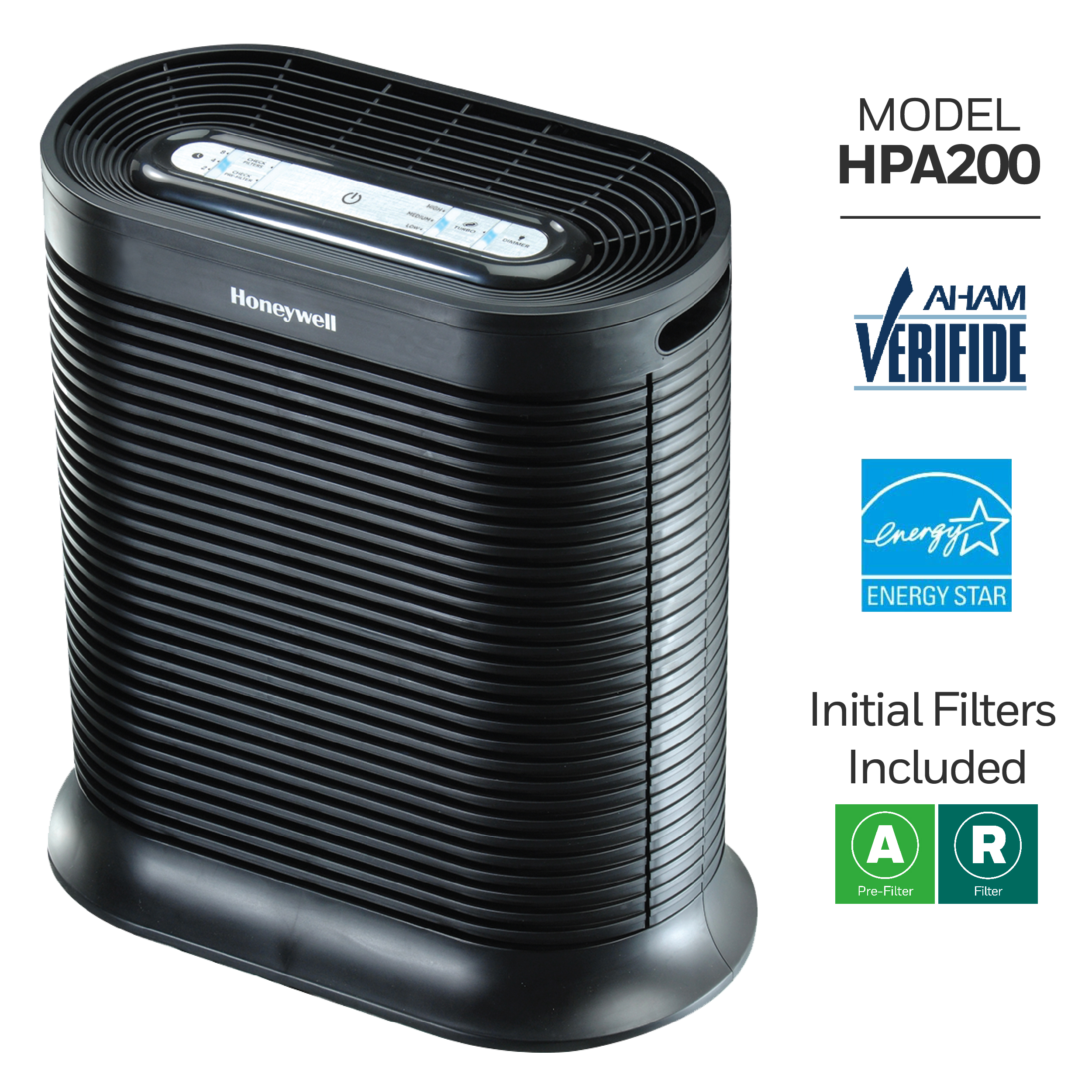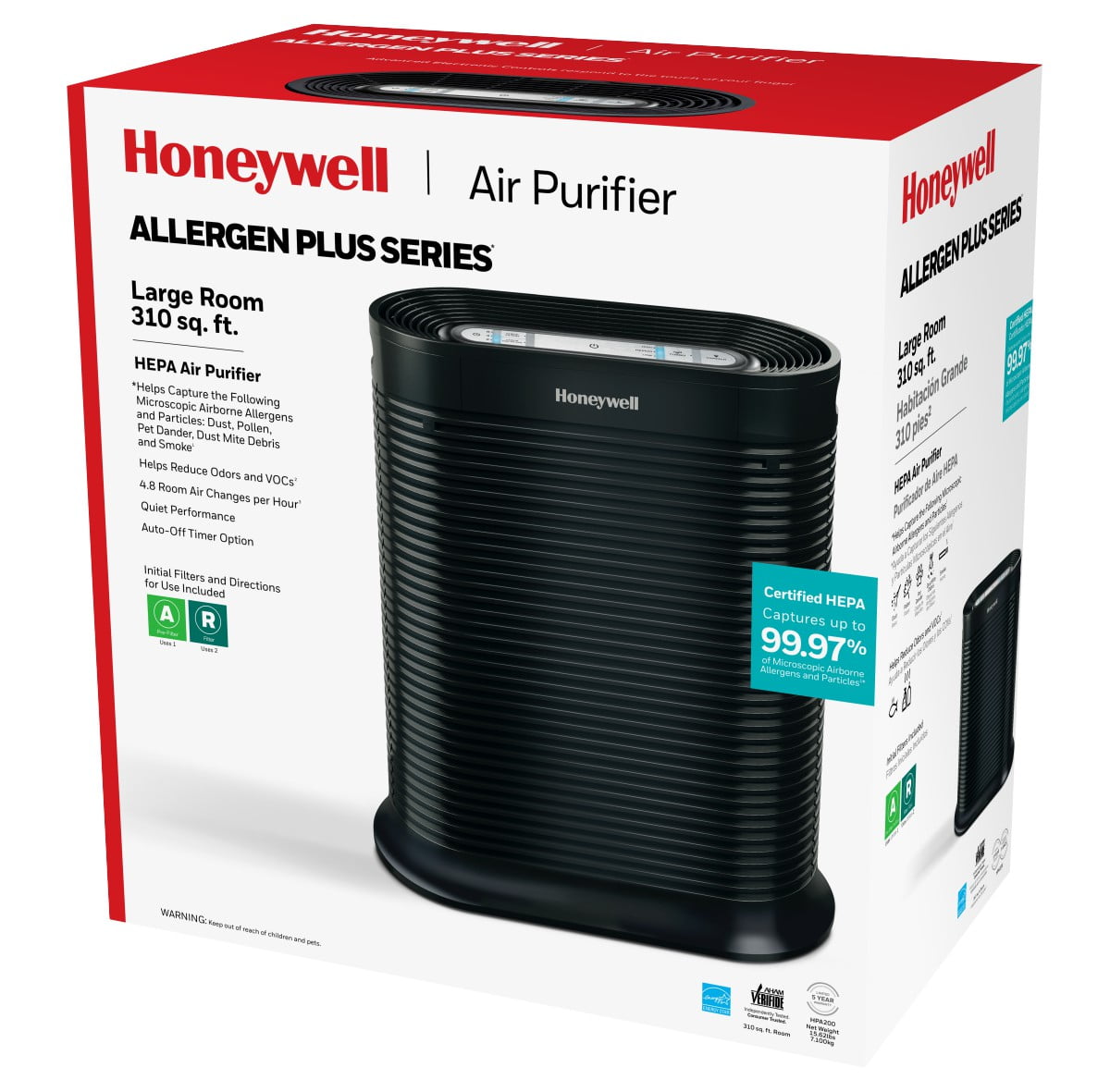 Recommended for Large Rooms (310 sq. ft.) Captures up to 99.97% of microscopic allergens, 0.3 microns and larger* Reduces odors, VOCs, and certain germs*,** Filters and circulates Room Air 5X perhour when used in the recommended room size Quiet Operation 4 air cleaning levels: Germ, General Clean, Allergen and Turbo Turno Power Clean setting for fast cleaning action Automatic shut-off timer– 2, 4 or 8 hours Dimmer Option for control panel lights Electronic filter replacement reminders Onboard User Reference Guide AHAM Verified for use in a 310 sq. ft. rooom CADR Ratings: 200 for smoke, 190 for dust, 180 for pollen ENERGY STAR qualified Color: black 5-year limited warranty Recommended filter replacement: True HEP A Filter(HRF-R2) – 1x/yr. Odor Reducing Pre-Filter (HRF-AP1 or HRF-APP1) 4x/yr To ensure stated product performance, use only Certified Honeywell Replacement Filters From the air that passes through the filter, 0.3 microns and larger Based on independent testing report 100954017COL-001 Based on the Nov. 2014 Cascade Survey Research results reporting 80 out of 84 (95%) surveyed Allergists that recommend a brand of portable air purifiers to their patients, recommend “Honeywell” air purifiers. This product earned the ENERGY STAR by meeting strict energy efficiency guidelines set by the U.S. EPA. U.S. EPA does not endorse any manufacturer claims of healthier air from the use of this product.