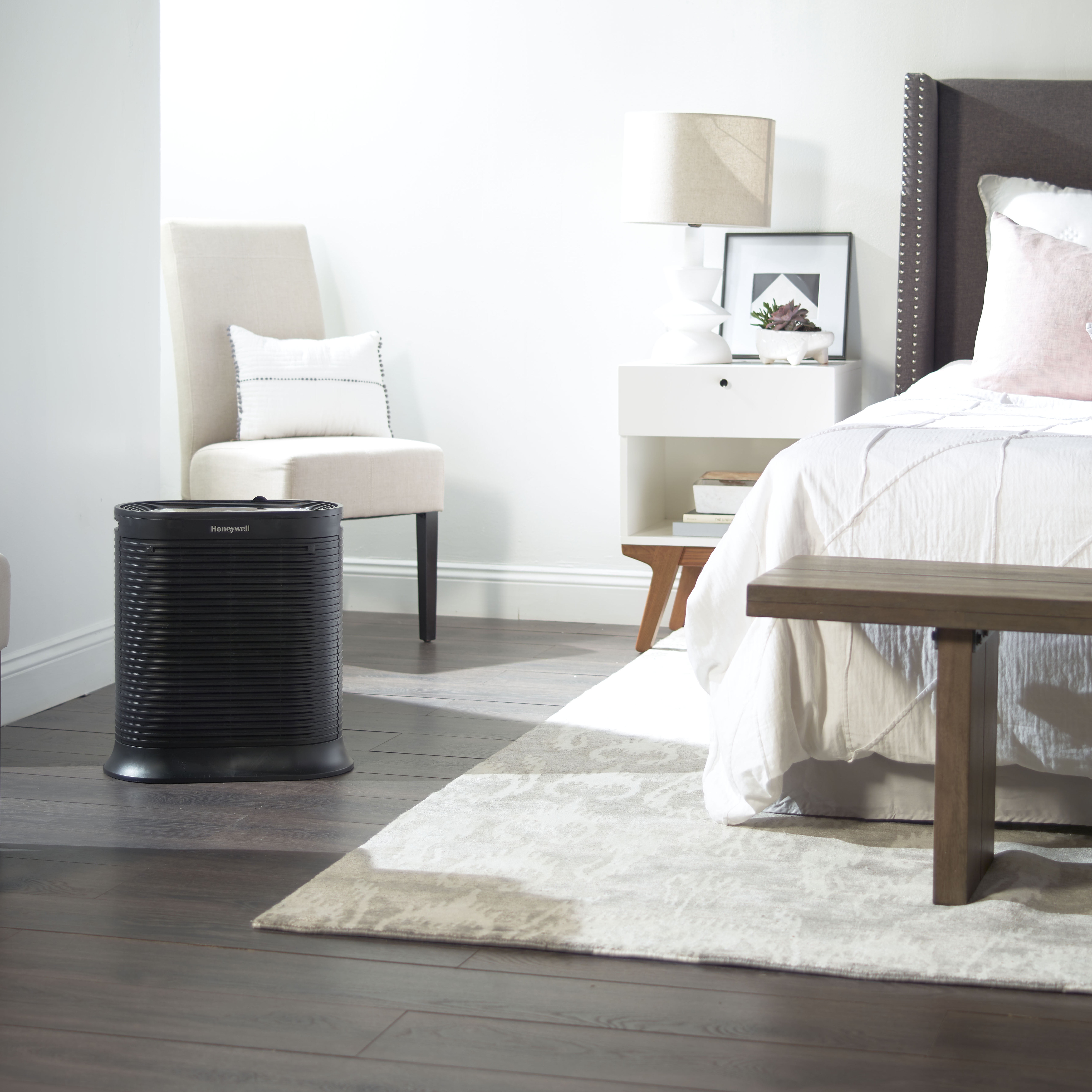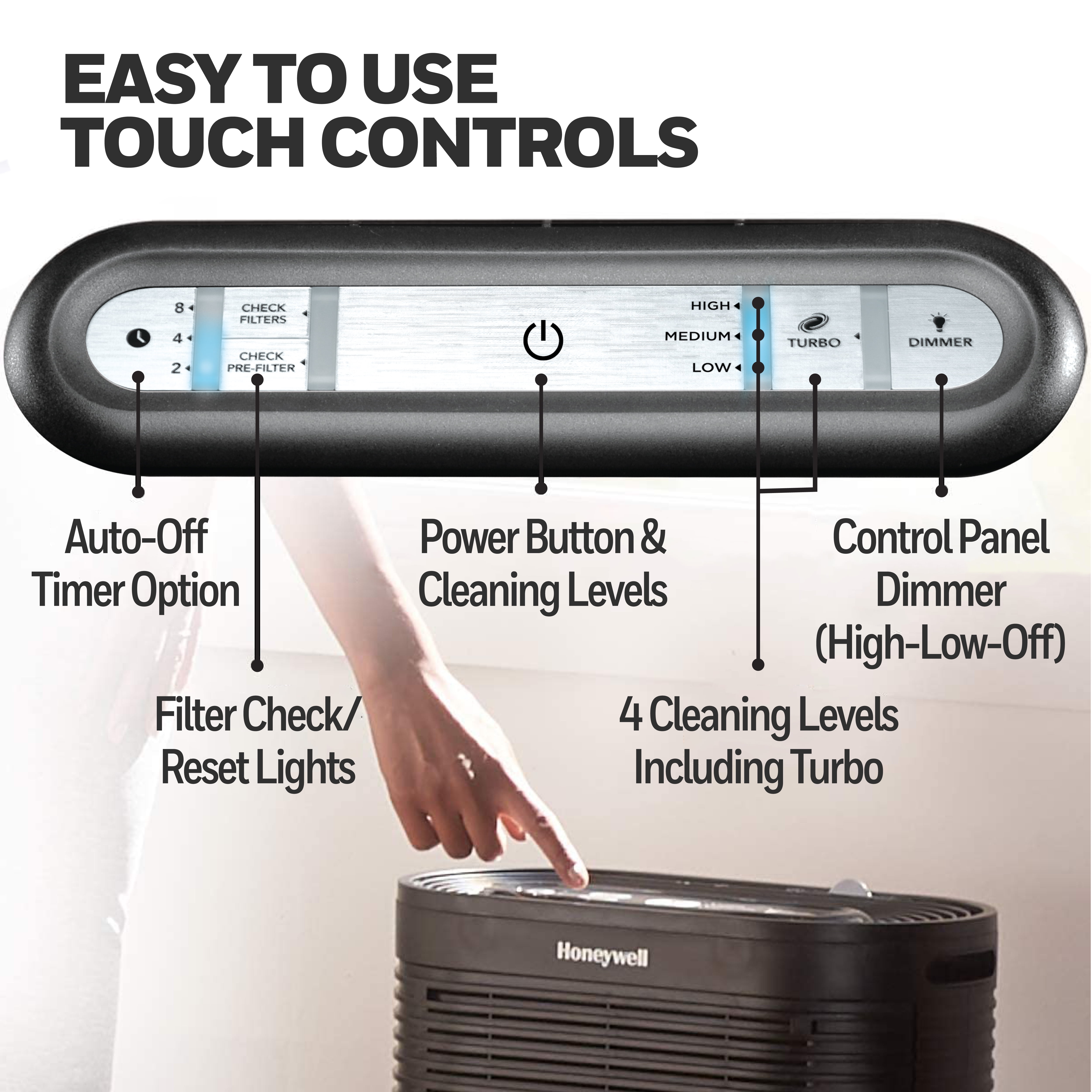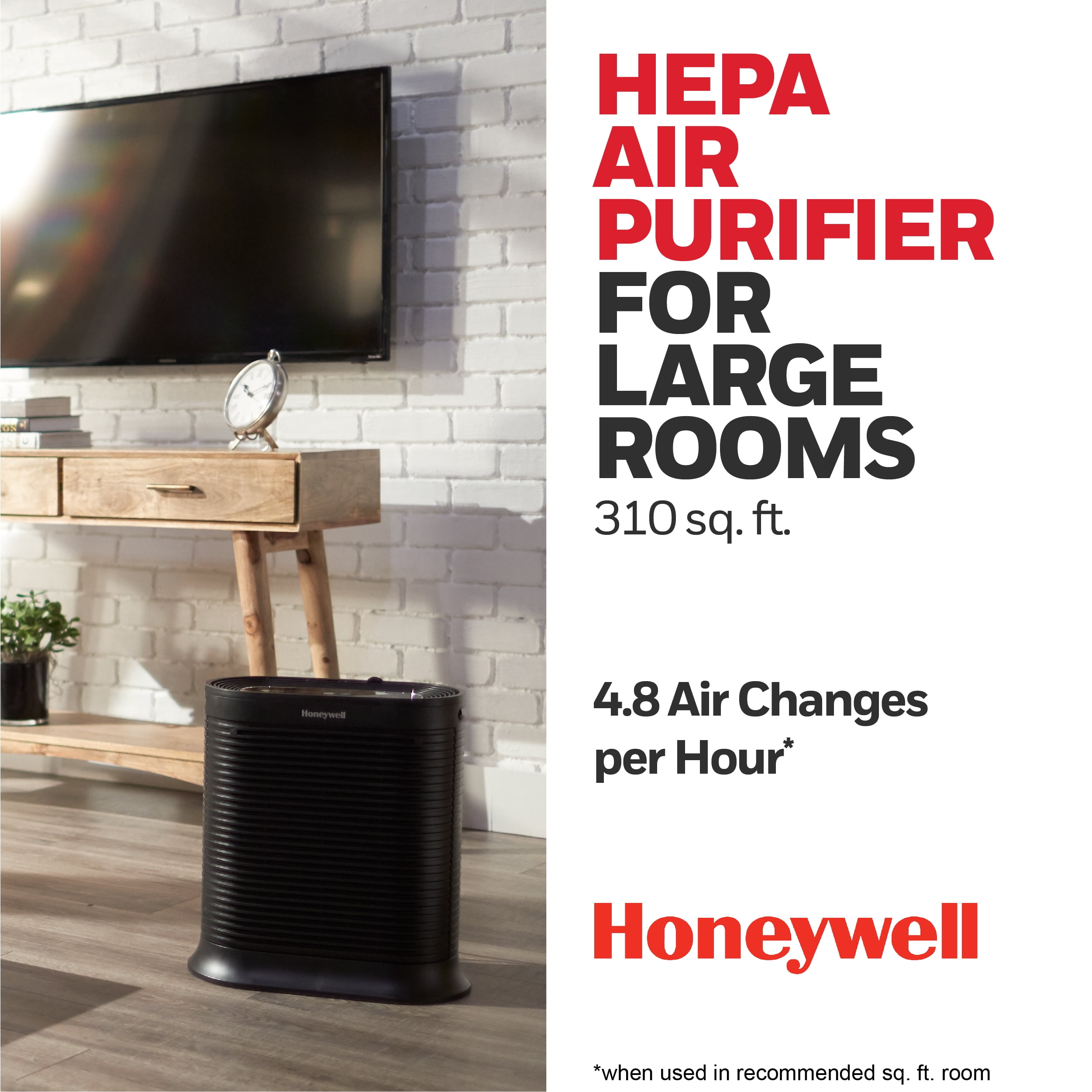 Recommended for Large Rooms (310 sq. ft.) Captures up to 99.97% of microscopic allergens, 0.3 microns and larger* Reduces odors, VOCs, and certain germs*,** Filters and circulates Room Air 5X perhour when used in the recommended room size Quiet Operation 4 air cleaning levels: Germ, General Clean, Allergen and Turbo Turno Power Clean setting for fast cleaning action Automatic shut-off timer– 2, 4 or 8 hours Dimmer Option for control panel lights Electronic filter replacement reminders Onboard User Reference Guide AHAM Verified for use in a 310 sq. ft. rooom CADR Ratings: 200 for smoke, 190 for dust, 180 for pollen ENERGY STAR qualified Color: black 5-year limited warranty Recommended filter replacement: True HEP A Filter(HRF-R2) – 1x/yr. Odor Reducing Pre-Filter (HRF-AP1 or HRF-APP1) 4x/yr To ensure stated product performance, use only Certified Honeywell Replacement Filters From the air that passes through the filter, 0.3 microns and larger Based on independent testing report 100954017COL-001 Based on the Nov. 2014 Cascade Survey Research results reporting 80 out of 84 (95%) surveyed Allergists that recommend a brand of portable air purifiers to their patients, recommend “Honeywell” air purifiers. This product earned the ENERGY STAR by meeting strict energy efficiency guidelines set by the U.S. EPA. U.S. EPA does not endorse any manufacturer claims of healthier air from the use of this product.