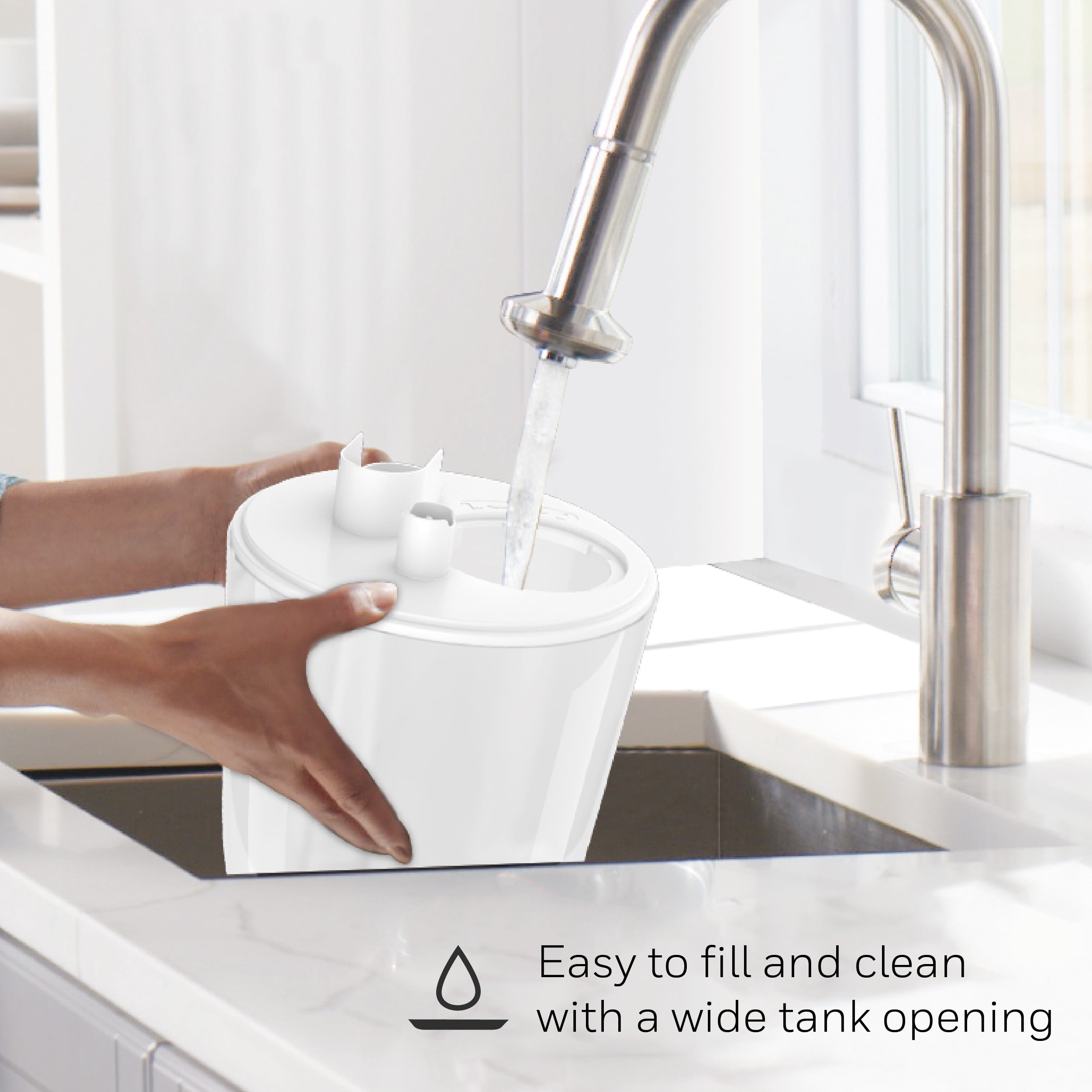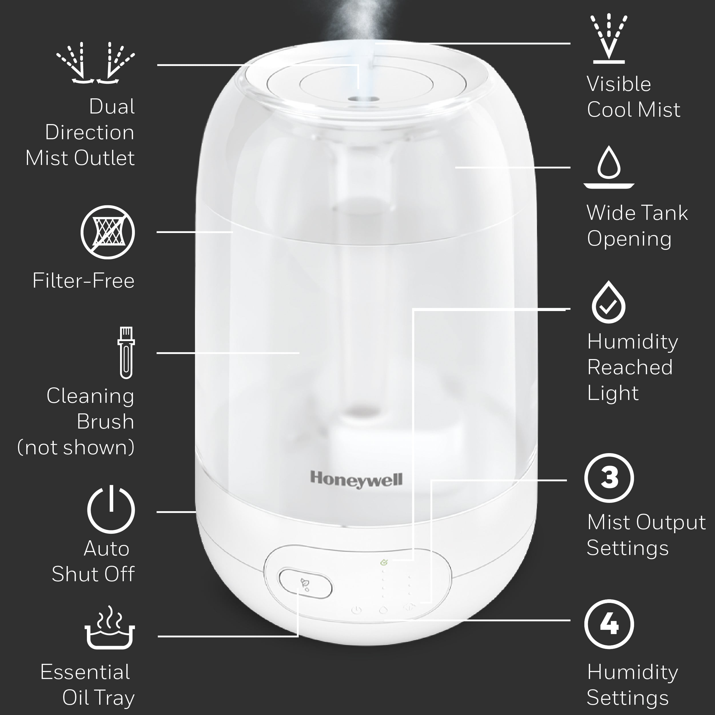 The Honeywell Ultra Plus Cool Mist Humidifier (HUL565) provides a soothing, cool mist. During cold and flu season or when the air is simply just dry, you can rely on this humidifier for your entire family. It has a compact footprint to fit on desktops or nightstands, but large capacity and is ideal for large-sized rooms up to 500 sq. ft.. Honeywell humidifiers for bedroom and beyond add necessary moisture to the air, and help ensure proper humidity levels in your home. Indoor humidity levels between 40-60% can help relieve cough and congestion, keep throat and nasal passages hydrated, temporarily relieve dry air discomfort, protect furniture, reduce static electricity and even keep plants healthier. This Honeywell humidifier is a cool mist humidifier, and produces a fine, visible cool mist with a dual direction mist outlet. It has an ultra-quiet operation and an adjustable digital humidistat with 4 preset comfort levels to let you customize the moisture level in the air, making it a great choice for your family, even as a kids or baby humidifier. Plus, it has an essential oil tray, large tank opening that makes it easy to fill and clean, no filters to replace and it automatically shuts off when empty. It features an up to 40 hour run time.