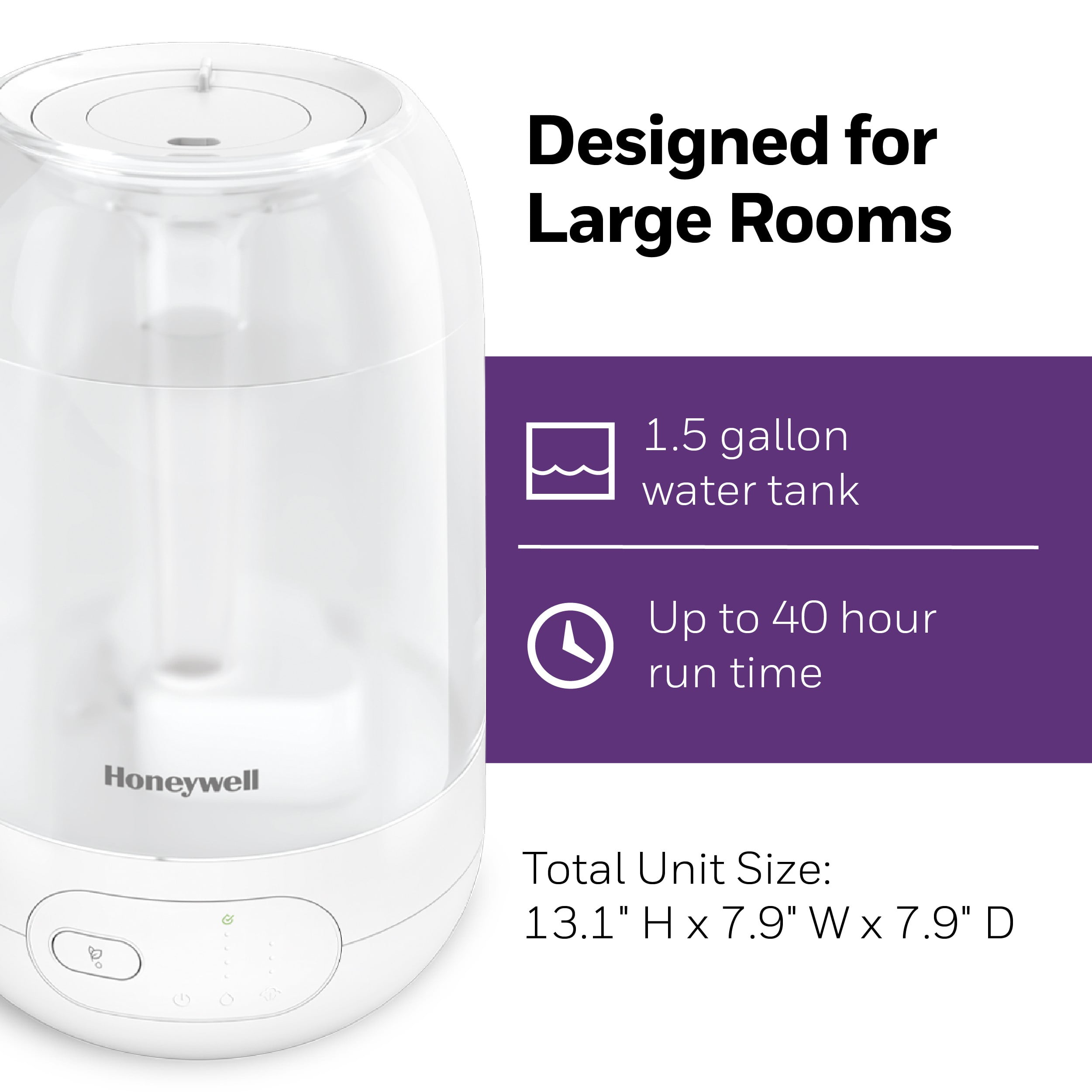 Cool mist humidifier – Honeywell Ultra Plus Cool Mist Humidifier (HUL565) has a small footprint but large 1.5 gallon capacity, and helps ensure proper humidity levels in large rooms. Indoor humidity between 40-60% can help relieve dry air discomforts. Humidifiers for bedrooms and more – Cool mist humidifier has an essential oil tray, electronic controls and adjustable digital humidistat with 4 preset comfort levels. Has a dual direction mist outlet, making it a great choice as a kids or baby humidifier. Easy to use – This humidifier produces a visible cool mist with 3 mist settings and is ideal for large-sized rooms. It has no filter to change, wide tank opening for easy cleaning & refill, up to 40 hour run time & auto shut-off. Cough and congestion relief – – Humidifiers for home can be helpful during cold and flu season, when it’s difficult to sleep with cough and congestion. A humidifier can provide temporary relief by adding necessary moisture to the air. A brand you can trust – Honeywell has been keeping families comfortable in their homes for over 100 years with our full line of humidifiers, filters and more.