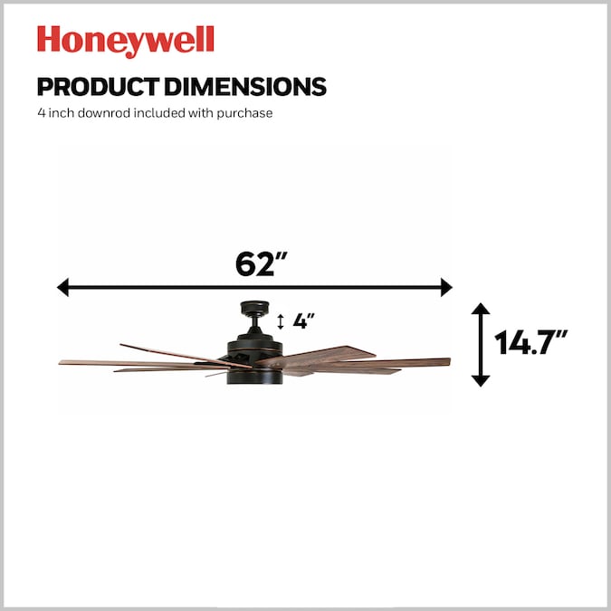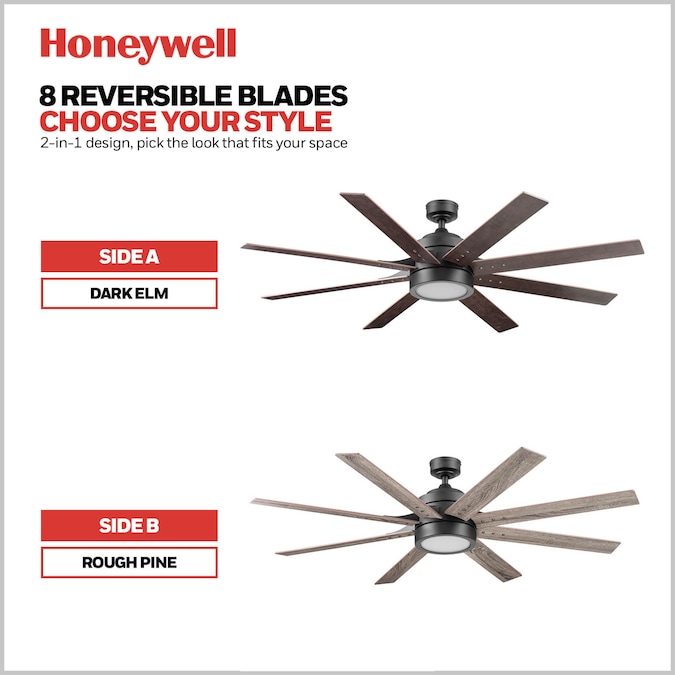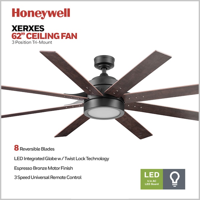 The Honeywell Xerxes is a 62 inch indoor ceiling fan with lights, perfect for your large to extra-large sized modern space(s). This bronze ceiling fan features an integrated LED light kit and eight reversible blades in rough pine and dark elm finishes. With its three speed, reversible motor, this remote-controlled fan will provide comforting air circulation year-round.