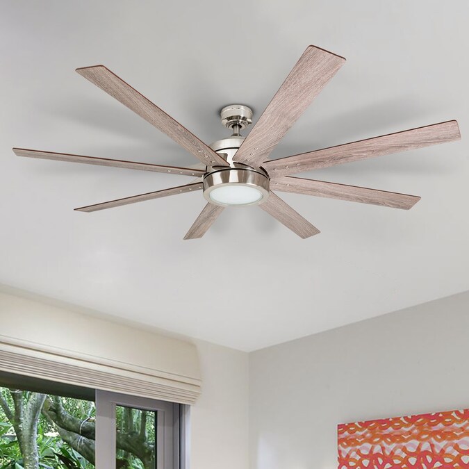 The Honeywell Xerxes is a 62 inch indoor ceiling fan with lights, perfect for your large to extra-large sized modern space(s). This brushed nickel ceiling fan features an integrated LED light kit and eight reversible blades in gray oak and french oak finishes. With its three speed, reversible motor, this remote-controlled fan will provide comforting air circulation year-round.