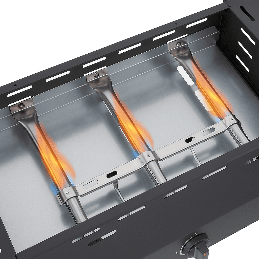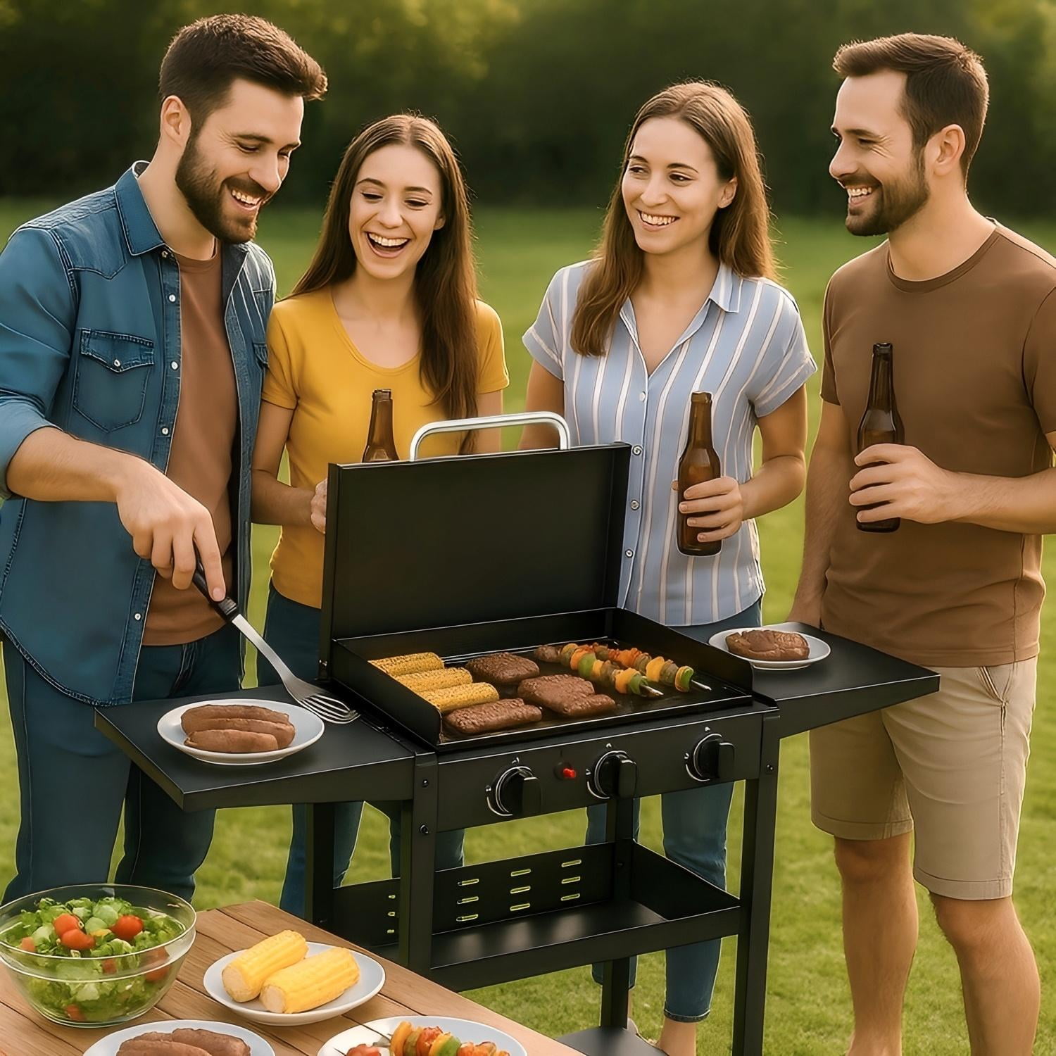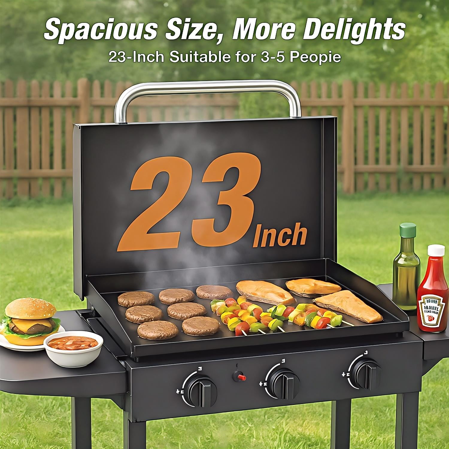 Professional-Grade Triple-Burner Griddle System: Unleash 24,500+ BTU cooking power with three precision-calibrated burners for rapid preheating and consistent heat. Master high-heat searing, delicate simmering, and everything between across the expansive 23″ commercial-grade steel cooktop—ideal for multitasking entrees, sides, and appetizers. Camp-to-Campsite Versatility: Engineered for any culinary challenge, from backyard feasts to wilderness meals. Sear 24+ burgers, craft breakfast spreads, or whip up wok-style stir-fries. Integrated side shelves provide instant workspace, while rugged stability tackles uneven terrain. Intelligent Heat Zones & Fuel Optimization: Command independent burner control: crank one zone to sear steaks (18,000 BTU) while maintaining low-and-slow heat for sauces or sides. Proprietary burner design maximizes propane efficiency, delivering extended runtime for off-grid adventures or marathon cooking sessions. Military-Grade Durability, Adventure-Ready Portability: Rust-proof stainless steel construction and reinforced joints defy weather extremes. Collapsible fold-and-go legs and a lightweight frame enable trunk-friendly storage and instant setup at beaches, RV sites, or game-day parking lots. No-Sweat Cleanup, Pro Kitchen Hygiene: The grease management system traps drippings in a removable tray, while the seamless non-stick surface wipes clean in seconds. Dedicated drip zones prevent flavor cross-contamination, ensuring every meal tastes as intended.