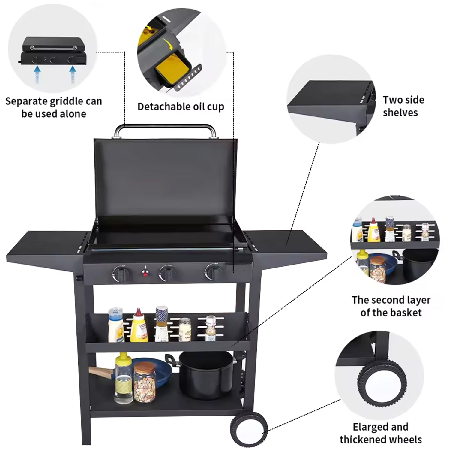 HONGGE 3-Burner Propane Gas Griddle Flat Top Grill with Side Shelf for Outdoor BBQ & Camping