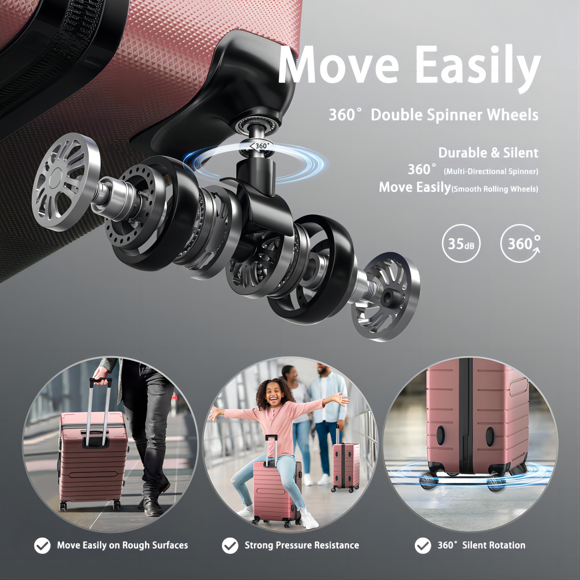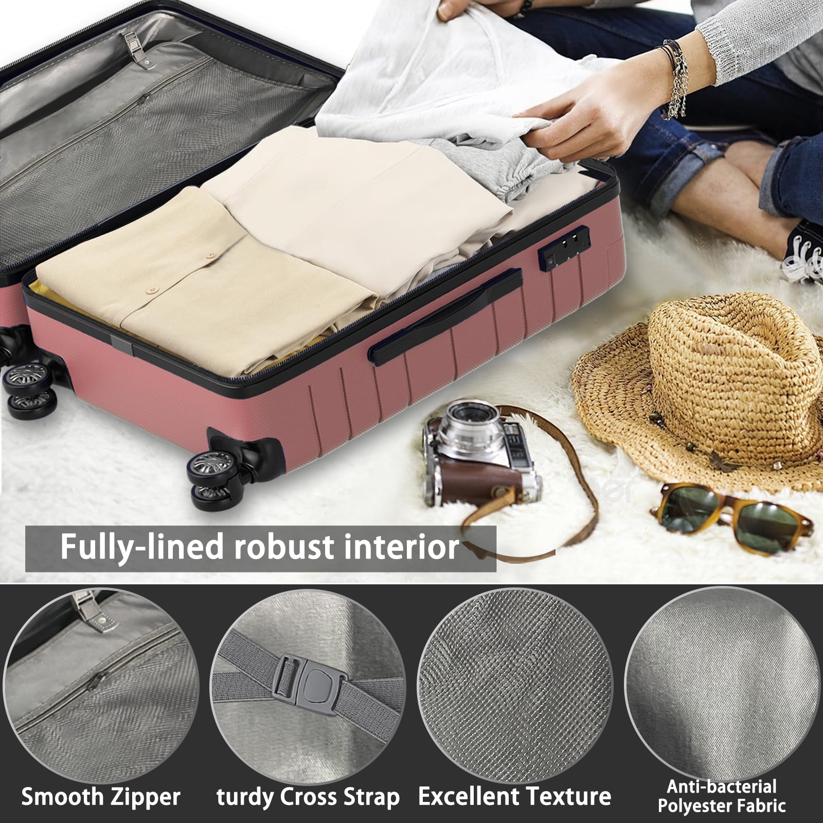 [Top-Quality Luggage Sets]: Crafted from brand new, extra-thick PC+ABS materials for a durable, lightweight, and impact-resistant hard shell. The textured finish adds scratch resistance, keeping your luggage looking beautiful even after a trip. The 20in suitcase is perfect for carry-on use on airplanes (non-expandable), while the 24in & 28in sizes expand by 20% to provide more space. [Silent & Smooth Multi-directional Spinner Wheels]: Featuring innovative soft TPU and lubricating balls within the wheels, our luggage moves quietly and smoothly with 360° double-wheel rotation. Our luggage has passed a 100% perfect drop test and a walking test (a professional luggage quality test: the luggage can carry 15kg and travel 40km at a speed of 10km/h). It’s the ideal choice for extended travels and business trips. [Well-Designed Ergonomic Sturdy Handles]: The adjustable and sturdy ergonomic aluminum 3-step telescoping handle allows for easy maneuvering in tight spaces and provides effortless movement. Smooth transitions make carrying more comfortable. We’ve added two reinforcement brackets on the backside of the top carry handle and side carry handle to prevent hardshell cracking, as well as two soft rubber grips to protect your fingers when lifting heavy items. [Side-Mounted TSA Lock for Travel Security]: Our side-mounted TSA lock allows only TSA agents to inspect your bags without damaging the lock during travel. The zippers are designed to resist piercing by sharp tools, such as pens, offering better protection for your belongings and privacy. Inside, there’s a full-zip interior divider and cross straps to keep your items organized. [Large Space, Thoughtful Details]: Unzip to reveal two spacious lined compartments, one with elasticated cross straps and the other with a zip-divider mesh pocket and organizational pockets. You can efficiently pack your suitcase with smart organization. There’s also a small pouch between the hard shells for storing items like toothbrushes, wallets, and makeup.