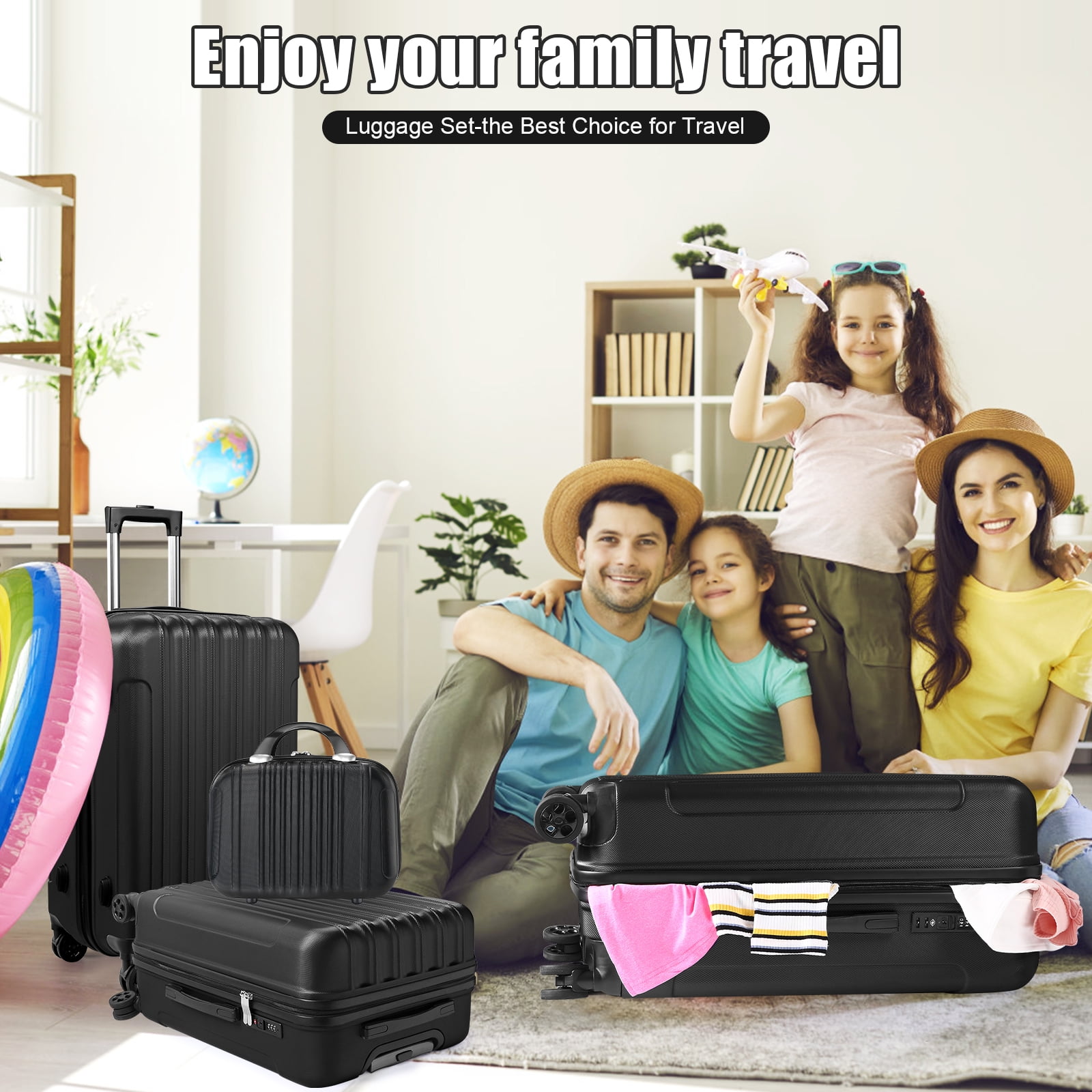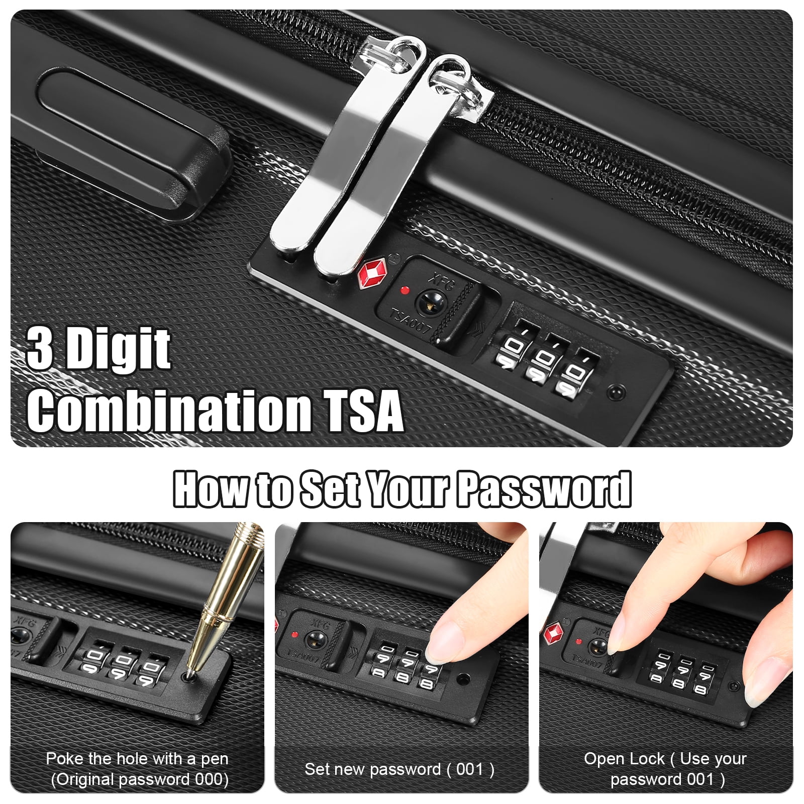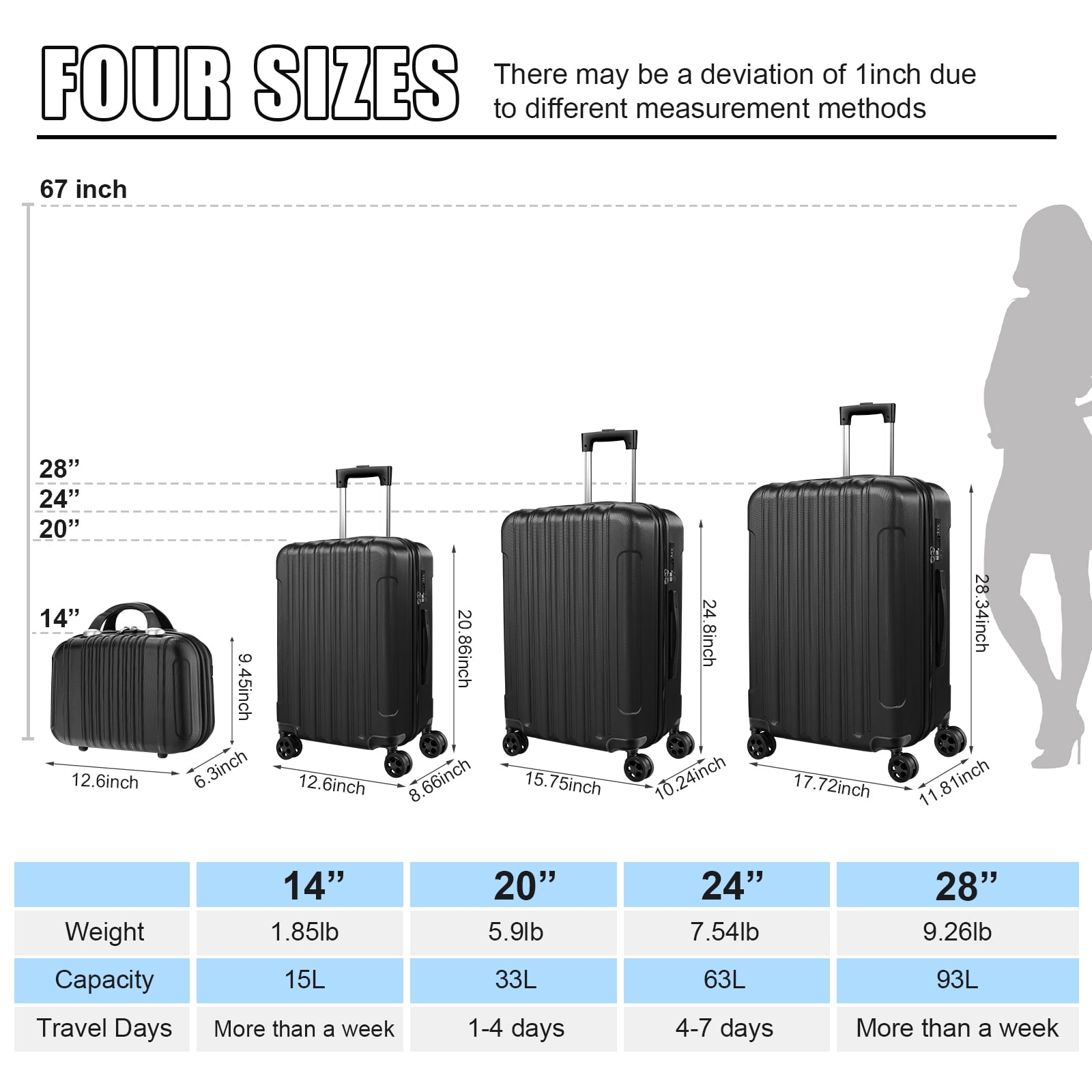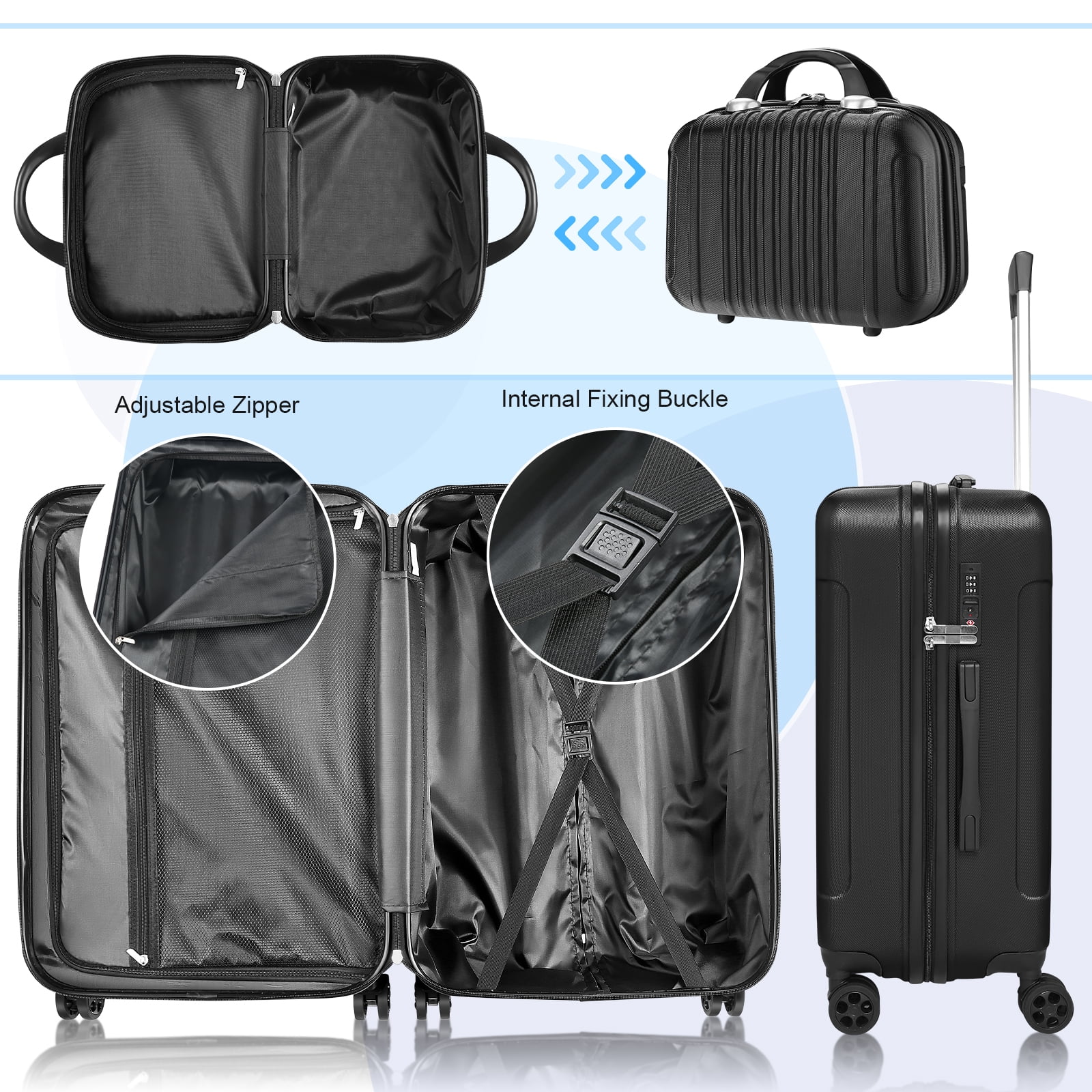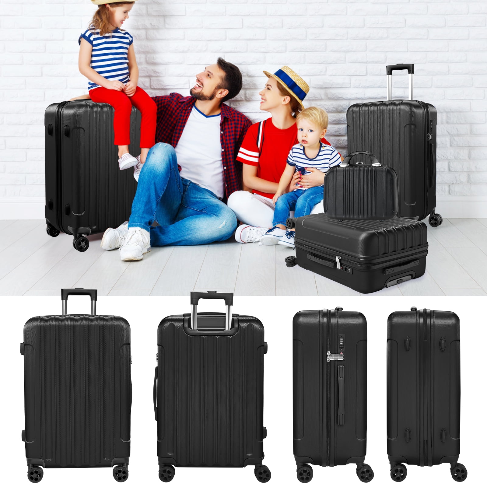 ※: One Set for All Trips: With four different sizes tailored to diverse travel needs, from business trips to family vacations, this set is your ultimate companion for any journey. Includes 4 different sizes for different distance, including 14” handbag (Can be put on top of our suitcases for small items such as cosmetics, water glasses, etc), 20” Carry-On Suitcase (Meets carry-on size restrictions for those traveling domestically and looking to stay light), 24” Checked-Medium Luggage and 28” Checked-Large Luggage (Maximize your packing power and the ideal checked bags for longer trips). Note: 14” is a handbag with an elastic strap at the back which has no TSA lock or wheels. ※: Top Quality Luggage Sets: Made with lightweight 100% ABS construction and scratch-resistant textures, our suitcases ensure exceptional durability, even after multiple trips, keeping your belongings safe and secure. ※: Ergonomic Design: Featuring a full-zip interior divider with a mesh bag and cross-buckle strap, along with durable elastic top and side handles with inner rubber grips, our suitcases offer comfort and convenience for hassle-free travel. ※: Easy Maneuverability: The easy push-button aluminum telescoping handle and upgraded 360° double spinner wheels allow for effortless carrying and smooth navigation through any terrain or crowded space. Built-in Style Secure TSA Lock: Integrated TSA locks provide added peace of mind, ensuring your belongings are protected throughout your journey. ♥: Experience the perfect blend of versatility, durability, comfort, and security with our 4-Piece Suitcase Set – your essential travel companion.