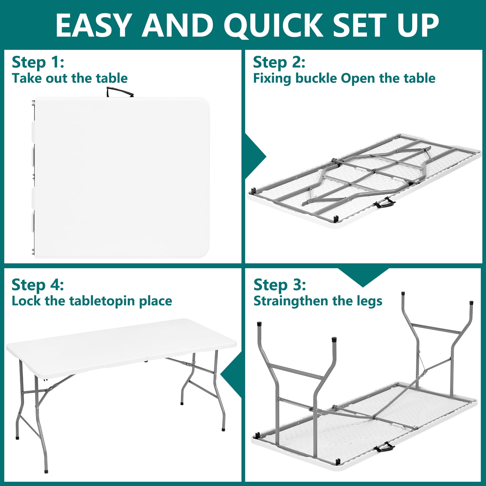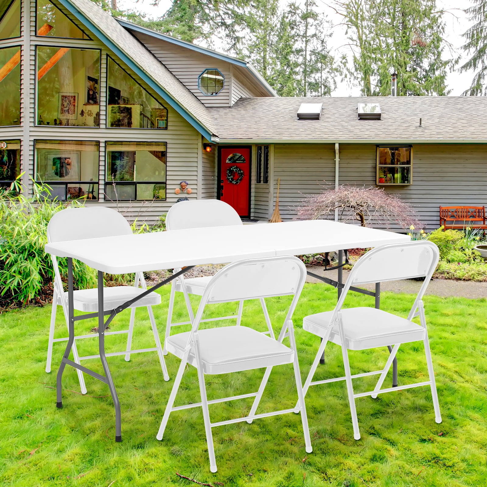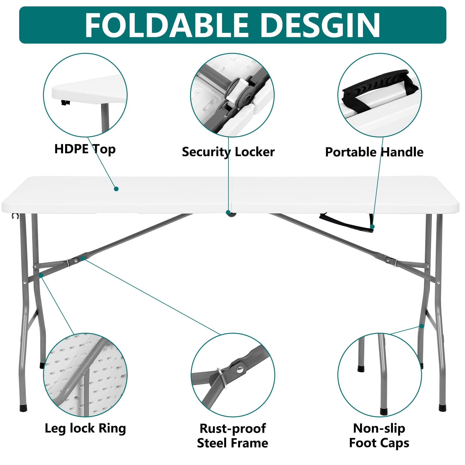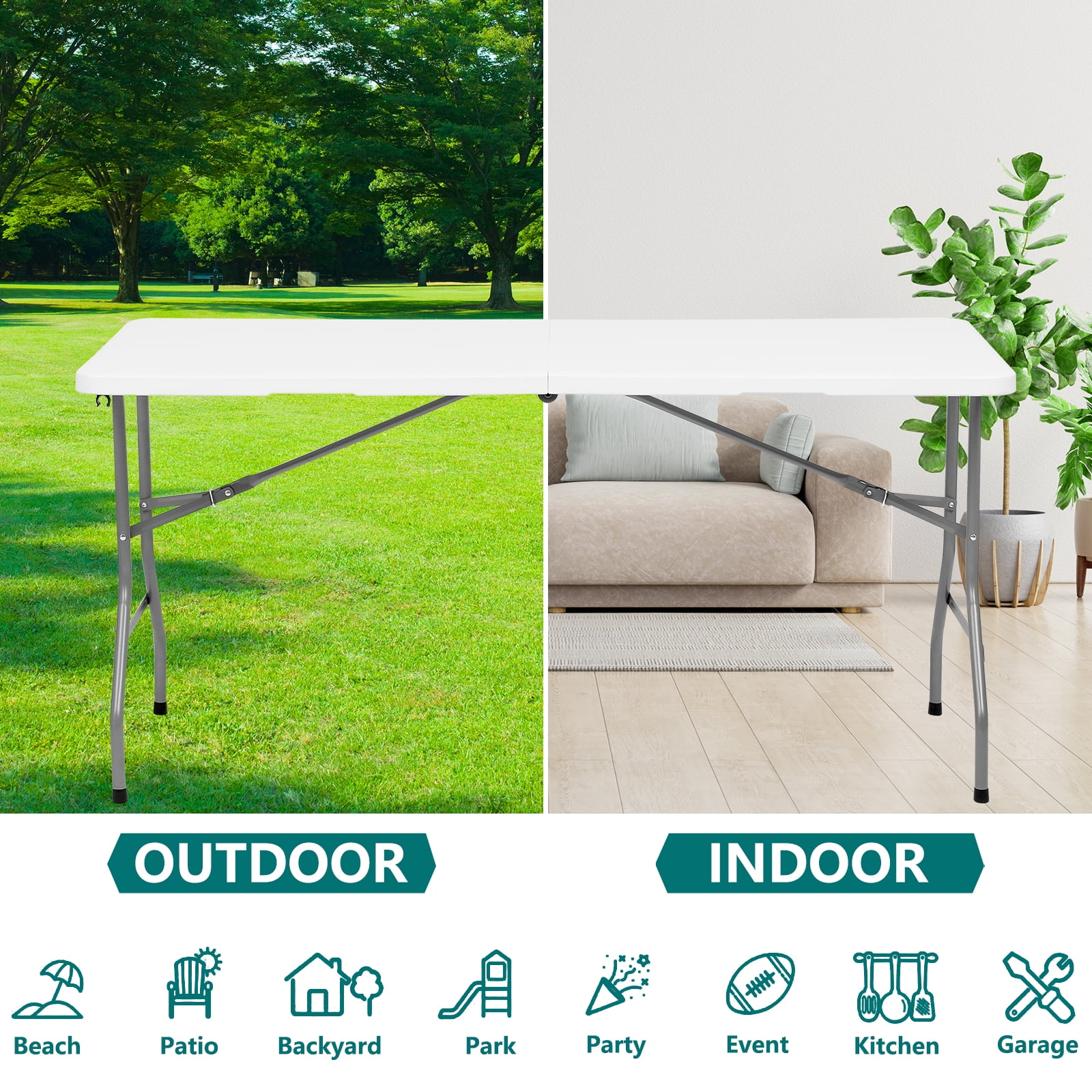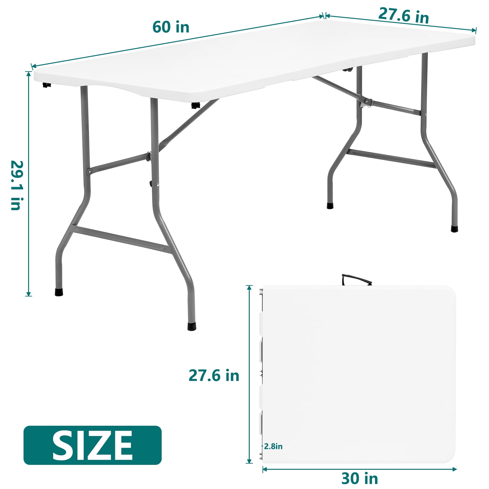 Unmatched Durability for Every Occasion: Discover unparalleled strength with our 5 ft folding table, meticulously engineered from premium HDPE and sturdy steel legs. This folding table not only withstands the rigors of use but also features a waterproof, scratch-resistant surface and floor-protecting foot caps. It’s the perfect choice for both outdoor and indoor settings. Versatile Design for Multifaceted Use: Our folding table seamlessly transitions from an outdoor picnic companion to an essential indoor utility table for parties, BBQs, game nights, or as a functional study desk. The adaptability of this foldable table makes it a must-have for every occasion. Convenience at Its Best: Designed for effortless portability and storage, this folding tables 5ft model boasts a compact, foldable frame with built-in handles. The lightweight yet durable construction ensures that carrying and storing your folding table is hassle-free. Effortless Setup and Takedown: Featuring a self-locking arch leg design, our 5 foot folding table promises a quick, easy setup and breakdown without compromising knee space. This thoughtful design means you can enjoy the convenience of a folding table with minimal effort. Ready to Use with No Fuss: Our folding tables arrive ready for action right out of the box. Unfold, secure the legs, and your folding table is set to support up to 300 lbs, offering both stability and reliability with dimensions of 60″(L) x 27.6″(W) x 29.1″(H).