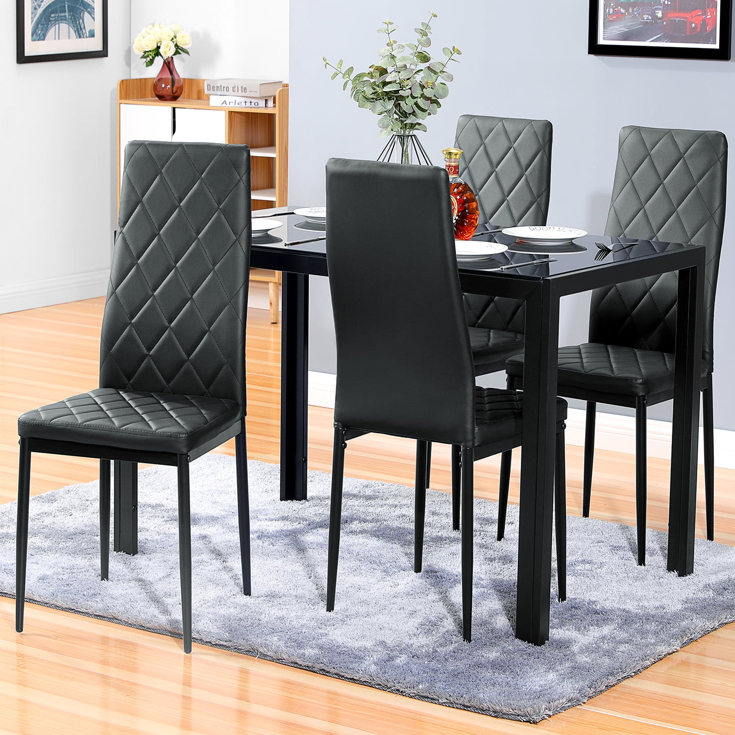 HONGGE 5 Piece Kitchen Dining Table Set with 4 High BackLeather Chairs and Iron Frame Glass Table for Breakfast Dining Room Kitchen Furniture, Black