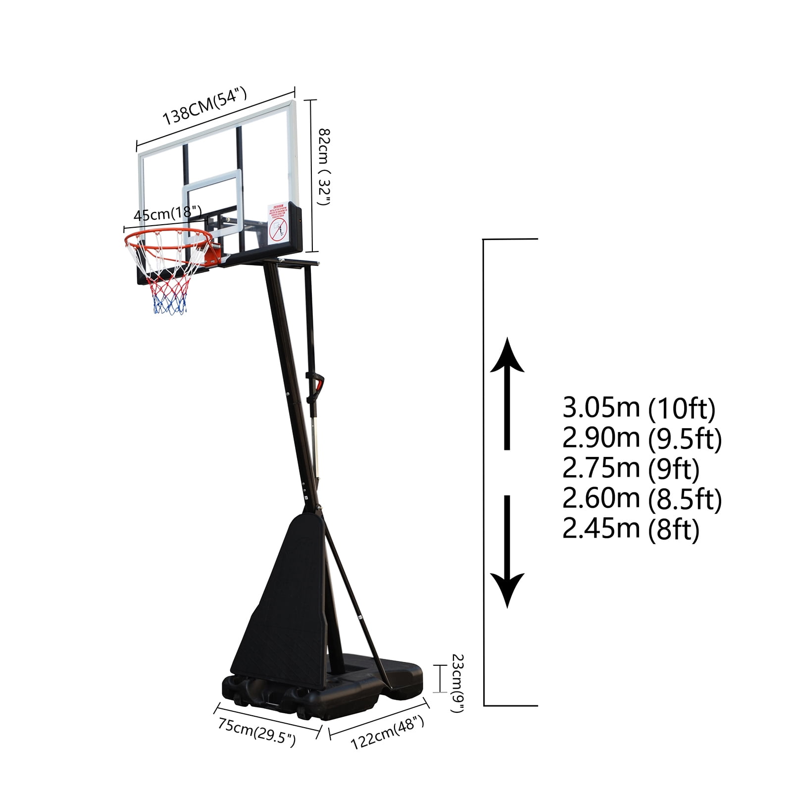 One-Button Height Adjustment (7.5-10 Feet): This basketball hoop features a versatile height range, adjustable from 4.8 feet to 10 feet. Ideal for high-intensity games, training, and family activities, this hoop is perfect for sports events and school games with friends and family. Durable Shockproof and Sturdy Design: The shockproof rim, designed to accommodate standard size 7 basketballs, is constructed from 16mm thick Q195 steel. The 54-inch high-strength, windproof PC transparent backboard is built to withstand impact, preventing damage and breakage when performing dunks. The all-weather nylon mesh is suitable for use throughout all seasons. Portable and Easy to Move Between Locations: Equipped with two built-in front wheels, this basketball hoop is easy to transport and can be used in a variety of settings, such as your yard, pool, beach, playground, or living room. Sturdy enough to grow with your child, this hoop offers an ideal playing environment. It’s also perfect for hosting pool basketball parties or adding fun to family gatherings and enjoying summer activities. Stable Base and Structure for Safety: The high-strength PE base has a large capacity and can be filled with up to 48 kg of water to ensure stability. It can also support the weight of sandbags. The triangular structure of the pole and base enhances safety, reducing the risk of tipping over and ensuring the hoop remains stable during play. Easy Assembly & After-Sales Support: Assembly is quick and straightforward, taking no more than 120 minutes with the provided instruction manual. If you require any assistance or replacement parts, our 24-hour customer service team is available to assist you, ensuring a hassle-free experience.