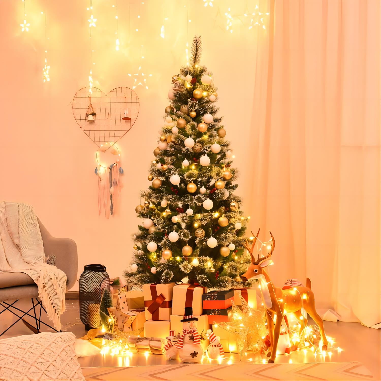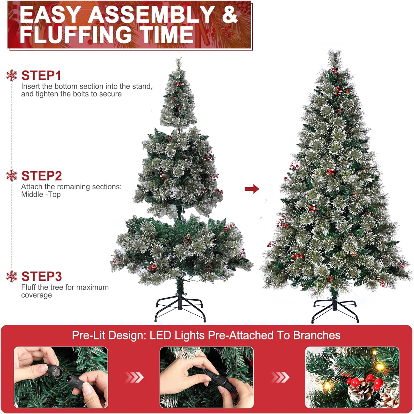 Pre-Lit with 250 LED Lights: The 6.5ft Glittering Frost Pine Tree comes pre-lit with 250 energy-efficient LED lights, providing a beautiful, warm glow for your holiday celebrations. The lights are strategically placed to create a sparkling, festive atmosphere without the hassle of stringing individual lights. Glittering Frosted Branches: This tree features beautifully frosted branches with a touch of glitter, mimicking the shimmer of freshly fallen snow. The sparkling finish adds an extra layer of elegance and festive cheer, bringing a winter wonderland feel to your home or office during the holiday season. Full & Lush Design: With over 609 branch tips, this tree offers a full, lifelike appearance. The dense branches allow for a luxurious display, providing ample space for your favorite ornaments, garlands, and tree toppers. It’s perfect for creating a striking and personalized holiday centerpiece. Easy Assembly & Storage: Designed for convenience, this pre-lit tree features hinged branches that fold out easily for quick assembly. Once the holiday season is over, the tree can be disassembled and stored compactly, saving space and ensuring it stays in great condition for future use. Durable Metal Stand: The tree is supported by a sturdy, durable metal stand, ensuring stability and security throughout the holiday season. Whether you’re decorating with heavy ornaments or a star topper, you can trust that this tree will remain upright, even in high-traffic areas or homes with pets and children.