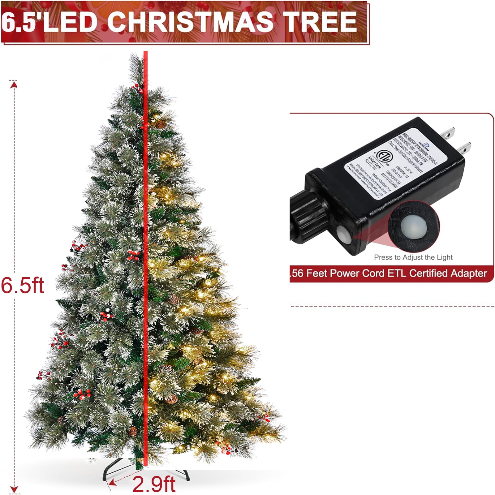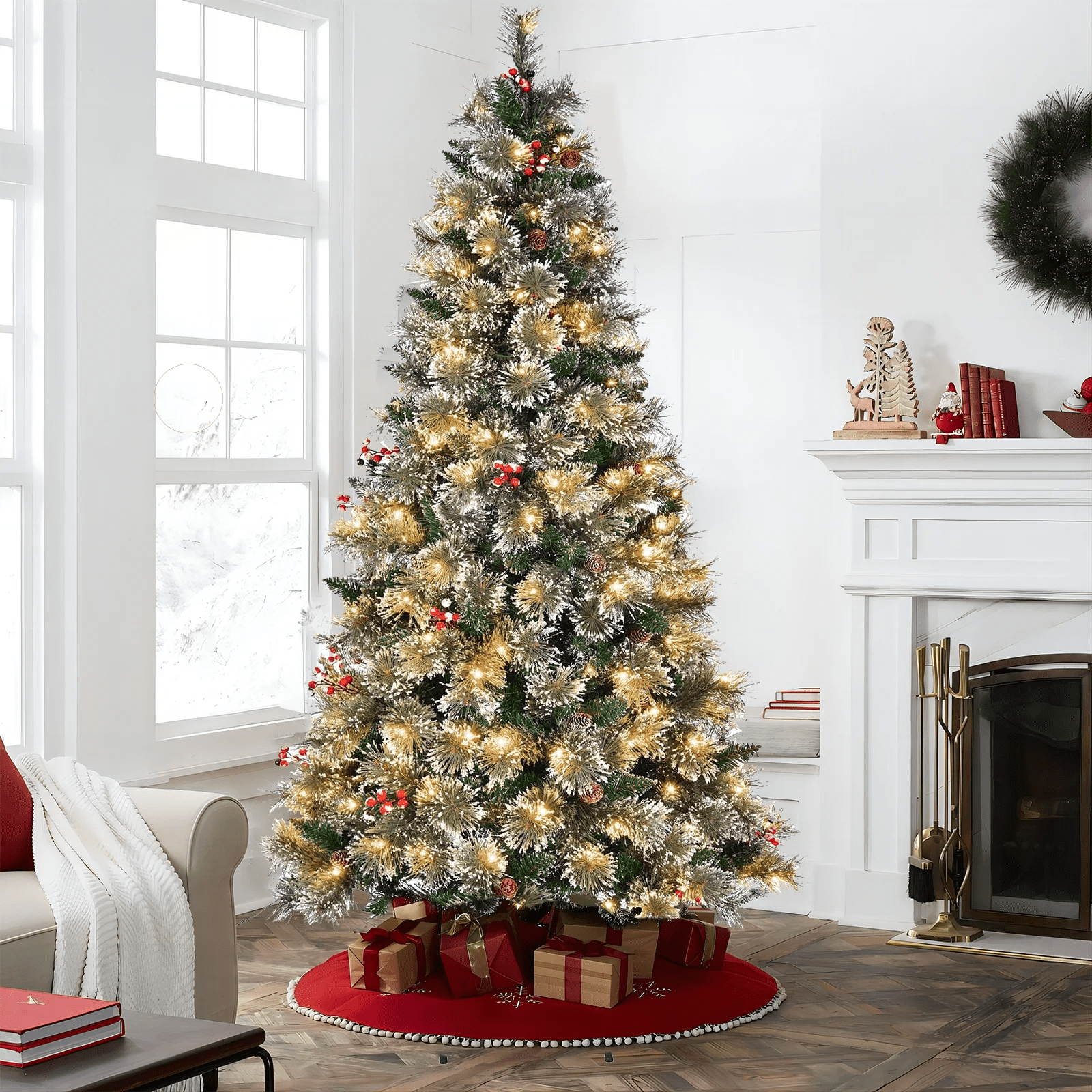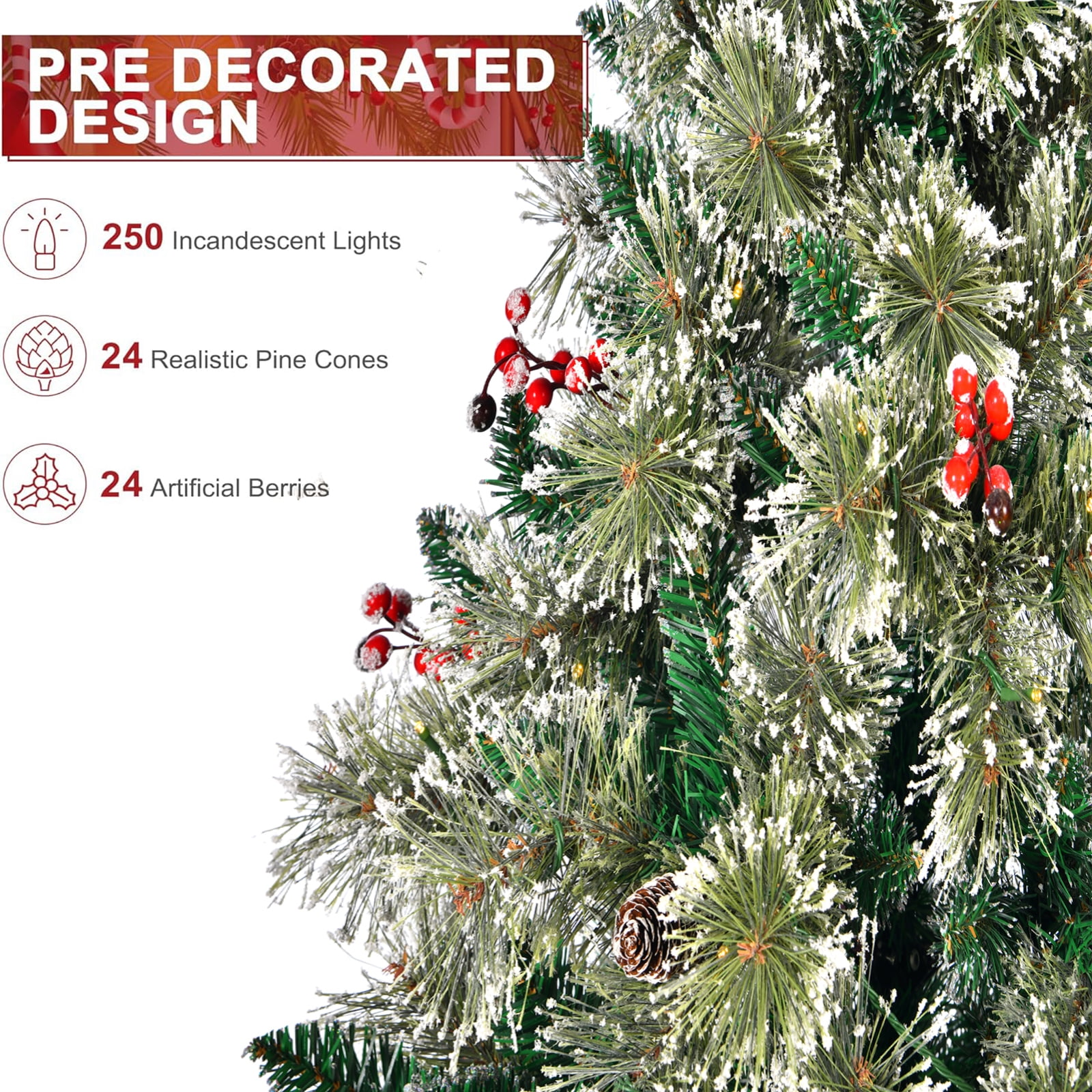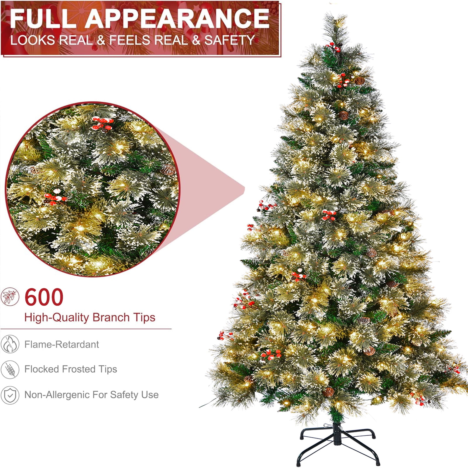 It also boasts an eye-catching design, blending beautiful colors and Christmas elements perfectly. Whether for decoration or as a standalone piece, this tree stands at 6.5 feet tall and measures 37 inches in diameter, making it suitable for living rooms, dens, and various other locations to usher in the holiday spirit. With 609 white and glitter-frosted branch tips, 24 natural pine cones, and 24 artificial red berries, it achieves an authentic look that shines wherever it’s placed, thanks to its rich green needles and 250 warm white LED lights. This delightful holiday tree inspires Christmas cheer in everyone and includes a sturdy metal tree stand for reliable support. If you are looking for a product like that, do not hesitate to buy it! Flourishing design with full-bodied shape and ultra lush branch tips Convenient hinged sections for easy assembly and disassembly The sturdy iron base for higher stability, foldable for space-saving storage 100% New PVC material, with vivid color for a beautiful look, odor-free for increased safety Excellent durability, for enjoyment years after years Snow flocked needles create a wintry feeling, while red berries add a lifelike sense To decorate the room full of festive effect and Christmas spirit