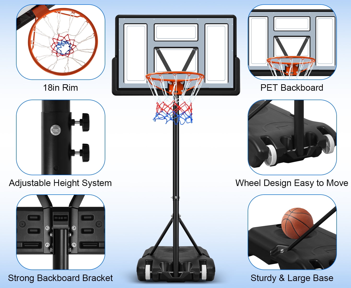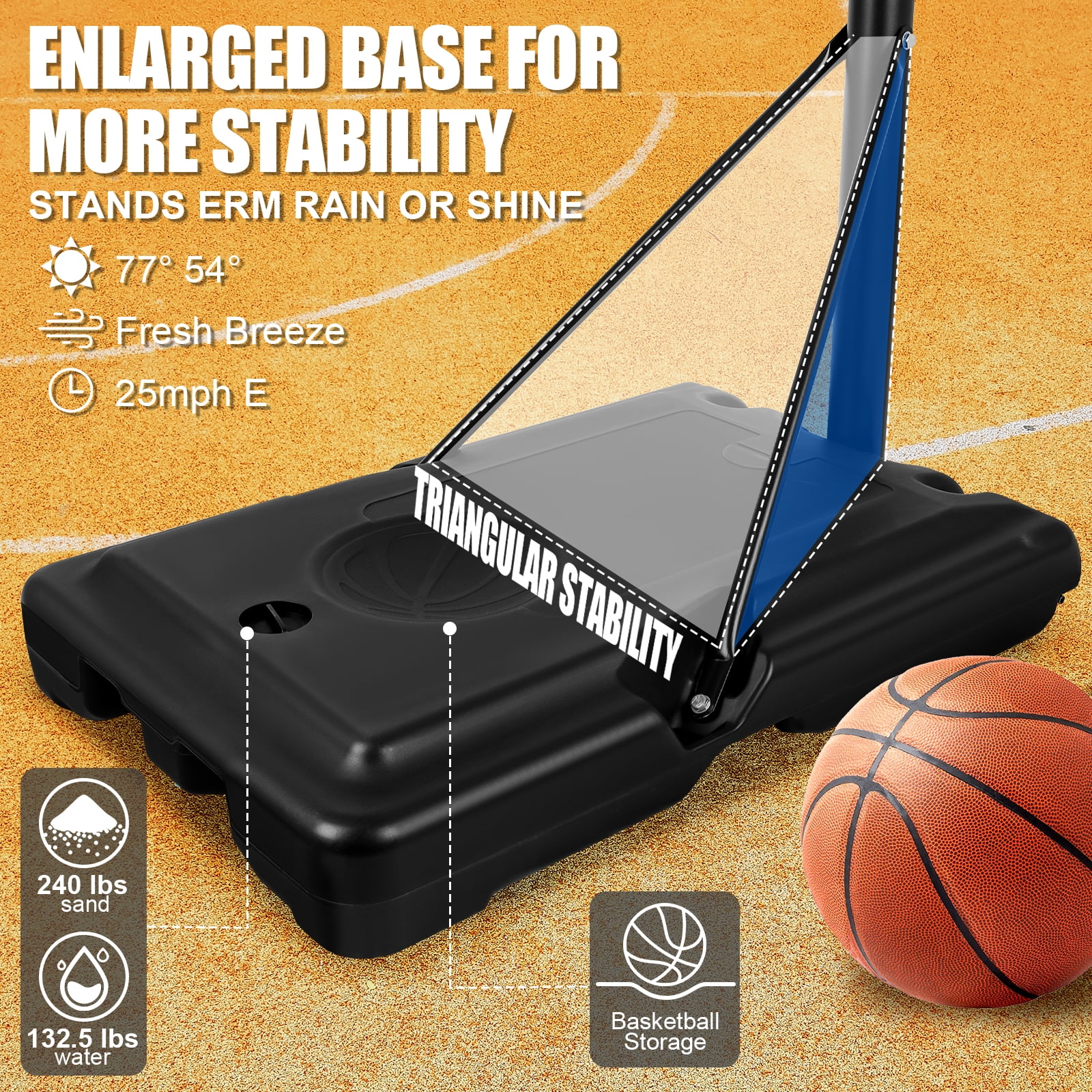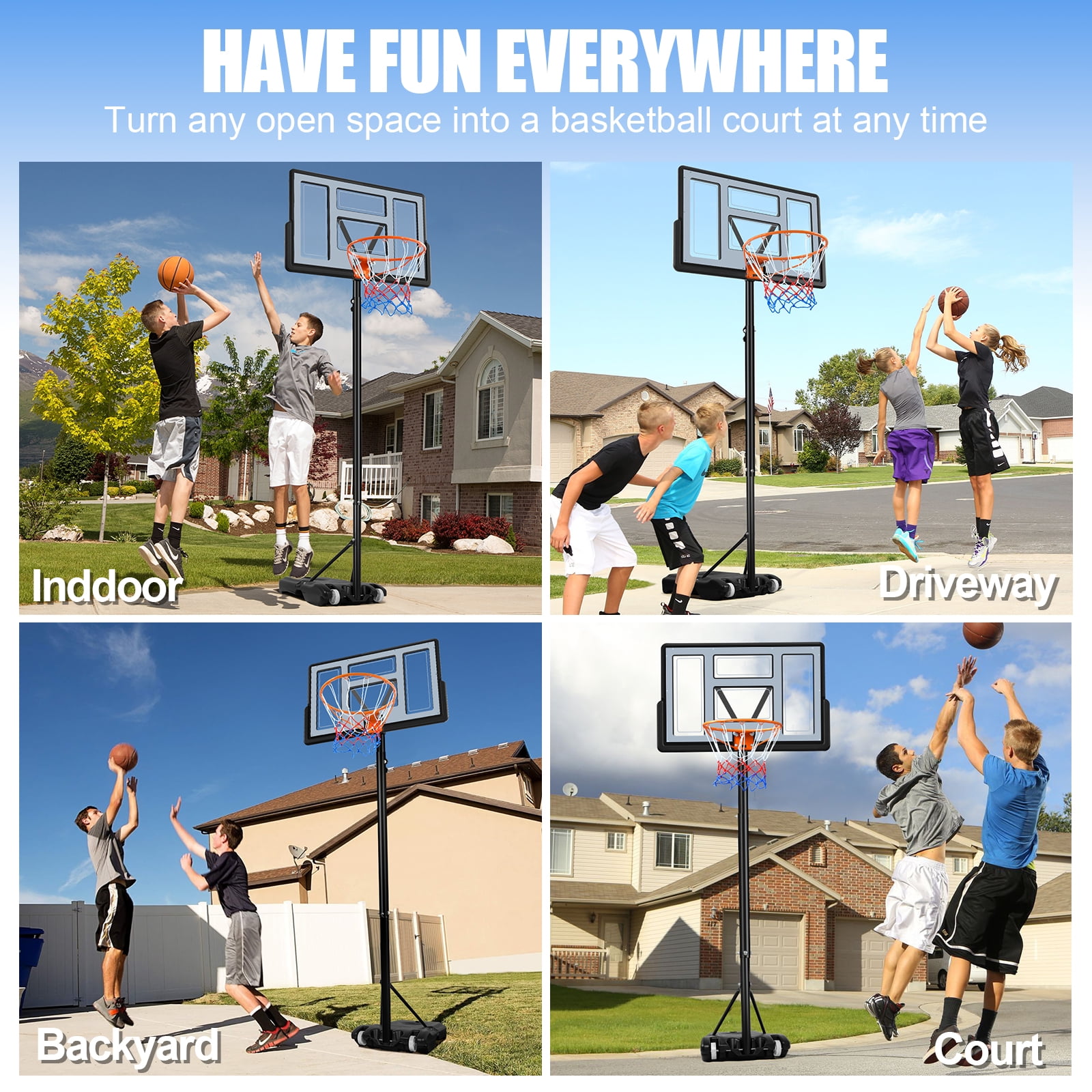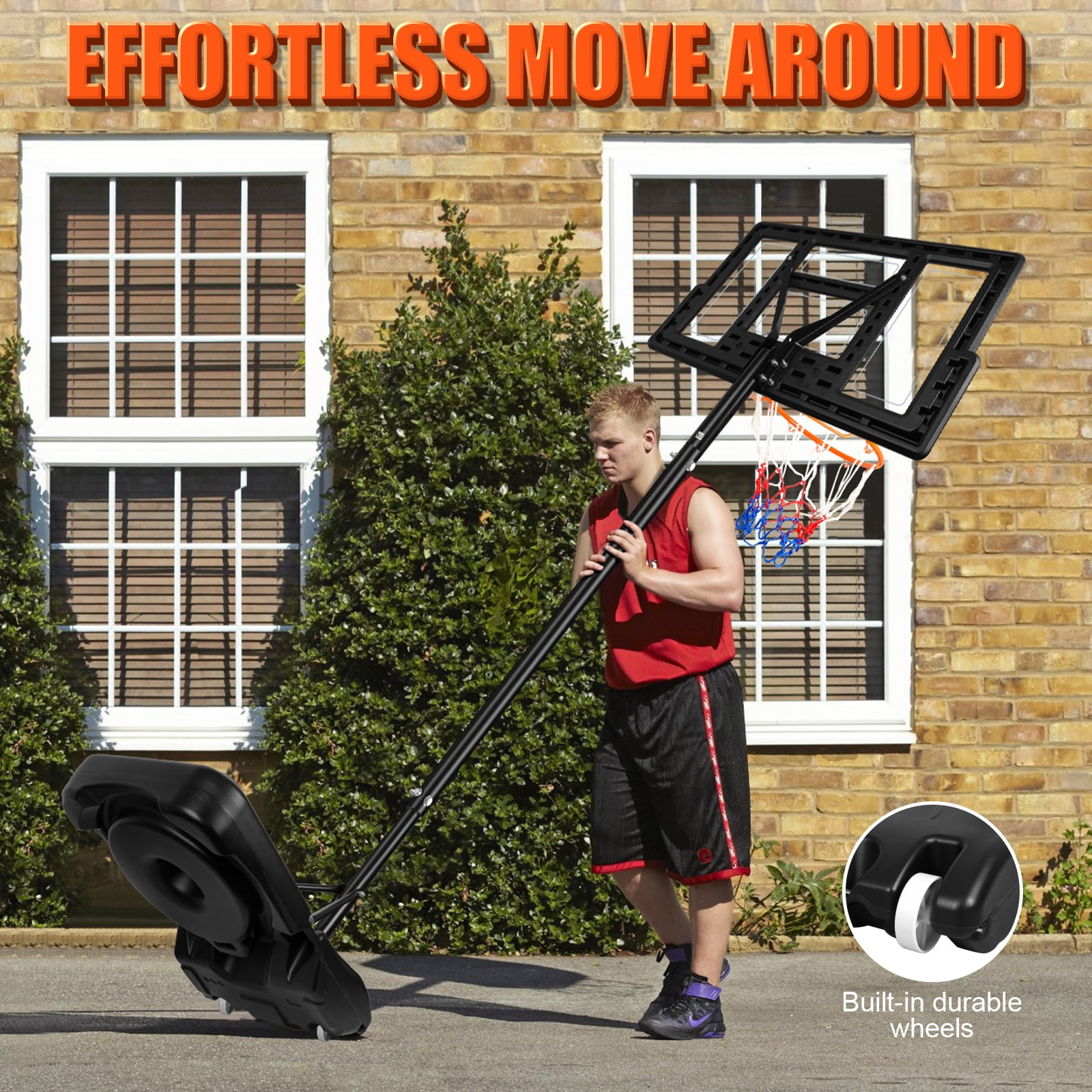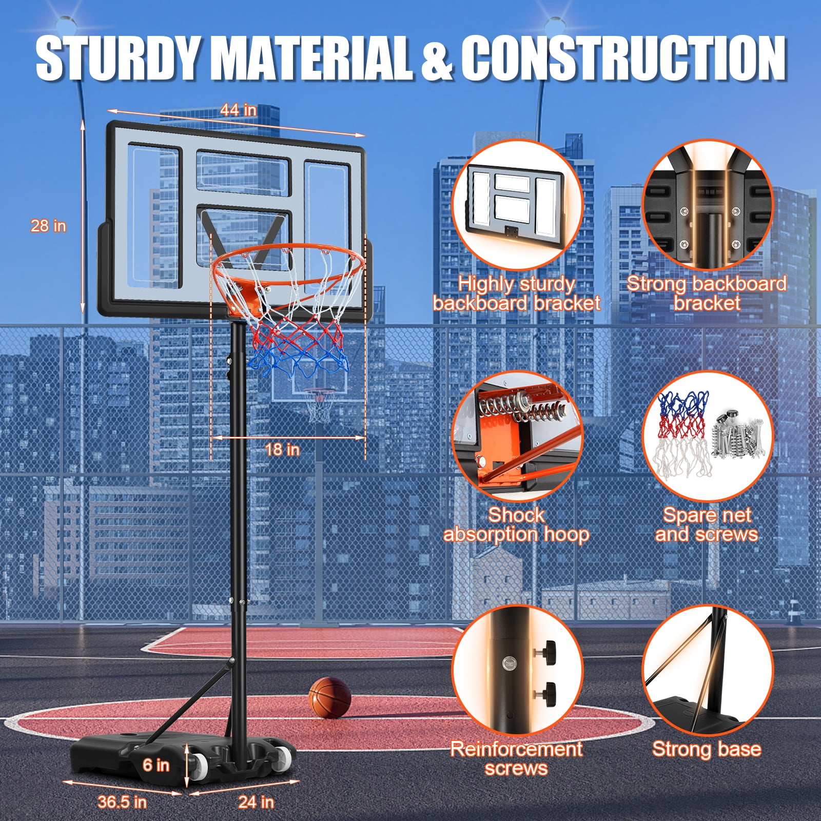Adjustable Height: This portable basketball hoop system features an adjustable height range from 5.7 to 10 feet, making it suitable for kids, teens, and adults. It offers easy customization to accommodate players of all ages and skill levels for a fun and versatile experience. Durable 44-Inch Backboard: The 44-inch backboard is made of durable materials, providing excellent rebound and resilience for both casual and competitive play. Its strong design ensures long-lasting use, even with regular outdoor exposure. Portable & Easy to Move: Equipped with a sturdy base that can be filled with water or sand for stability, this hoop is easy to move and set up in different locations. Its portability makes it perfect for the driveway, backyard, or park, giving you flexibility in where to play. Weather-Resistant Frame: Built with a weather-resistant frame, this basketball hoop can withstand outdoor conditions such as sun, rain, or wind. It is designed to provide reliable performance and durability throughout the year, making it ideal for all seasons. Quick Assembly & Safe Play: The hoop system is easy to assemble with clear instructions, ensuring a hassle-free setup. The stable base and sturdy construction offer safety and support during play, allowing for secure shots, dunks, and rebounds.
