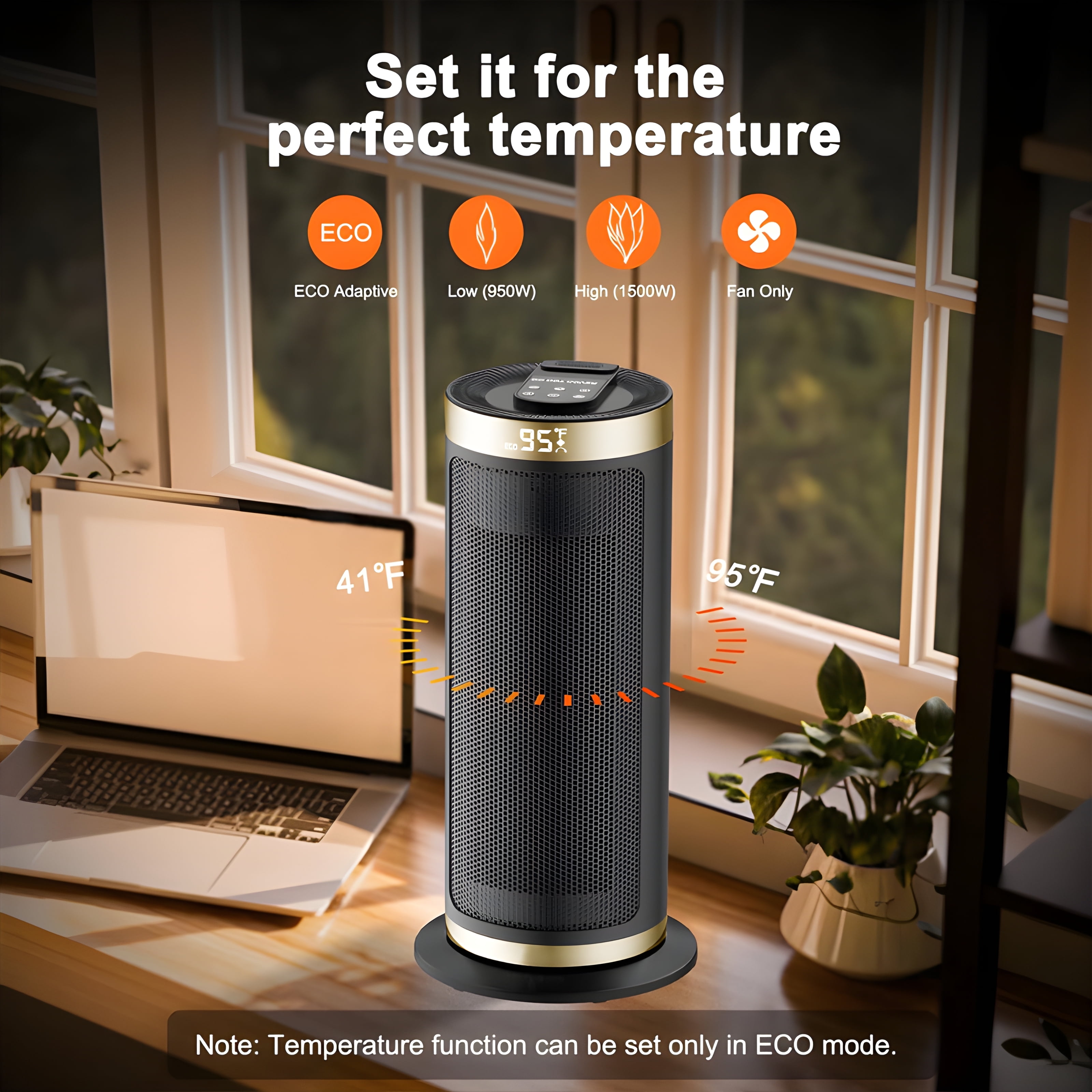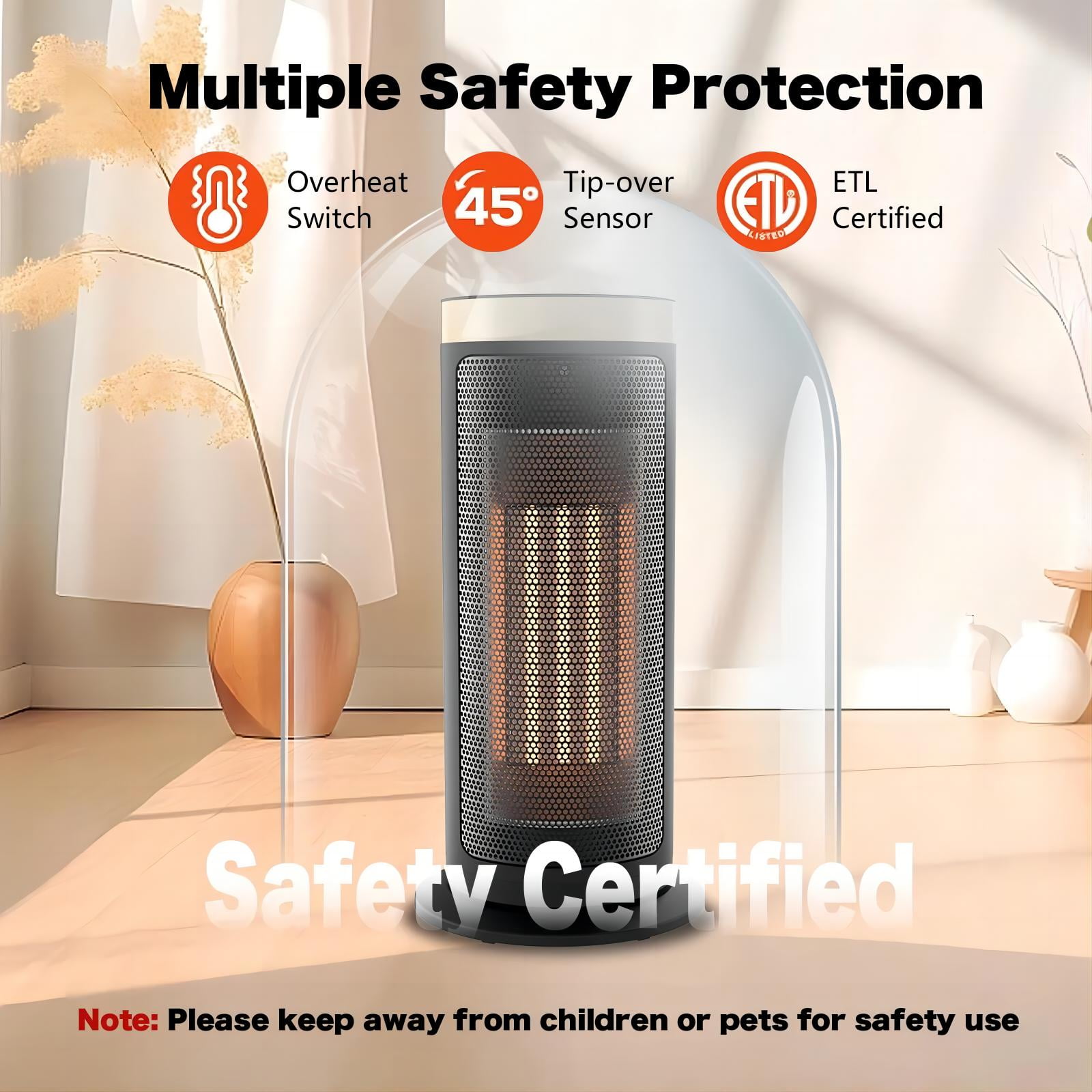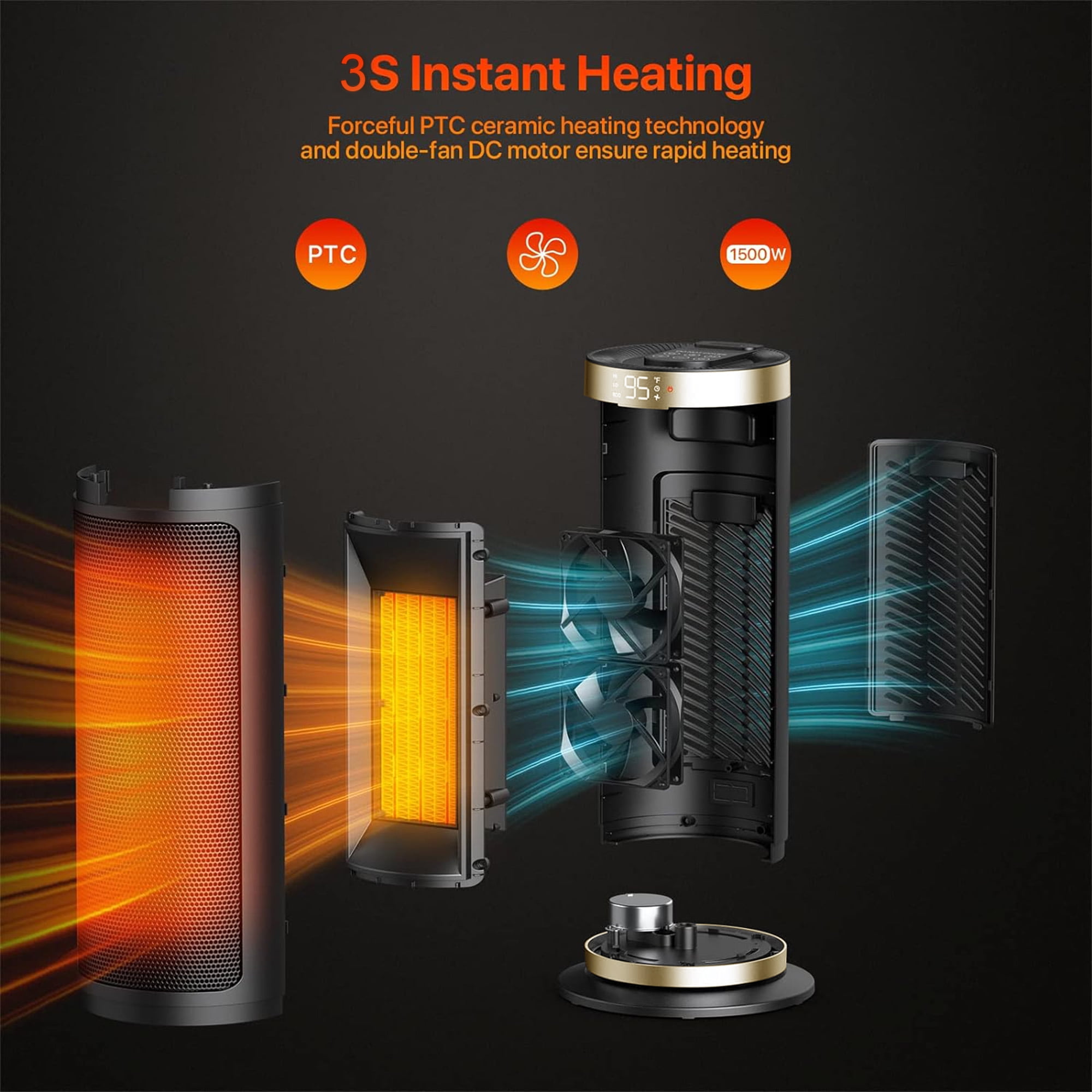 Personalized Warmth Comfort: This electric heater offers various settings, including a fan-only mode and three heating options (high, low, and eco-adaptive mode) with an adjustable thermostat to control temperature levels. The portable electric heater provides output capacities ranging from 950 watts to 1500 watts, and its built-in precise temperature sensor enables the ECO mode to automatically conserve energy while maintaining a consistent room temperature. Usage Comfort: The heater features a 90° widespread oscillation function to evenly distribute heat throughout your room. It’s easy to move with a hidden carrying handle on the back and operates quietly with a noise level as low as 40dB, making it suitable for indoor activities like sleeping, reading, and working. The large room heater has a user-friendly touchscreen UI on top and a digital display on the front for easy control, and it comes with a remote control for added convenience. ETL-Certified Safety: Made of V0 flame-retardant materials with multiple safety features including built-in smart tip-over protection, overheat protection, 12-hour timer, 24-hour automatic power off without interaction, V0 flame retardant 2-prong plug, and sturdy 6ft long flat power cord. LIGHTWEIGHT, PORTABLE DESIGN: Design with a carry-handle, this heating appliance is easy to move from room to room. With removable dust filter, easy to clean, you can enjoy comfortable warmth without any worries!