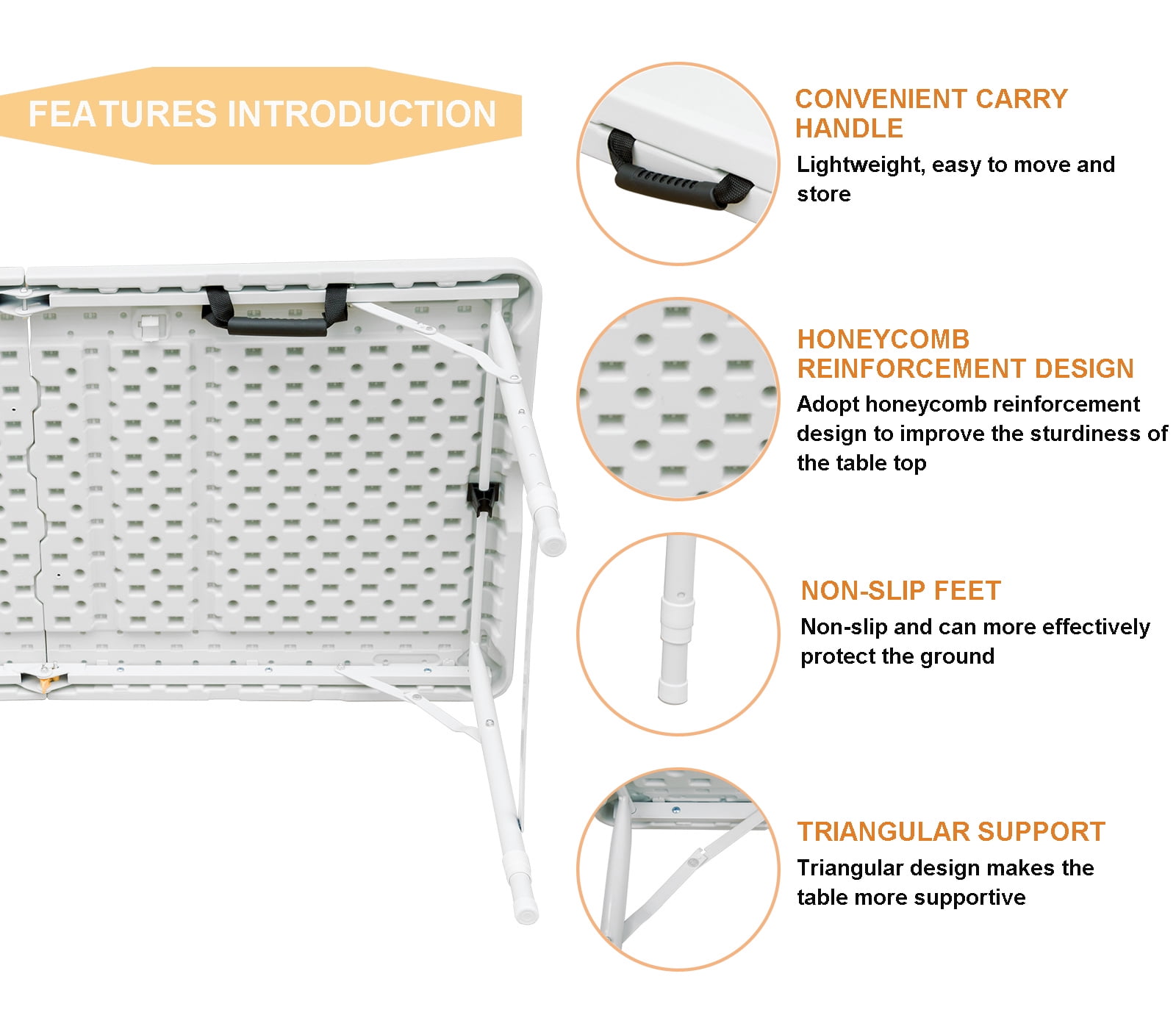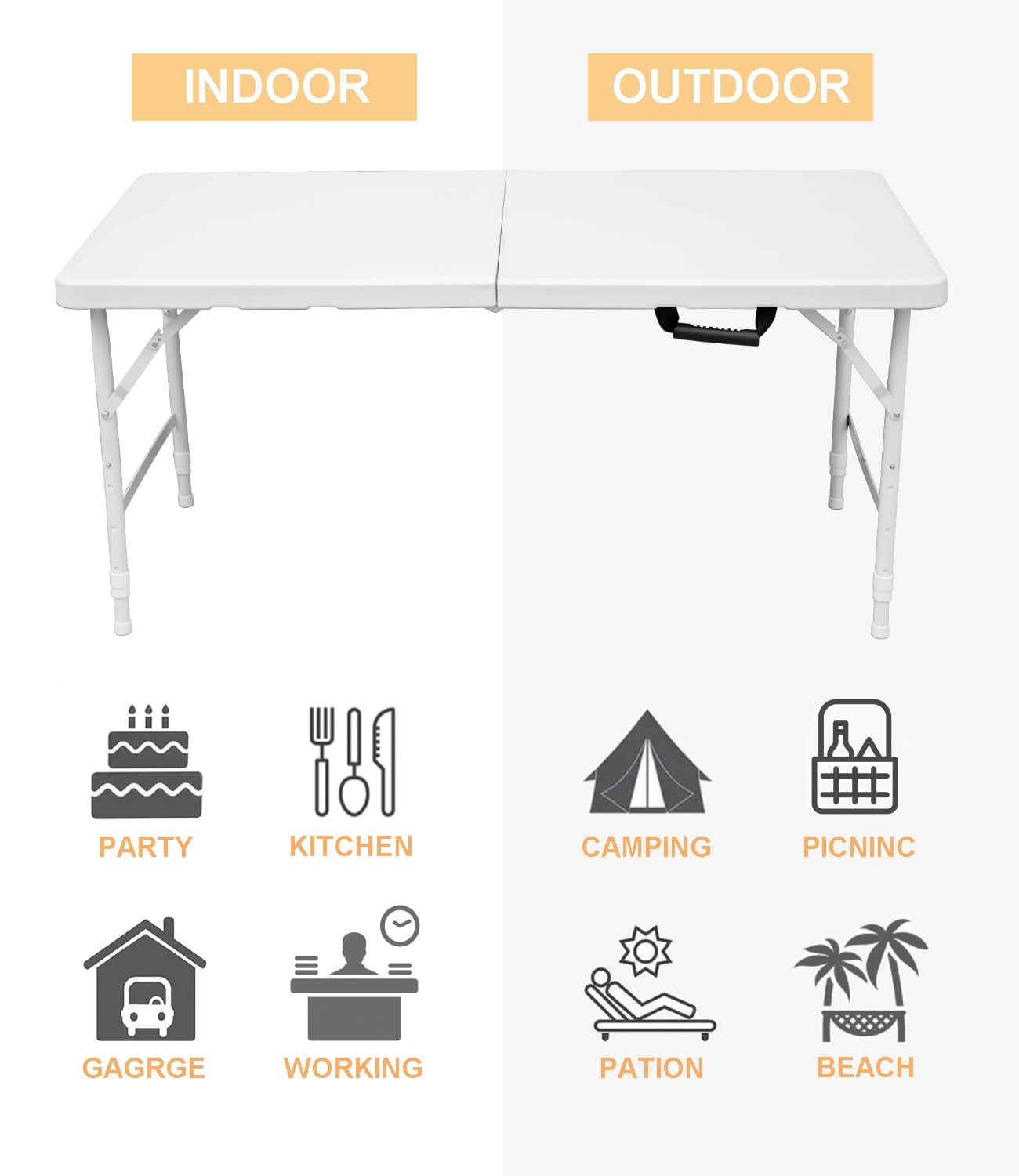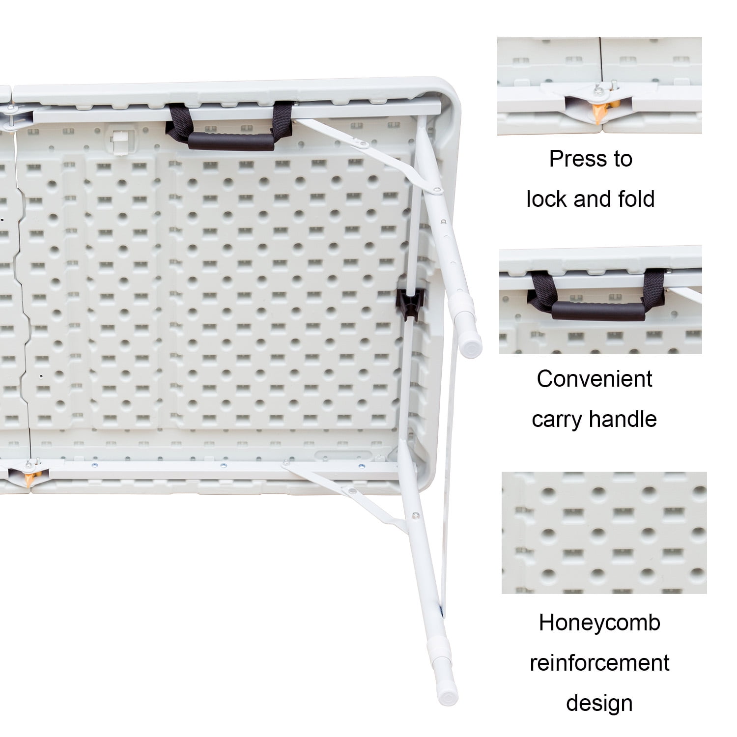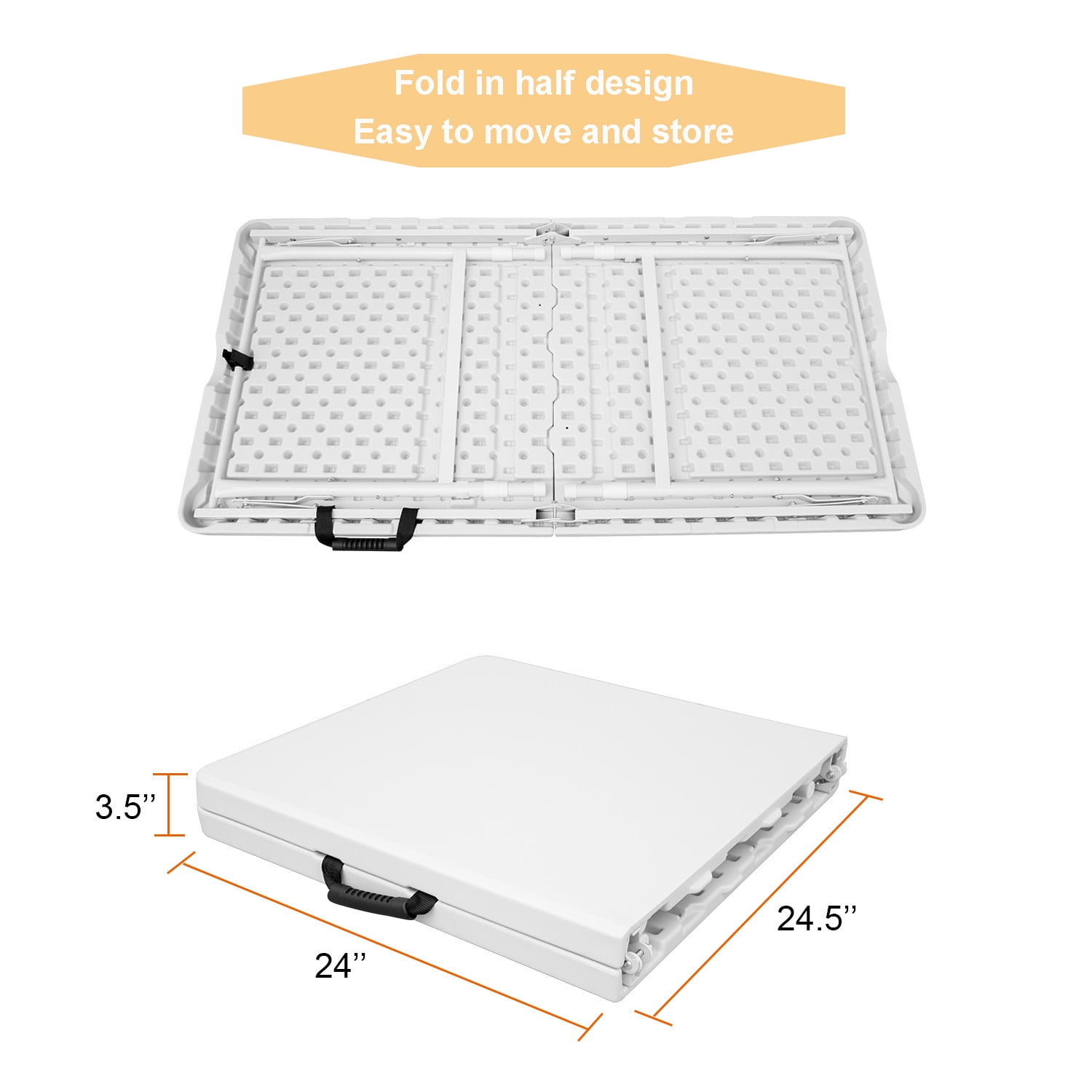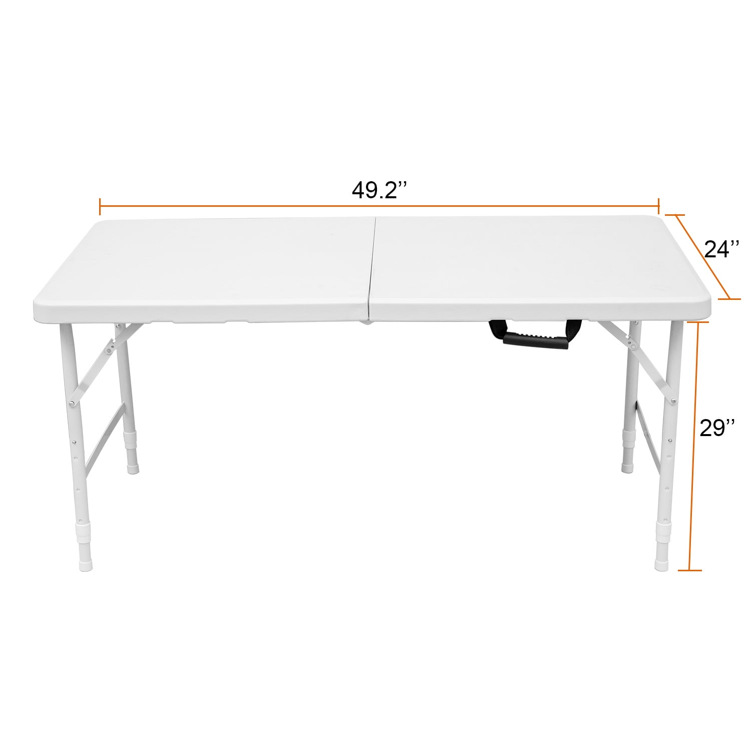 Constructed of high-density polyethylene plastic and gray powder-coated steel tube of 1 mm inner wall, dia. 25 mm, superior strength and durability Three Flexible Height satisfies different needs; Backside honeycomb reinforcement design to enhance the pressure; Anti-skidding foot effectively protection of the floor. Light-weight and fold in half design with carry handle makes this table easy to move and store almost anywhere. Ideal for indoor and outdoor events like weddings, parties for festival, family gatherings, BBQ, even setting up a work station for home office, etc. No assemble needed, can be open and folded in a few seconds. Dimensions (Open):49”x 24” × 29”; Dimensions (Folded): 24” x24” x 4” Package dimensions: 26” X4” X28” UnitWeigh:8.5kg Color:white