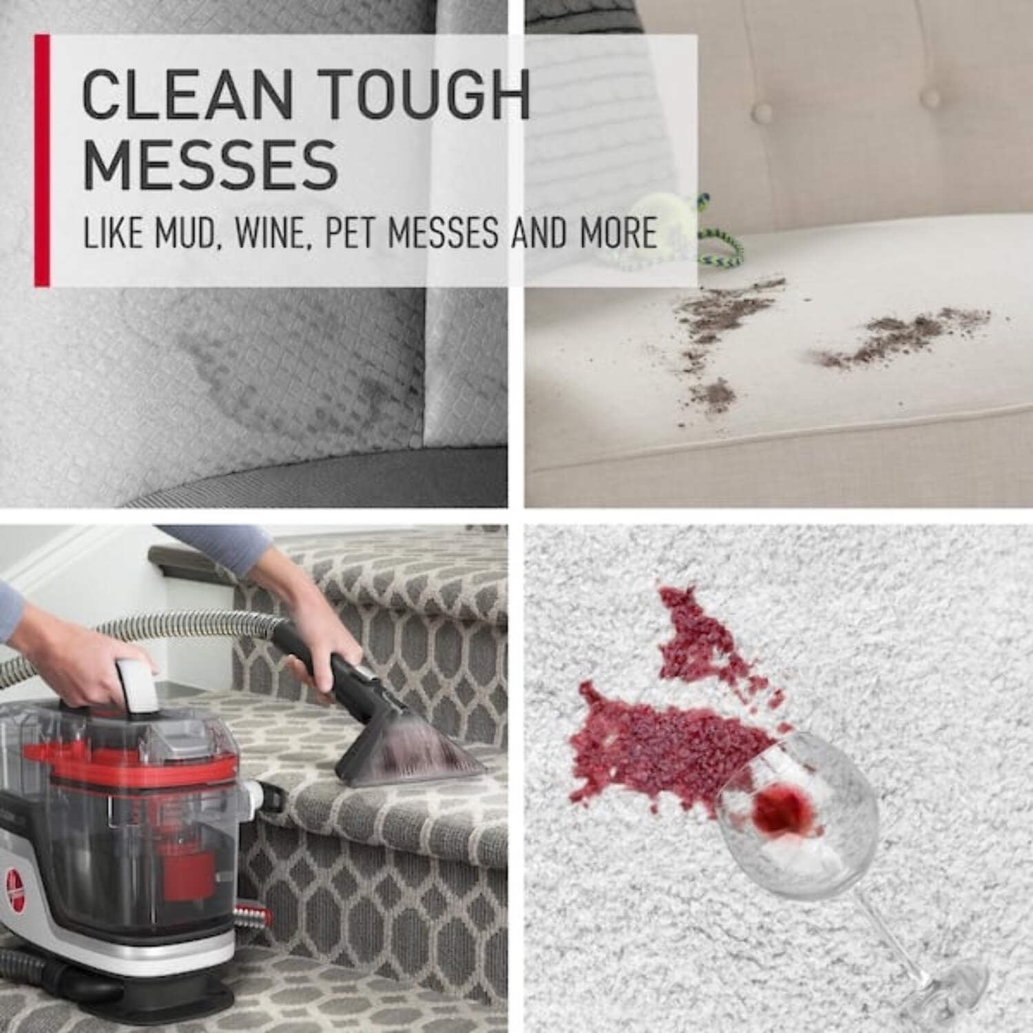 Hoover CleanSlate Pet Carpet & Upholstery Spot Cleaner POWERFUL SUCTION: Powerful suction for life size spots and stains TOOLS FOR EVERY MESS: You’ve got the tools for every mess with the 7” WidePath Tool for large areas like stairs and the TightSpot Tool for crevices and tough to reach areas PERMANENT STAIN REMOVAL: Permanently remove pet stains and eliminate odors. QUICK AND PORTABLE: Quickly remove spills, stains, and set-in messes with the portable CleanSlate that offers powerful suction and the tools you need for any job, large or small TYPES OF MESSES: Clean tough messes like mud, wine, pet messes and more from carpets and upholstery HOSE RINSE: Easy to clean, the Hose Rinse Tool flushes the machine with water to remove any left behind dirt and debris DUAL TANKS: The Dual Tank System has 40oz clean solution capacity so you can clean farther while clean water and dirty water stay separate BONUS PET TOOL AND WHAT’S INCLUDED: 18ft. Cord, WidePath Tool with Bristles Insert and Rubber Nub Insert, BONUS Small Area Tool with Bristles Insert, Tight Spot Tool, Hose Rinse Tool, Pet Tool, BONUS Accessory Bag, and 6oz Oxy Concentrate POWERFUL SUCTION: Powerful suction for life size spots and stains TOOLS FOR EVERY MESS: You’ve got the tools for every mess with the 7” WidePath Tool for large areas like stairs and the TightSpot Tool for crevices and tough to reach areas PERMANENT STAIN REMOVAL: Permanently remove pet stains and eliminate odors. QUICK AND PORTABLE: Quickly remove spills, stains, and set-in messes with the portable CleanSlate that offers powerful suction and the tools you need for any job, large or small TYPES OF MESSES: Clean tough messes like mud, wine, pet messes and more from carpets and upholstery HOSE RINSE: Easy to clean, the Hose Rinse Tool flushes the machine with water to remove any left behind dirt and debris DUAL TANKS: The Dual Tank System has 40oz clean solution capacity so you can clean farther while clean water and dirty water stay separate BONUS PET TOOL AND WHAT’S INCLUDED: 18ft. Cord, WidePath Tool with Bristles Insert and Rubber Nub Insert, BONUS Small Area Tool with Bristles Insert, Tight Spot Tool, Hose Rinse Tool, Pet Tool, BONUS Accessory Bag, and 6oz Oxy Concentrate 2-year limited warranty