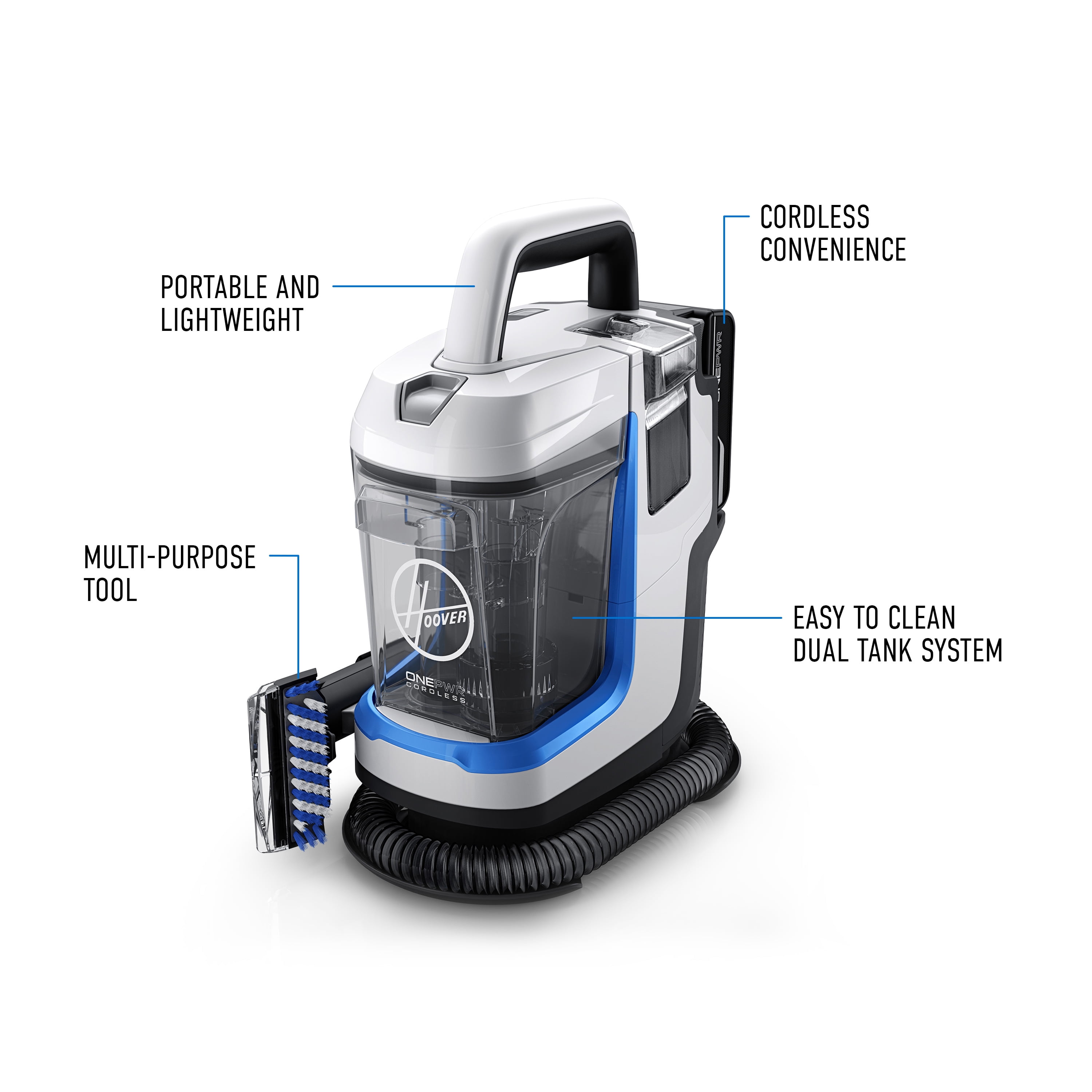 GRAB & GO: Portable spot cleaning to tackle accidents, spills, and pet messes without being tethered to a cord LIGHTWEIGHT & COMPACT: Makes it easy to clean stairs, upholstery and more, for easy convenient storge MULTI-PURPOSE PET TOOL: Scrubs and lifts away the toughest messes DUAL TANKS: Separate clean and dirty water so you can easily fill, empty, and rinse ONEPWR LITHIUM-ION: Battery for the fade-free power and run time to clean anywhere, anytime without being tethered to a cord ONEPWR SYSTEM: Every ONEPWR Battery works with every ONEPWR Product WHAT’S INCLUDED: 4-inch Scrubbing Tool, removable Hose, ONEPWR 2.0 Ah Lithium-Ion Battery, ONEPWR Charger, trial size carpet cleaner solution WARRANTY: 2-Year Limited Warranty